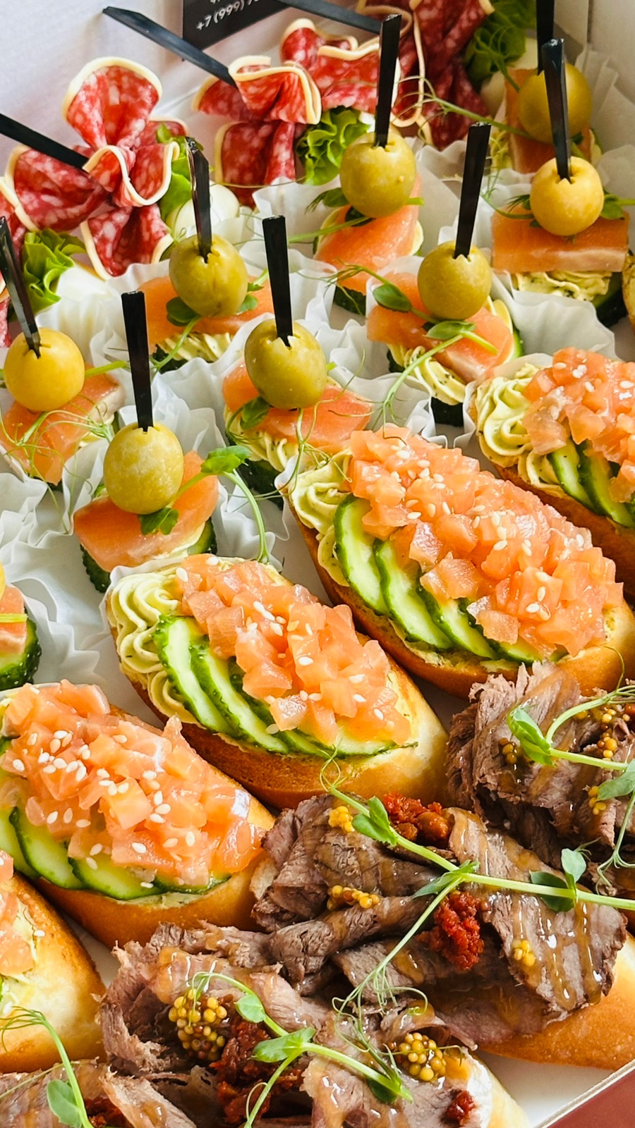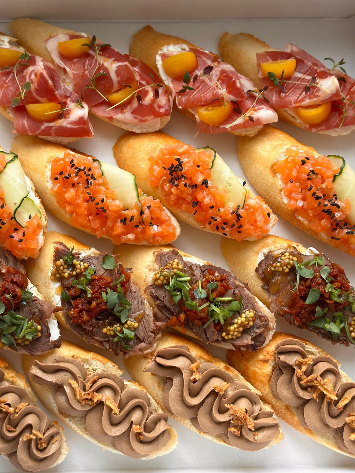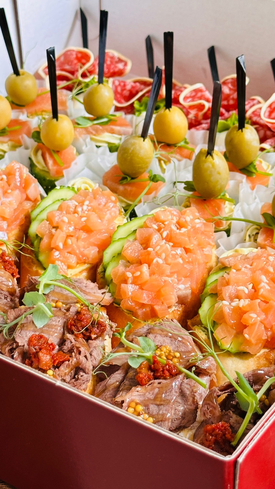 Салями с сырным шариком -6 шт; Канапе с огурчиком , форелью и оливкой-12 шт; Кростини с говядиной, выляными томатами и горчичкой- 6 шт; Кростини с форелью и огурчиком -6 шт.