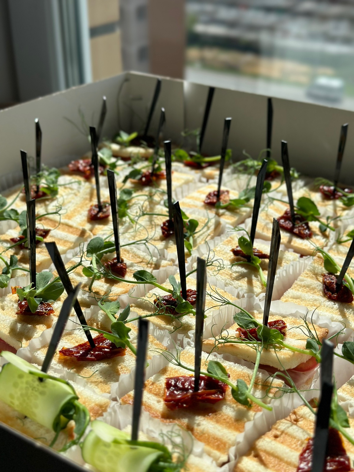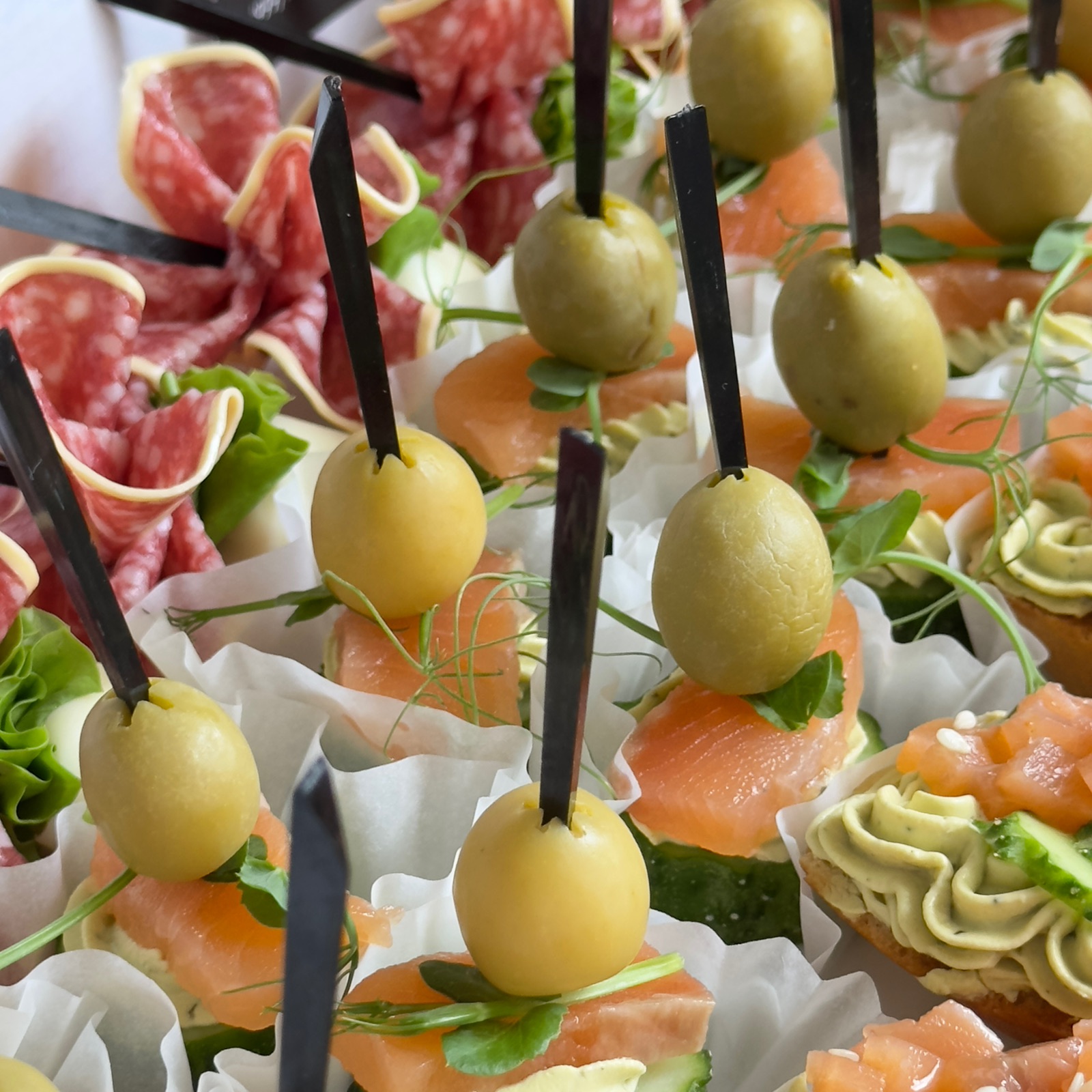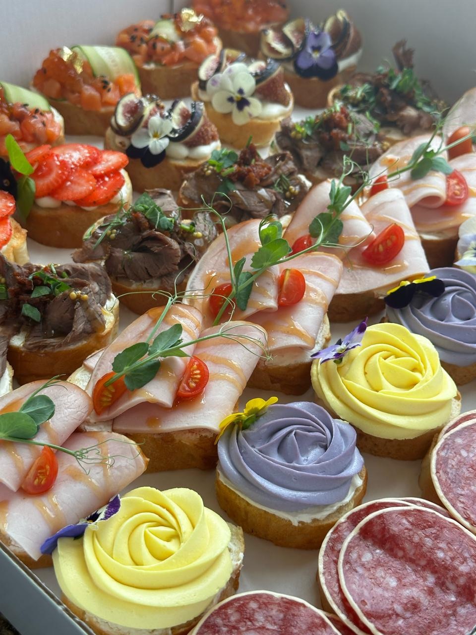 Салями с сырным шариком -6 шт; Канапе с огурчиком , форелью и оливкой-12 шт; Кростини с говядиной, выляными томатами и горчичкой- 6 шт; Кростини с форелью и огурчиком -6 шт.