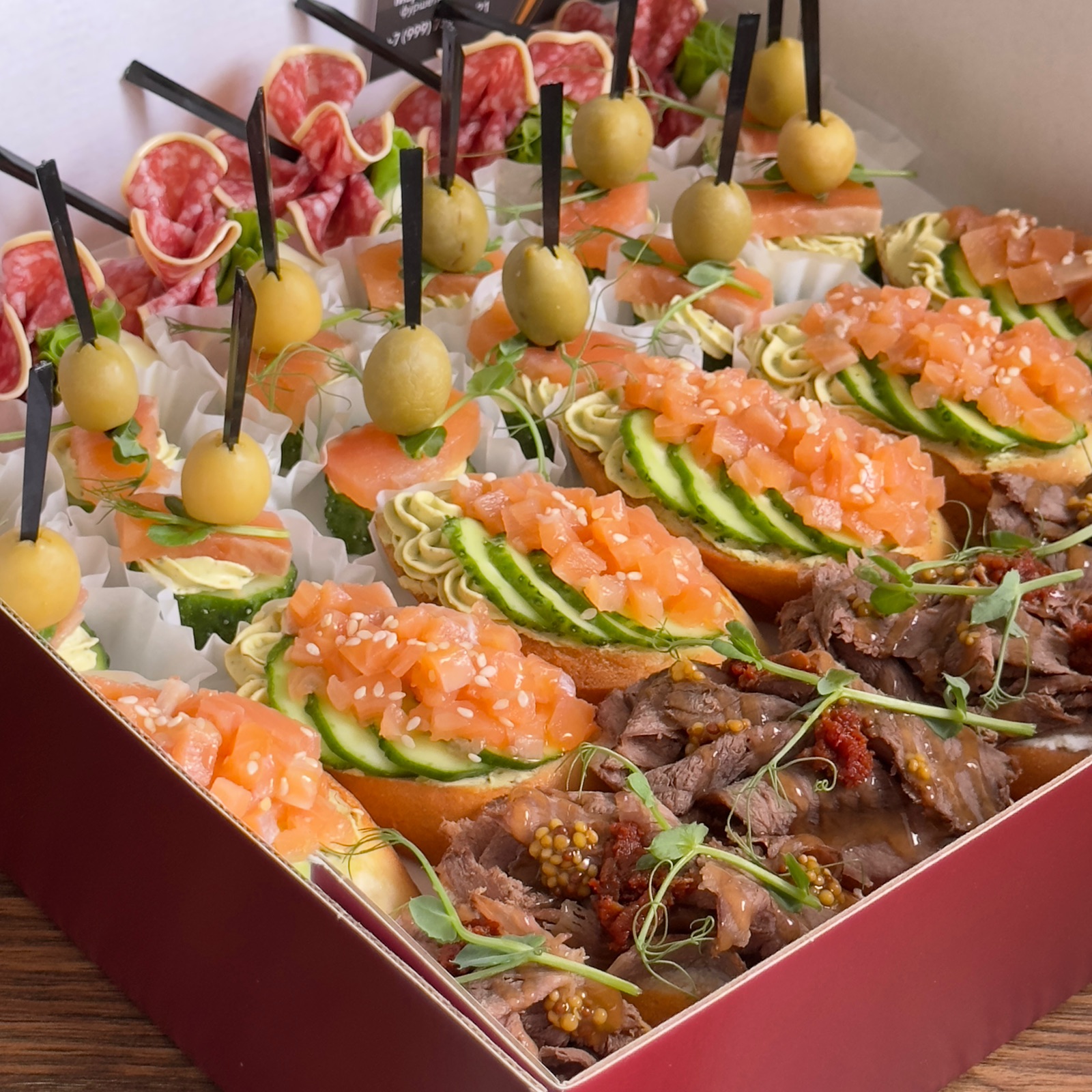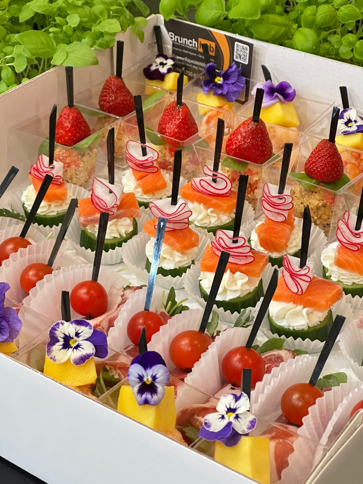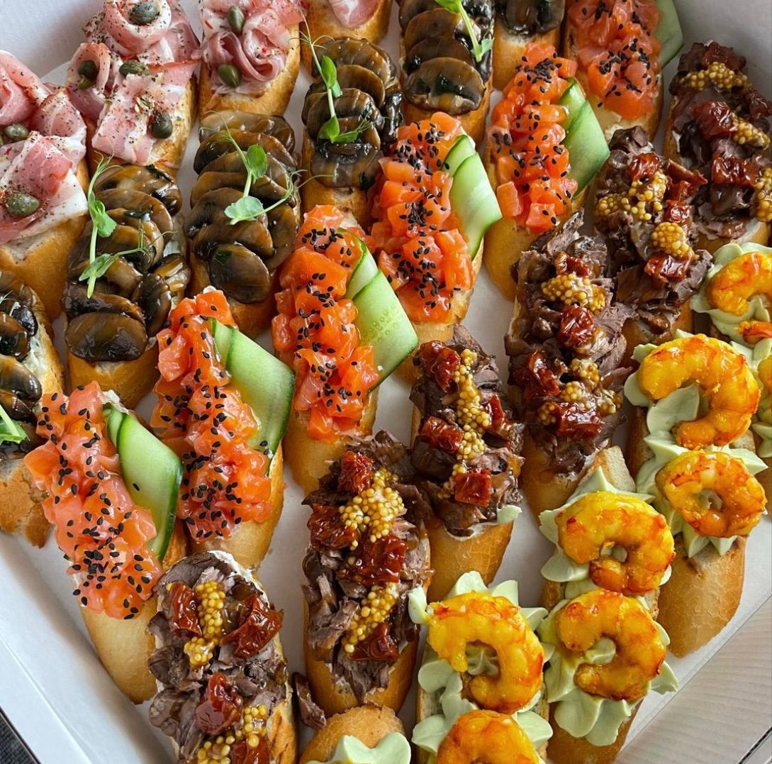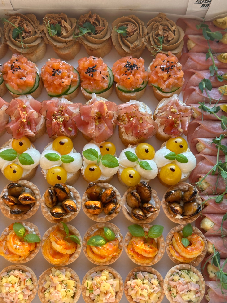 Брускетта с говядиной - 6 шт; Брускетта с форелью и огурчиком -6 шт; Канапе салями с сыром и перлине - 6 шт; Канапе огурчик с форелью и оливкой -7 шт; Кростини с аргентинскими креветками- 5 шт; Кростини с говядиной- 5 шт; Кростини с камамбером и сезонной ягодой или фруктом - 5 шт; Кростини с говядиной, вялеными томатами и горчичкой -5 шт; Кростини с карбонадом и черри- 5 шт; Камамбер с сезонной ягодой или фруктом- 8 шт; Твердый сыр с виноградом - 6 шт; Мини сендвич с форелью и огурчиком - 6 шт; Канапе с с/в шеей, черри и моцареллой -6 шт; Тарталетки с форелью -6 шт.