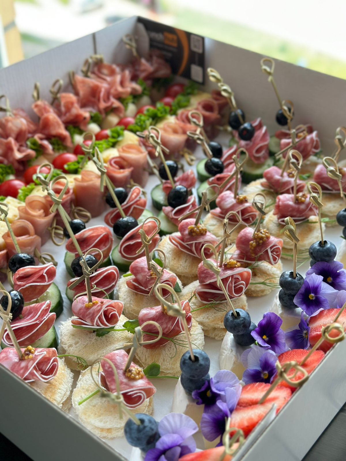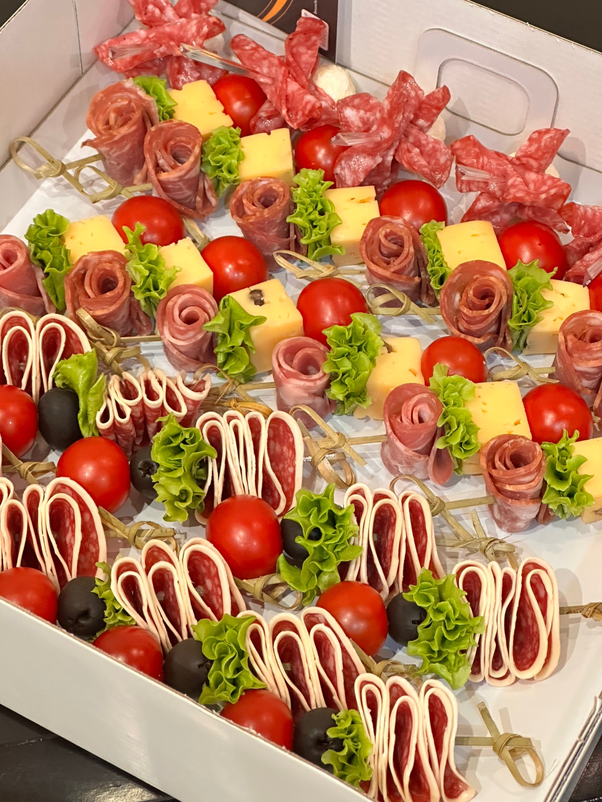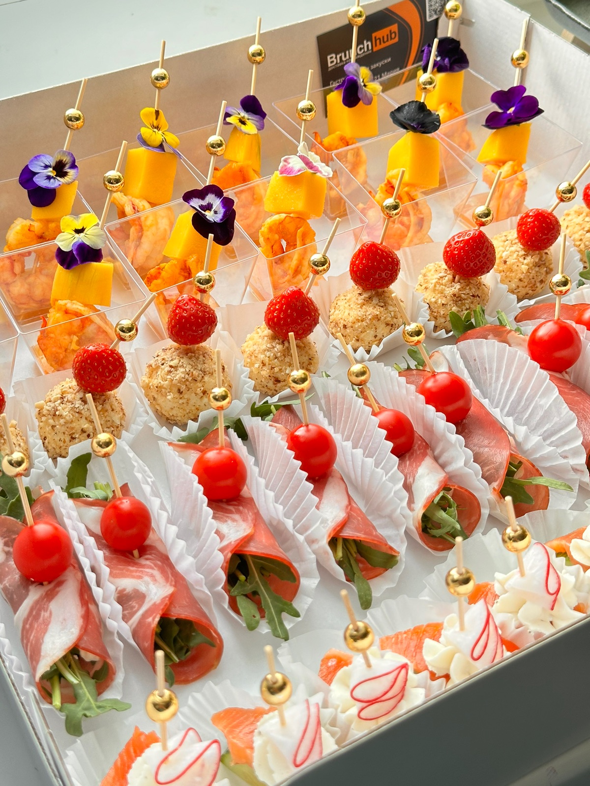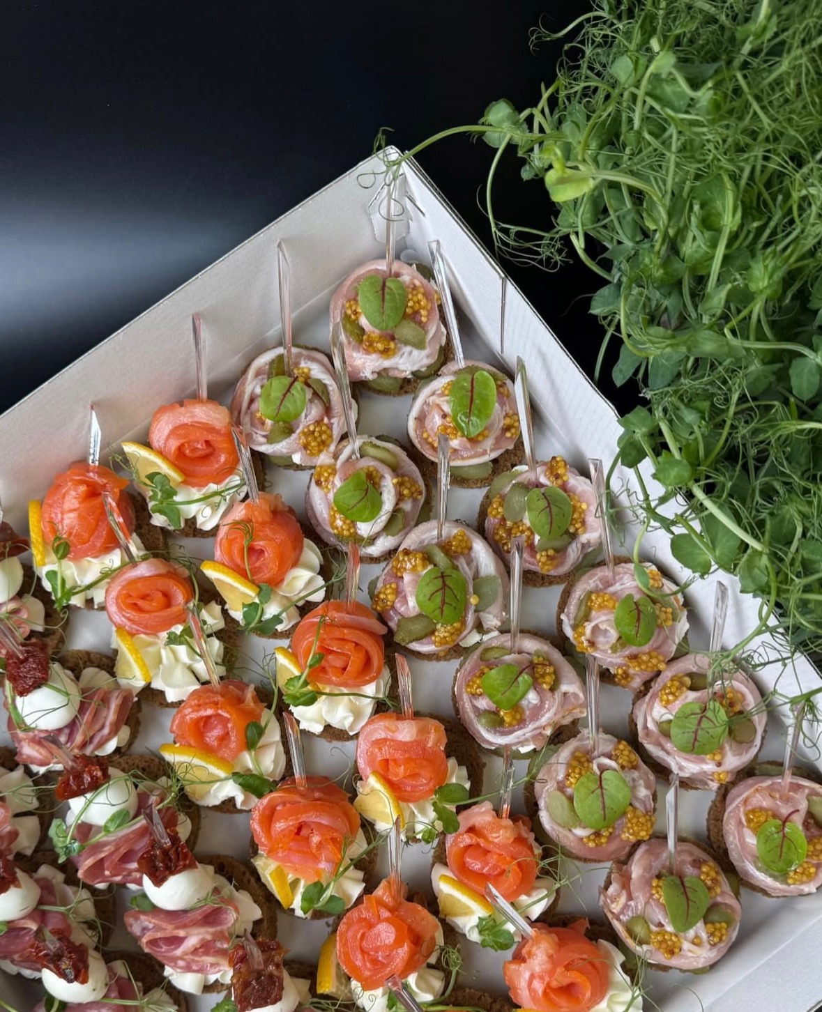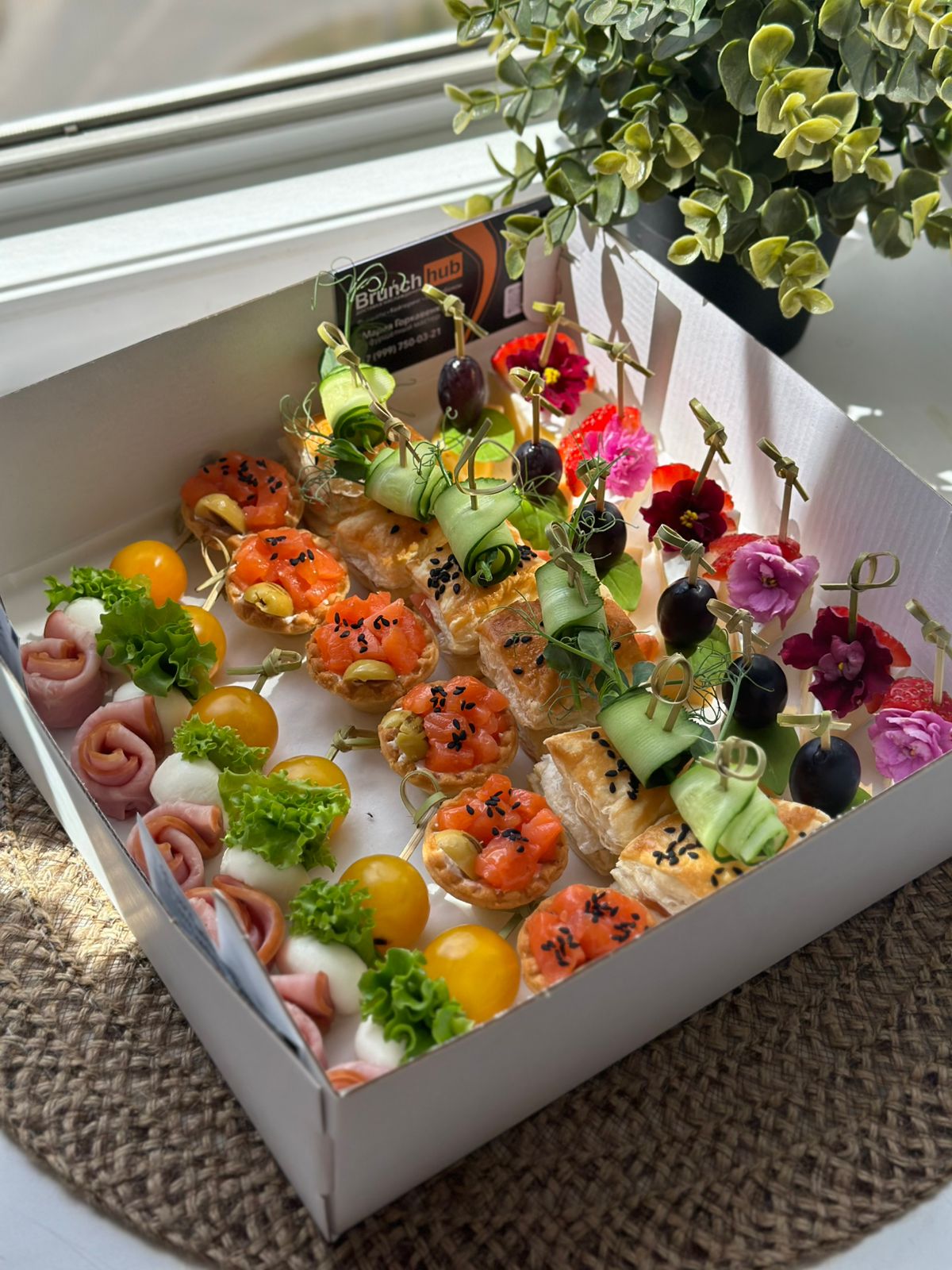 Брускетта с говядиной - 6 шт; Брускетта с форелью и огурчиком -6 шт; Канапе салями с сыром и перлине - 6 шт; Канапе огурчик с форелью и оливкой -7 шт; Кростини с аргентинскими креветками- 5 шт; Кростини с говядиной- 5 шт; Кростини с камамбером и сезонной ягодой или фруктом - 5 шт; Кростини с говядиной, вялеными томатами и горчичкой -5 шт; Кростини с карбонадом и черри- 5 шт; Камамбер с сезонной ягодой или фруктом- 8 шт; Твердый сыр с виноградом - 6 шт; Мини сендвич с форелью и огурчиком - 6 шт; Канапе с с/в шеей, черри и моцареллой -6 шт; Тарталетки с форелью -6 шт.