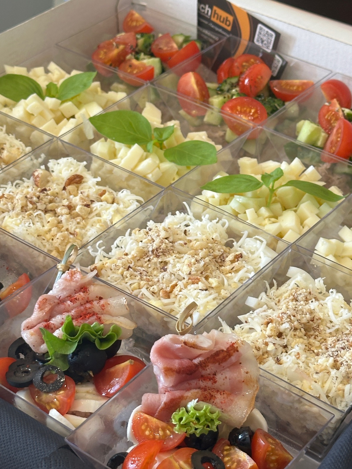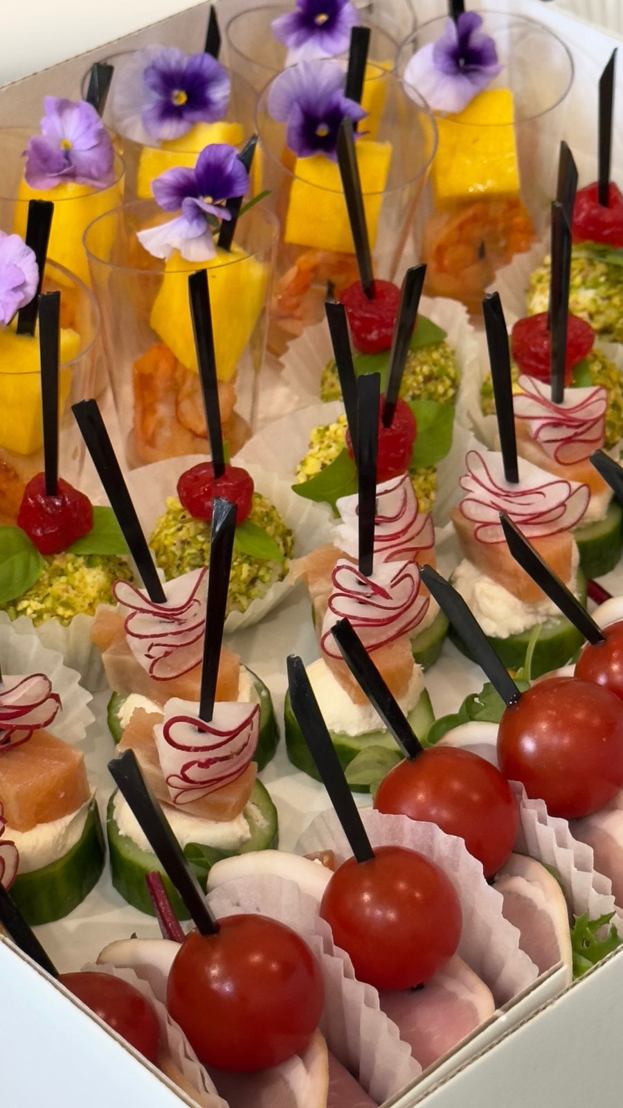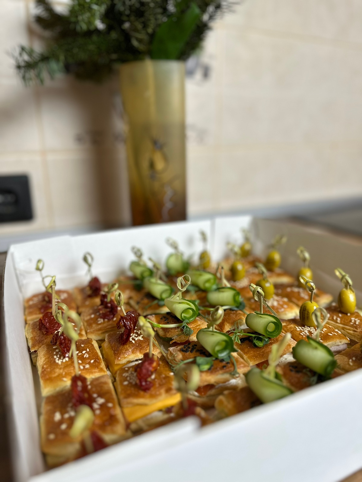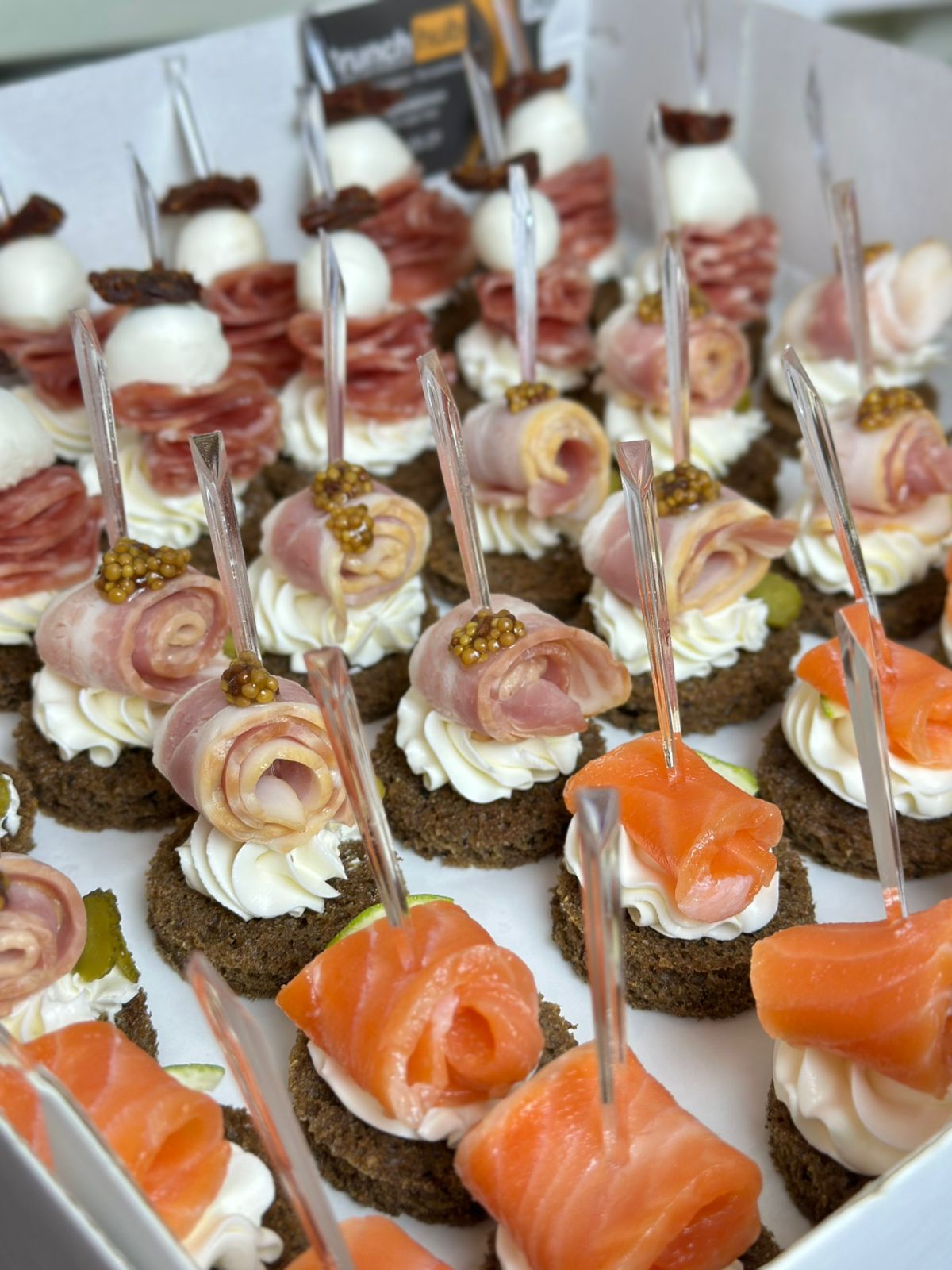 Брускетта с говядиной - 6 шт; Брускетта с форелью и огурчиком -6 шт; Канапе салями с сыром и перлине - 6 шт; Канапе огурчик с форелью и оливкой -7 шт; Кростини с аргентинскими креветками- 5 шт; Кростини с говядиной- 5 шт; Кростини с камамбером и сезонной ягодой или фруктом - 5 шт; Кростини с говядиной, вялеными томатами и горчичкой -5 шт; Кростини с карбонадом и черри- 5 шт; Камамбер с сезонной ягодой или фруктом- 8 шт; Твердый сыр с виноградом - 6 шт; Мини сендвич с форелью и огурчиком - 6 шт; Канапе с с/в шеей, черри и моцареллой -6 шт; Тарталетки с форелью -6 шт.