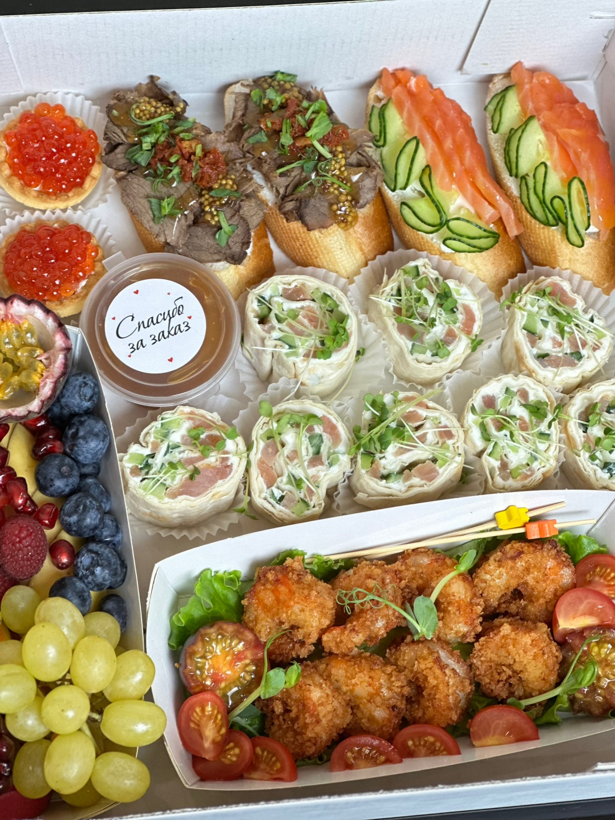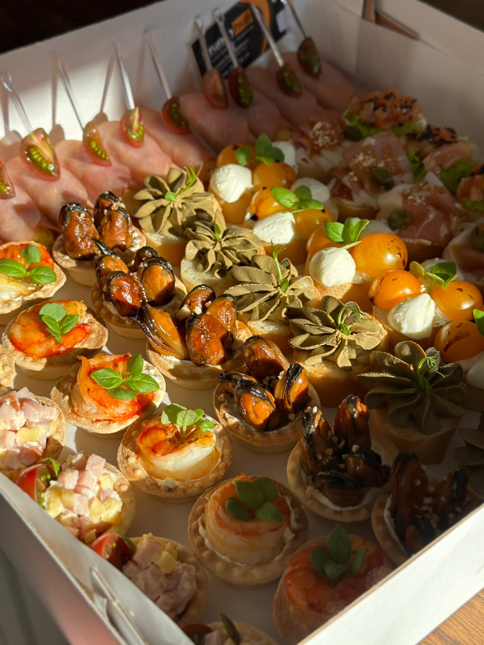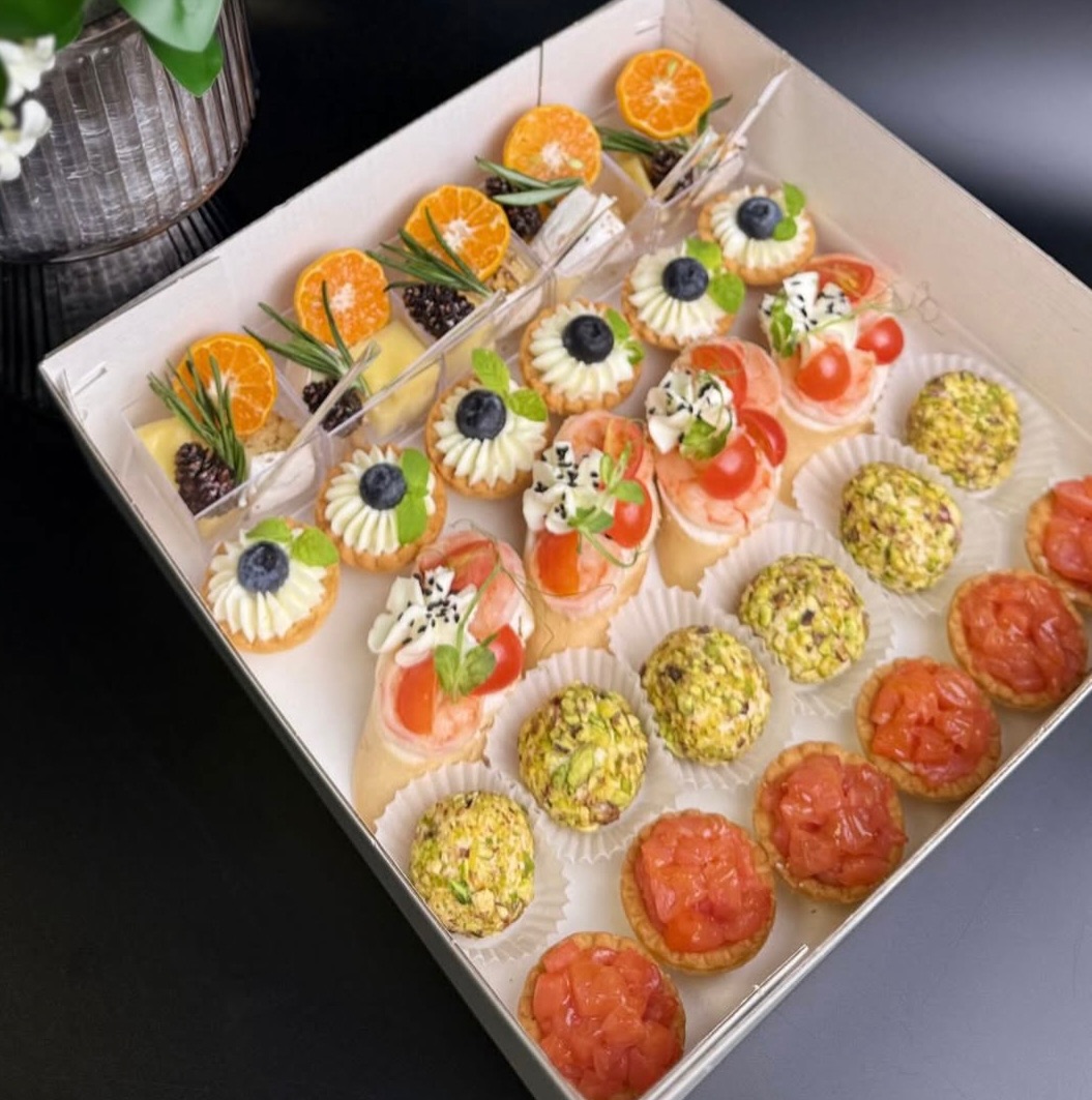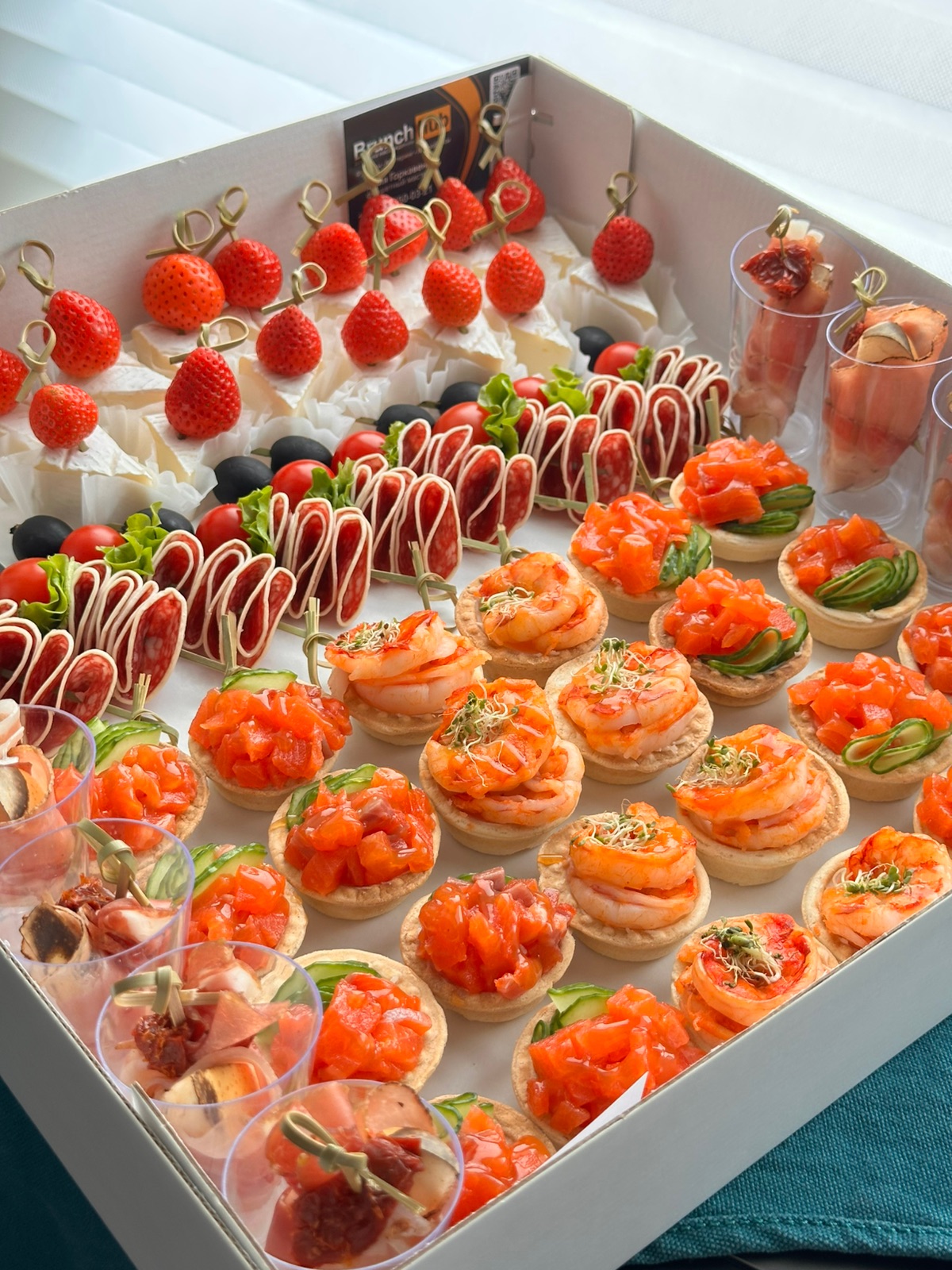 Тарталетки с форелью и крем чиз 6 шт; Чизболы с орехами 6 шт; Кростини с аргентинской креветкой 4 шт; Тарталетки десертные с сезонной ягодой 6 шт; Креманка с двумя видами сыра -5 шт.
