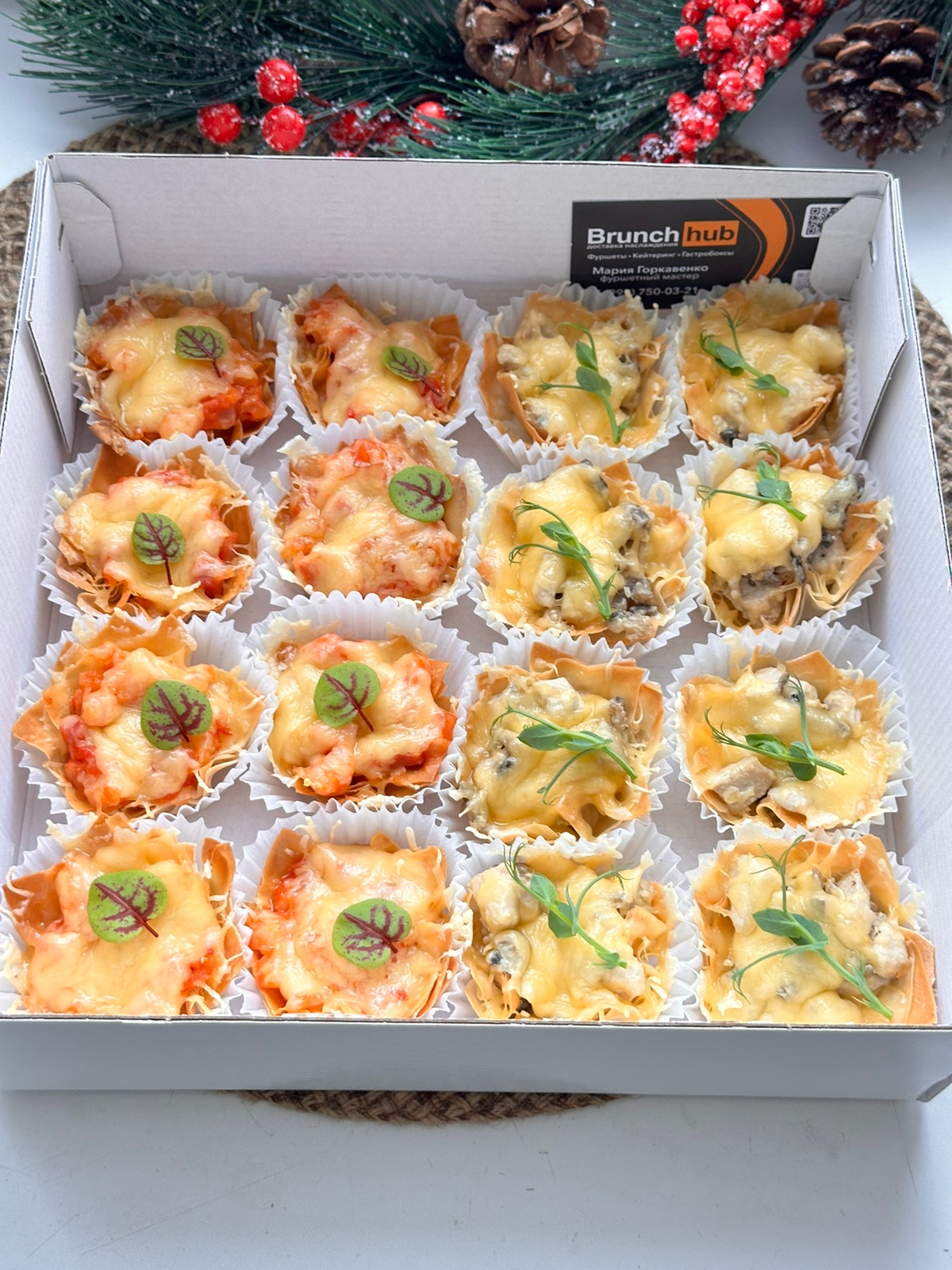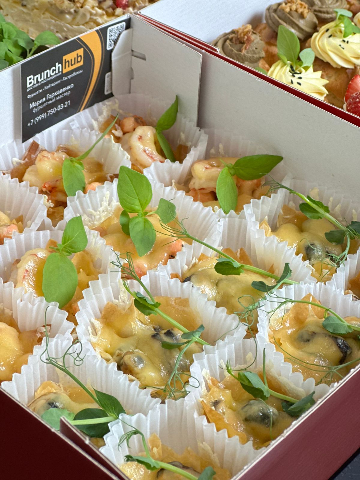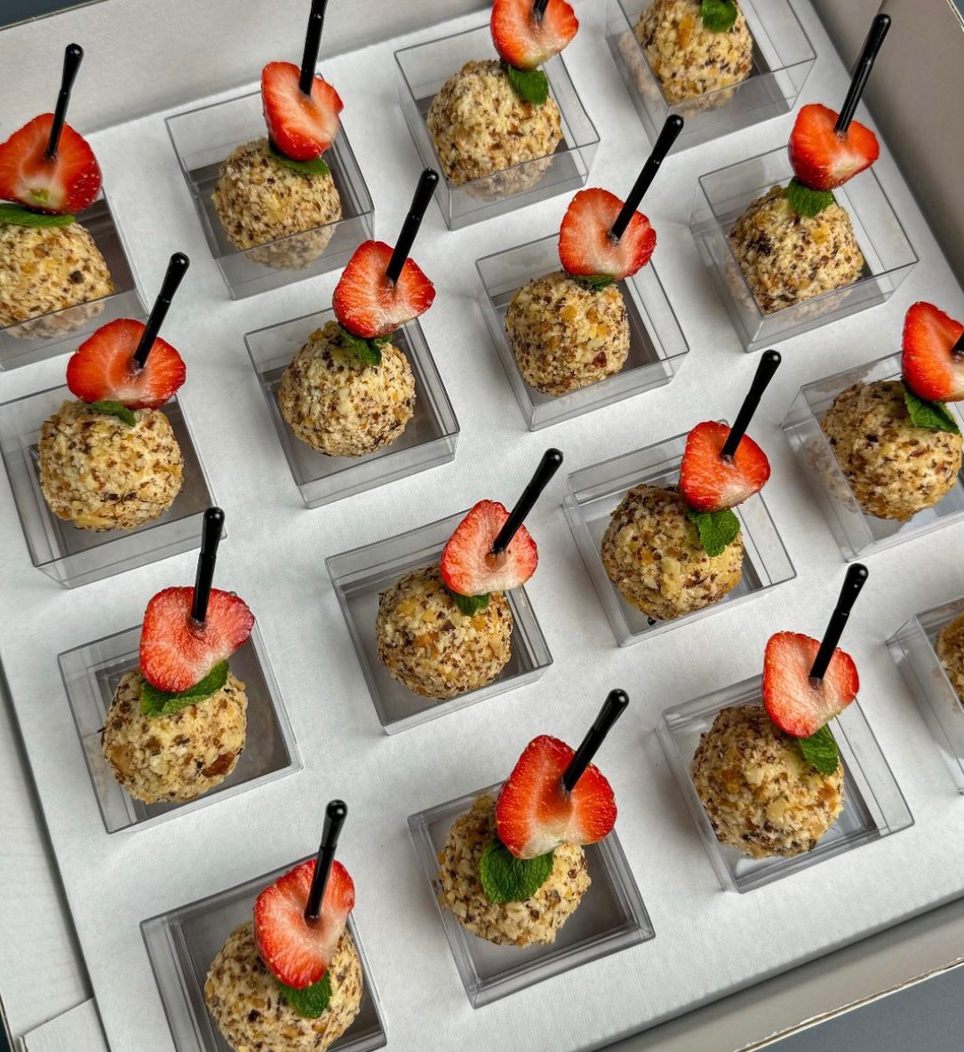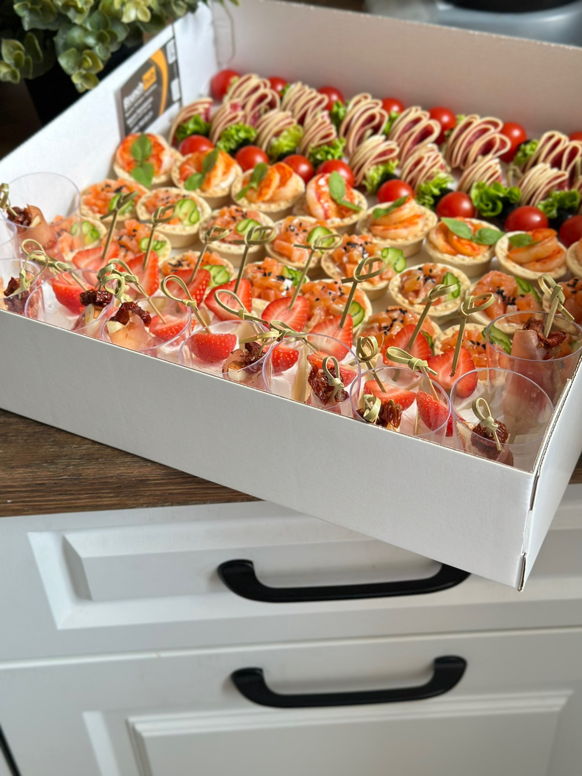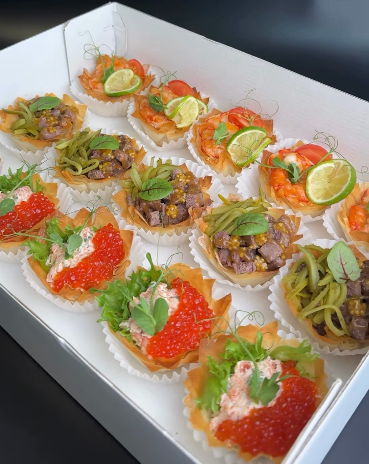 Тарталетки с форелью и крем чиз 6 шт; Чизболы с орехами 6 шт; Кростини с аргентинской креветкой 4 шт; Тарталетки десертные с сезонной ягодой 6 шт; Креманка с двумя видами сыра -5 шт.