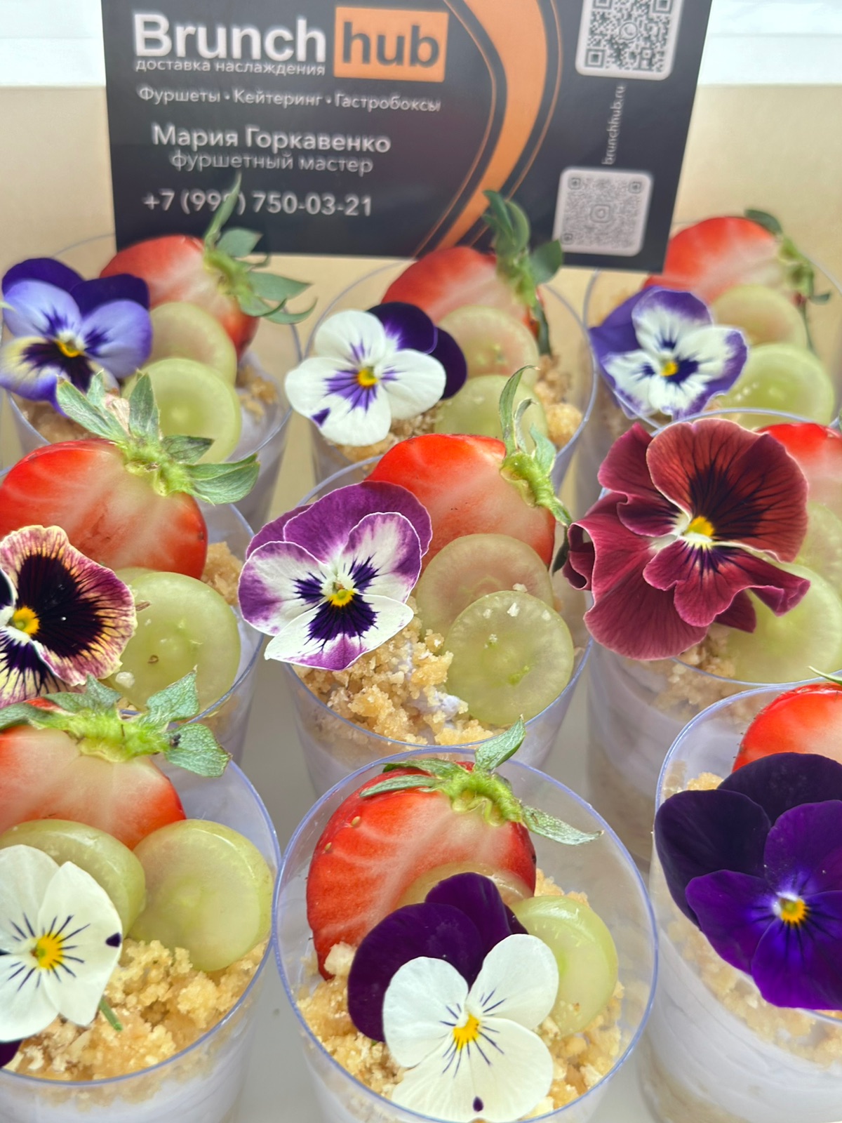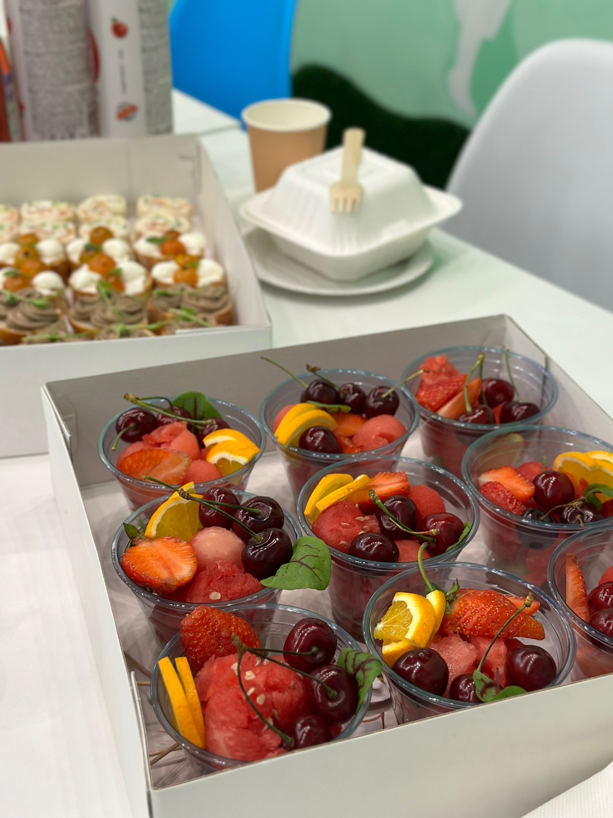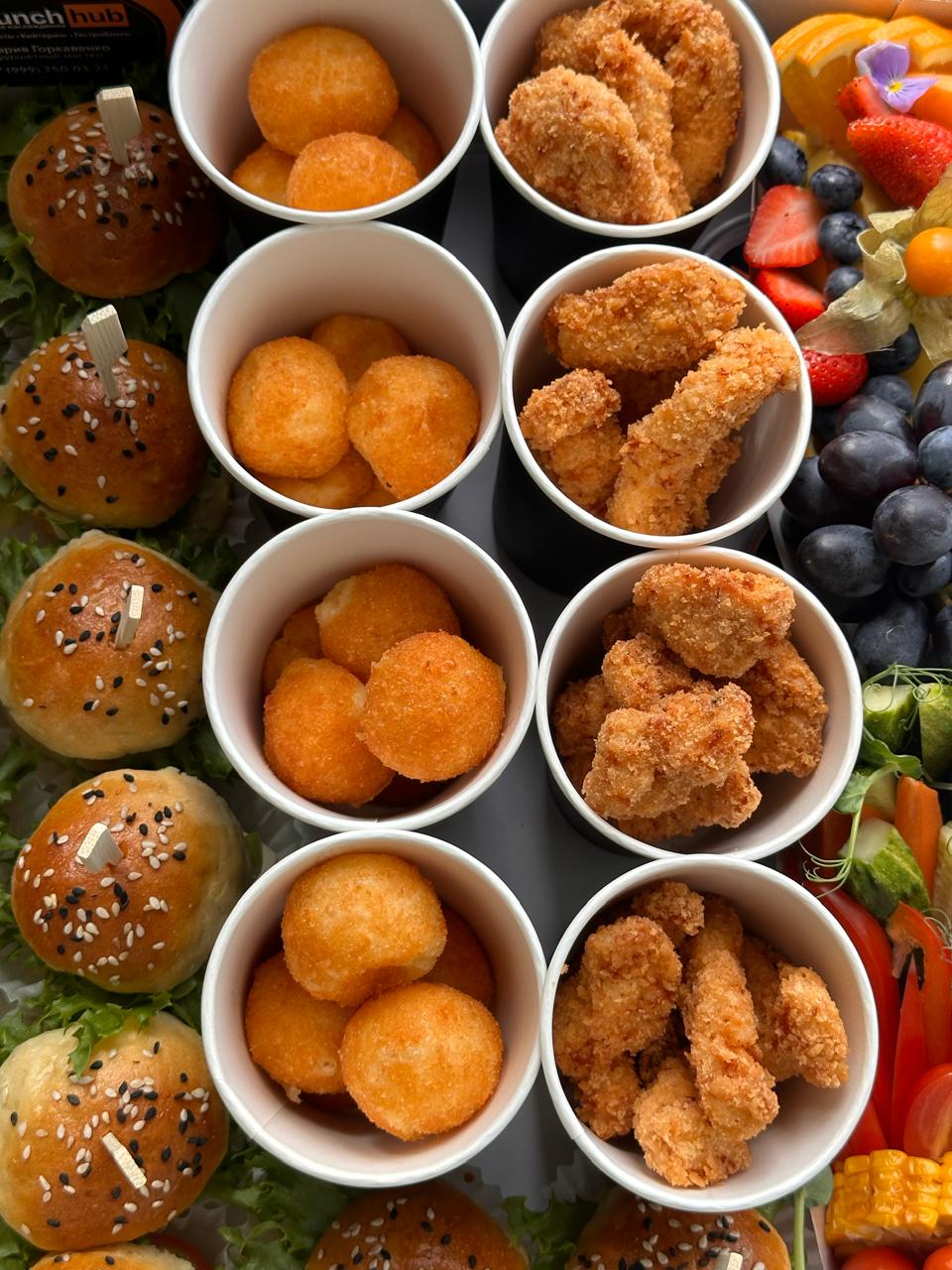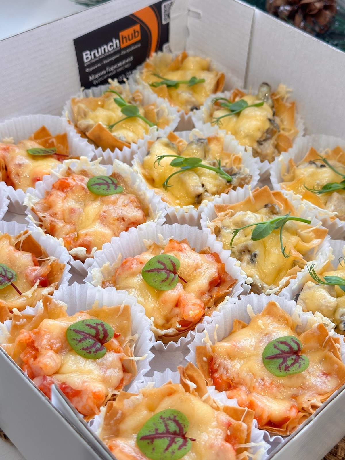 Тарталетки с форелью и крем чиз 6 шт; Чизболы с орехами 6 шт; Кростини с аргентинской креветкой 4 шт; Тарталетки десертные с сезонной ягодой 6 шт; Креманка с двумя видами сыра -5 шт.