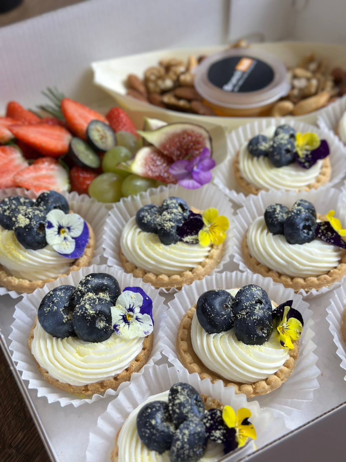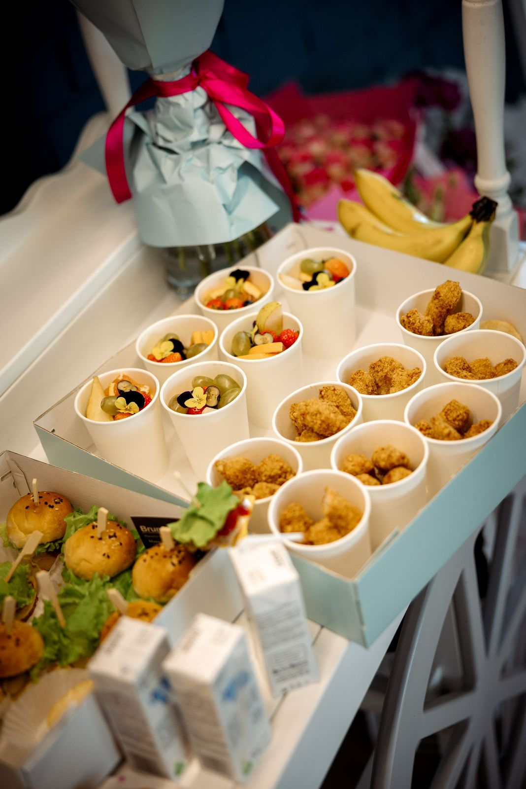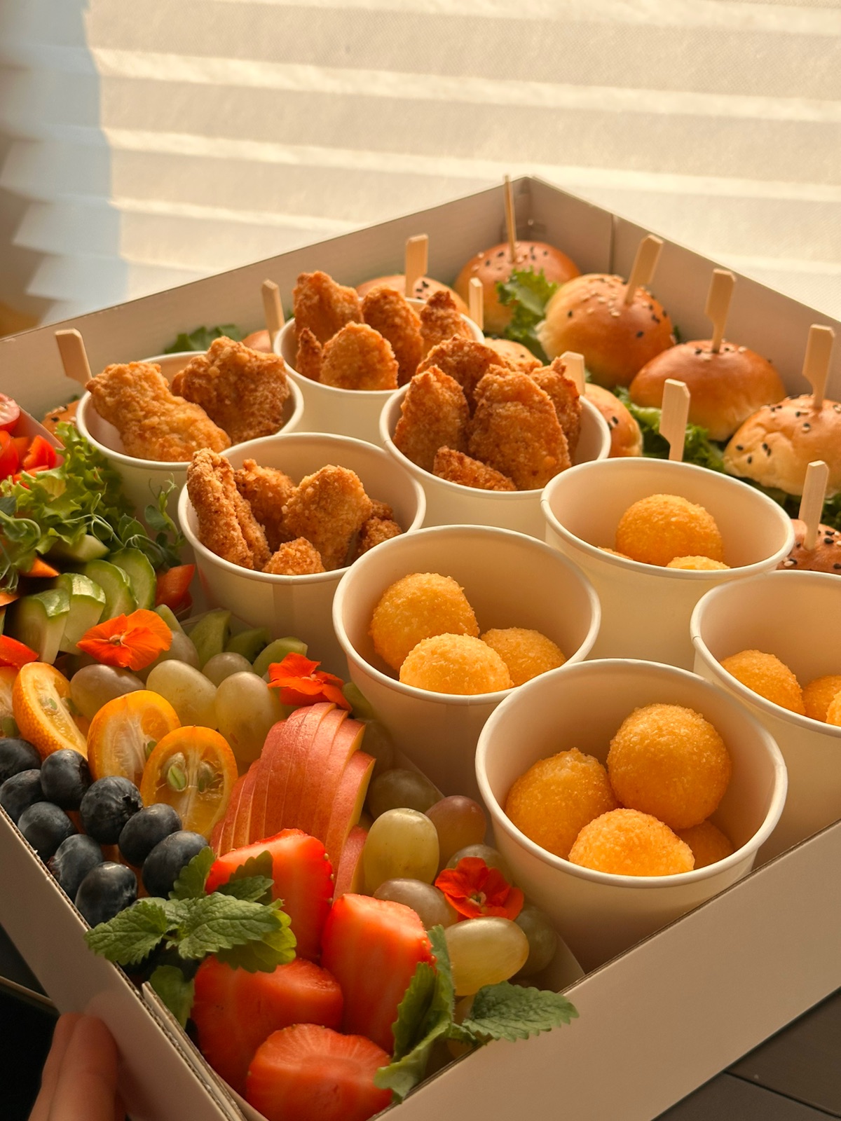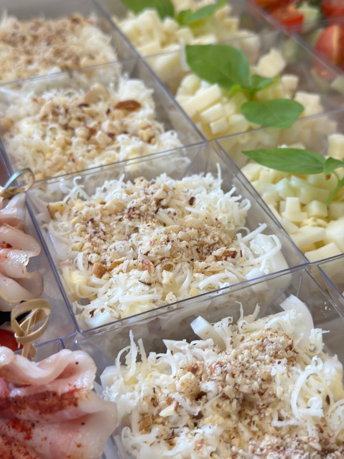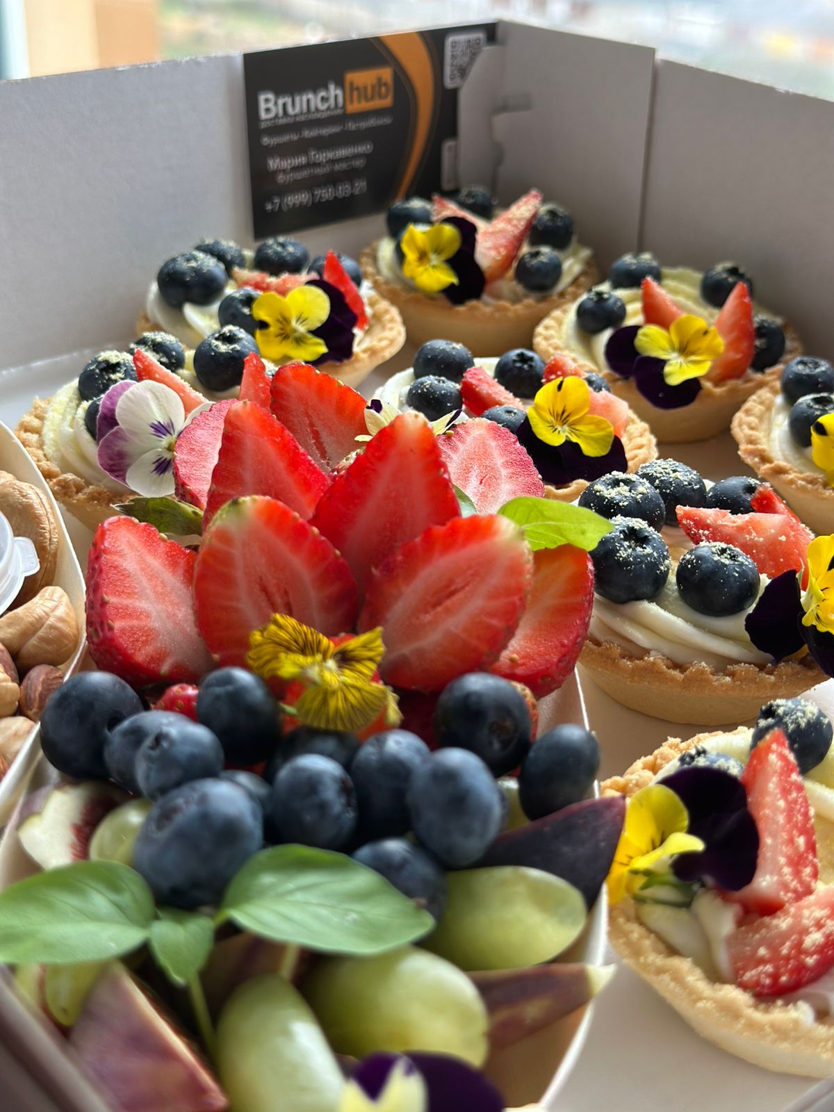 Тарталетки с форелью и крем чиз 6 шт; Чизболы с орехами 6 шт; Кростини с аргентинской креветкой 4 шт; Тарталетки десертные с сезонной ягодой 6 шт; Креманка с двумя видами сыра -5 шт.