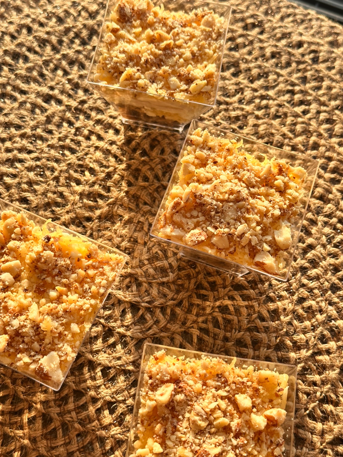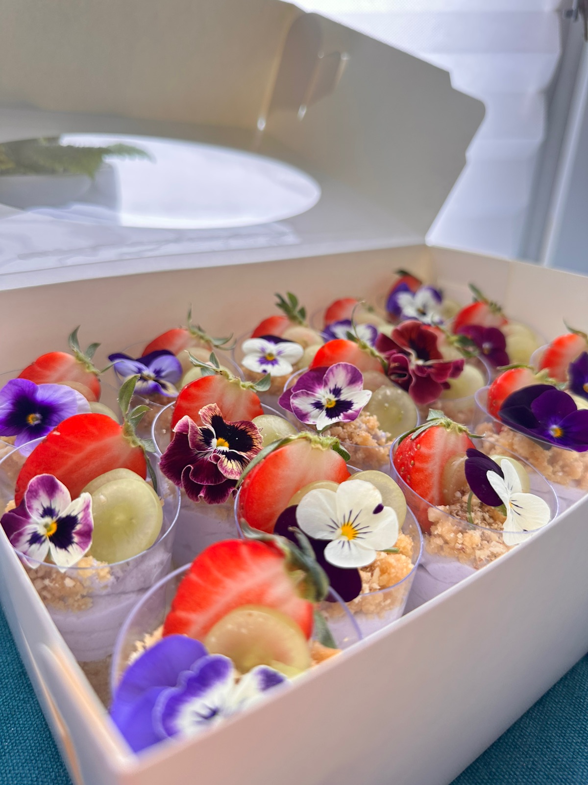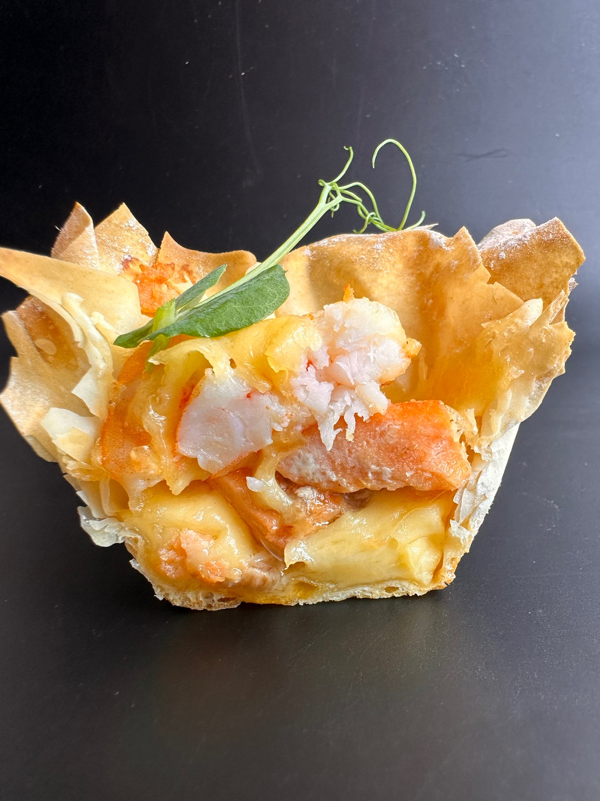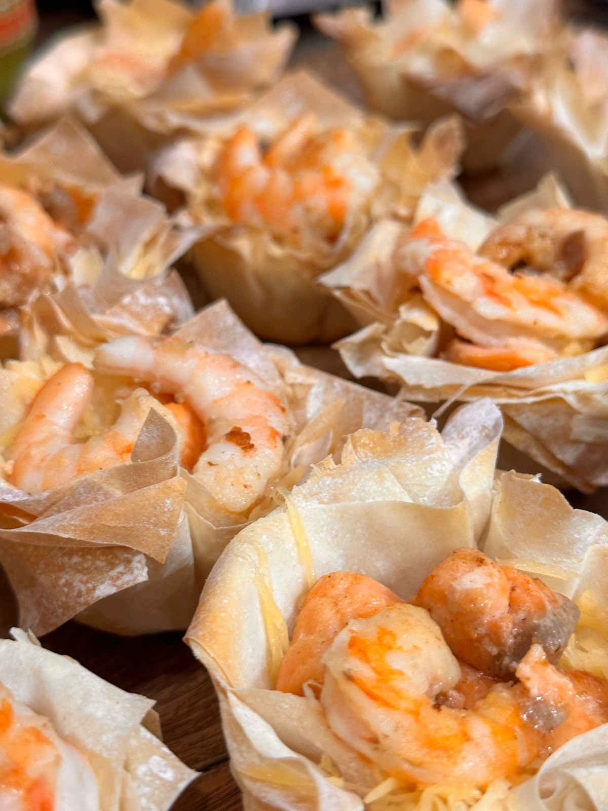 Тарталетки с форелью и крем чиз 6 шт; Чизболы с орехами 6 шт; Кростини с аргентинской креветкой 4 шт; Тарталетки десертные с сезонной ягодой 6 шт; Креманка с двумя видами сыра -5 шт.