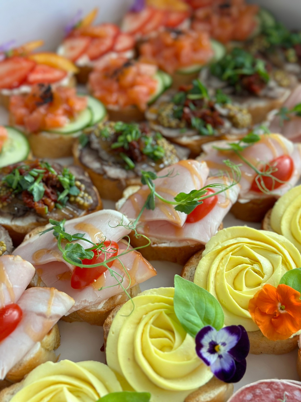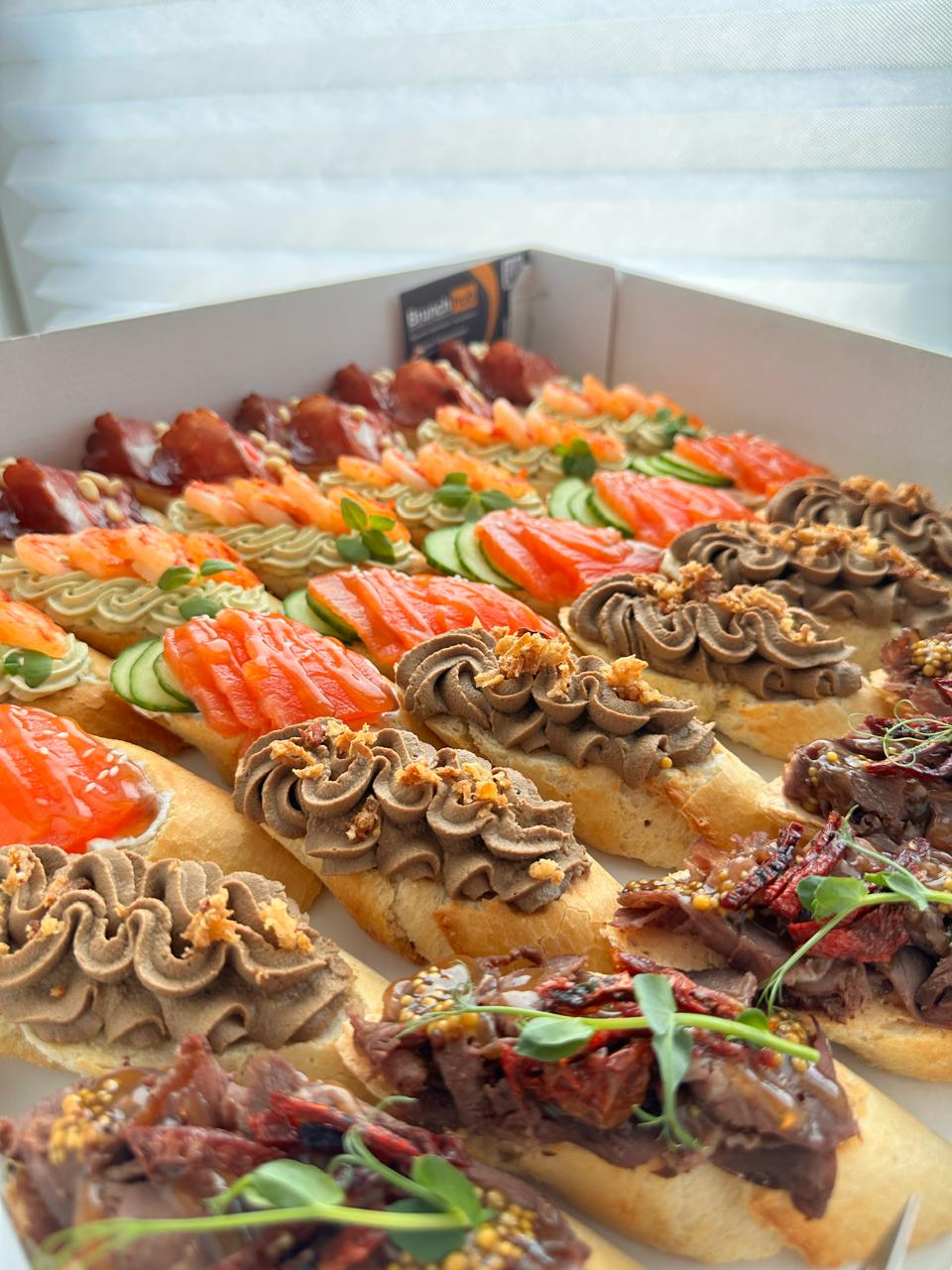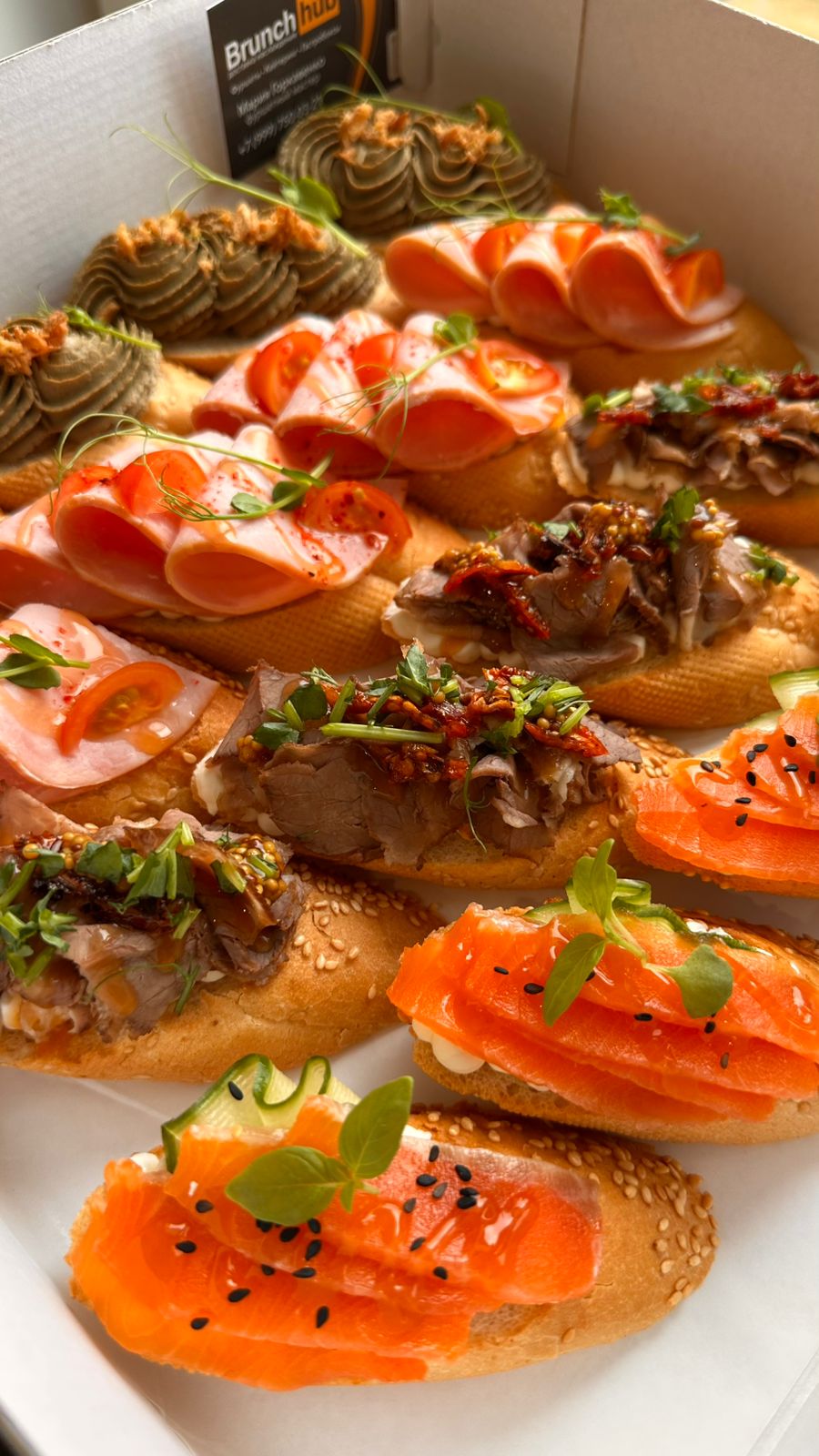 Кростини с говядиной домашнего приготовления, с вялеными томатами и французской горчичкой 6 шт; Кростини с форелью собственного посола 6 шт; Кростини с карбонадом и черри 6 шт; Кростини с салями 6 шт; Кростини с яично-сырным паштетом 6 шт; Кростини с кокосом, крем чиз и сезонной ягодой -6 шт