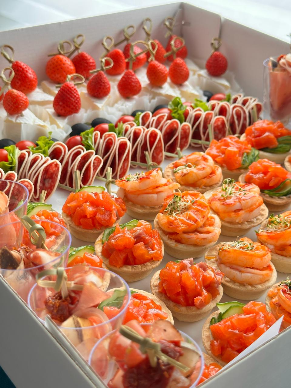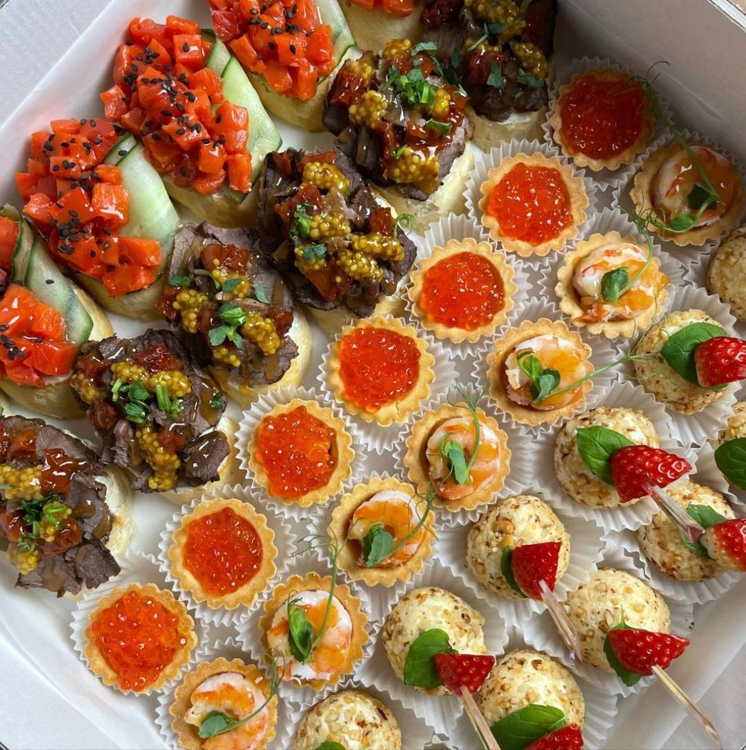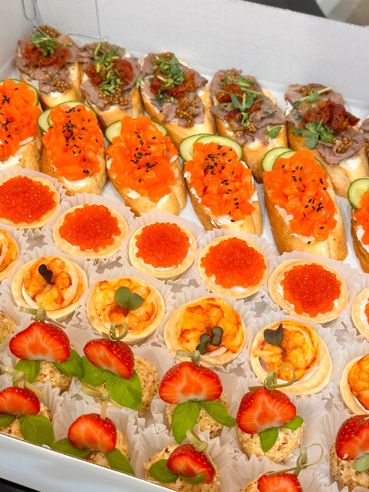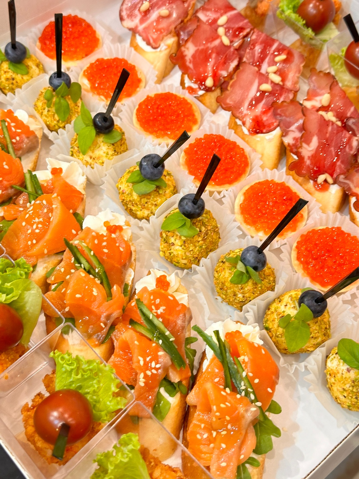 Кростини с говядиной, вялеными томатами и с горчицей 6 шт; Кростини с форелью и свежим огурчиком 6 шт; Тарталетки с красной икрой и кремчиз 7 шт; Тарталетки с аргентинской креветкой и кремчиз 7 шт; Чиз бол с сезонной ягодой 16 шт.