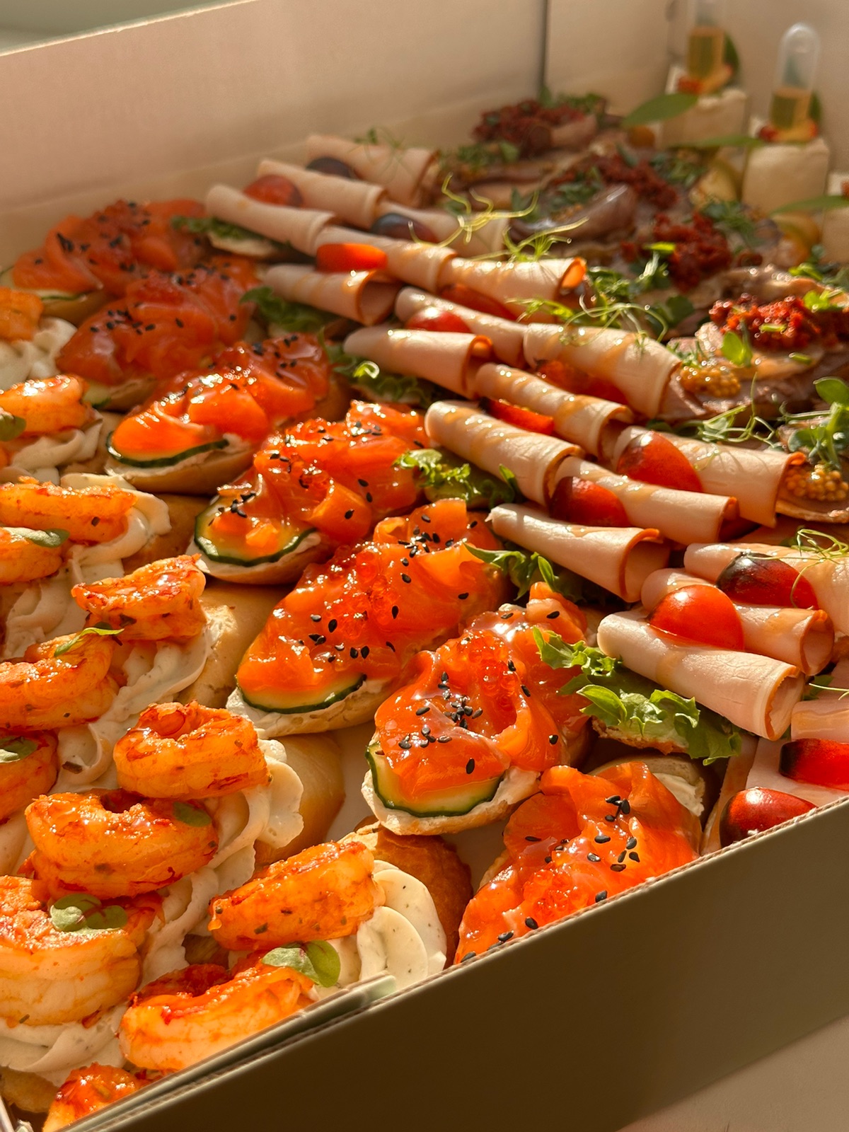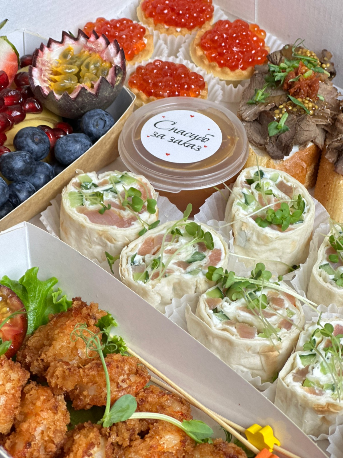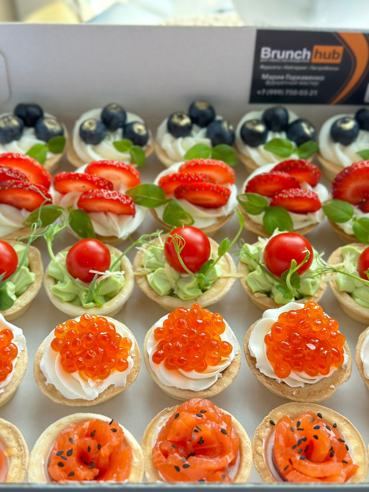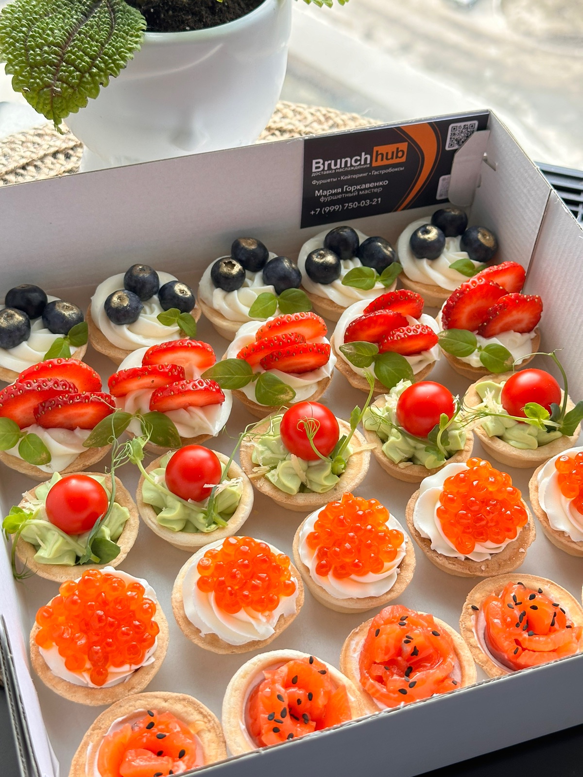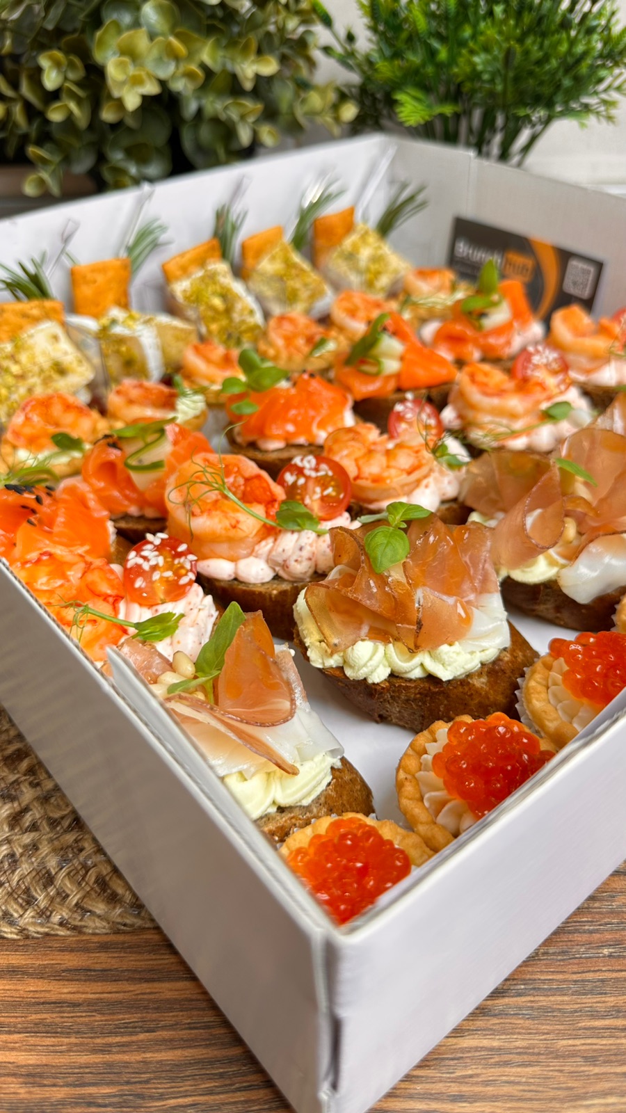 Кростини с говядиной, вялеными томатами и с горчицей 6 шт; Кростини с форелью и свежим огурчиком 6 шт; Тарталетки с красной икрой и кремчиз 7 шт; Тарталетки с аргентинской креветкой и кремчиз 7 шт; Чиз бол с сезонной ягодой 16 шт.