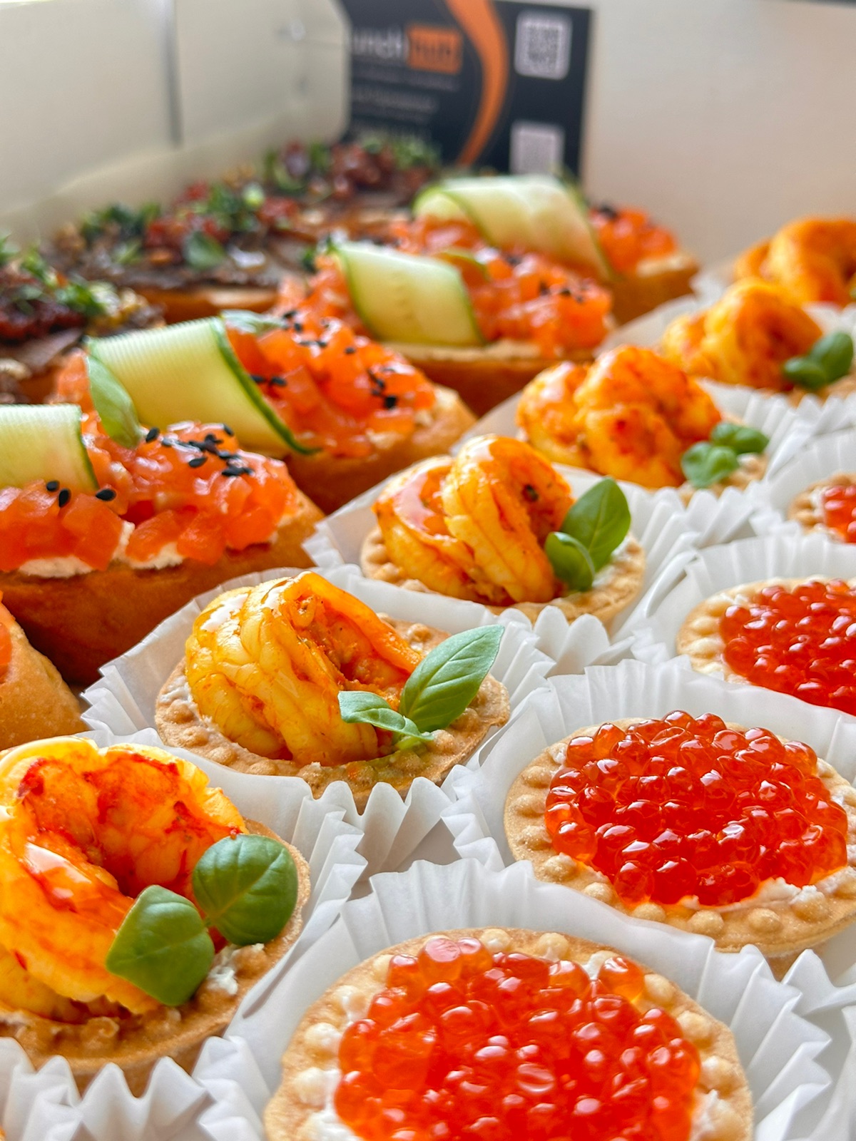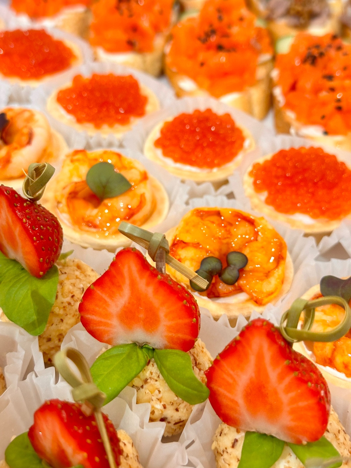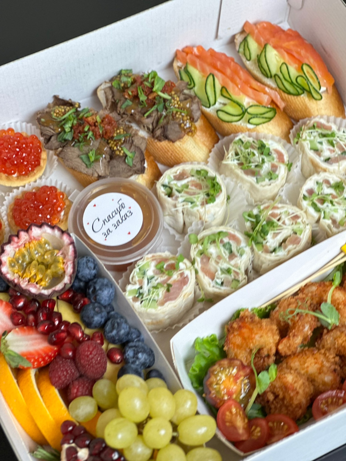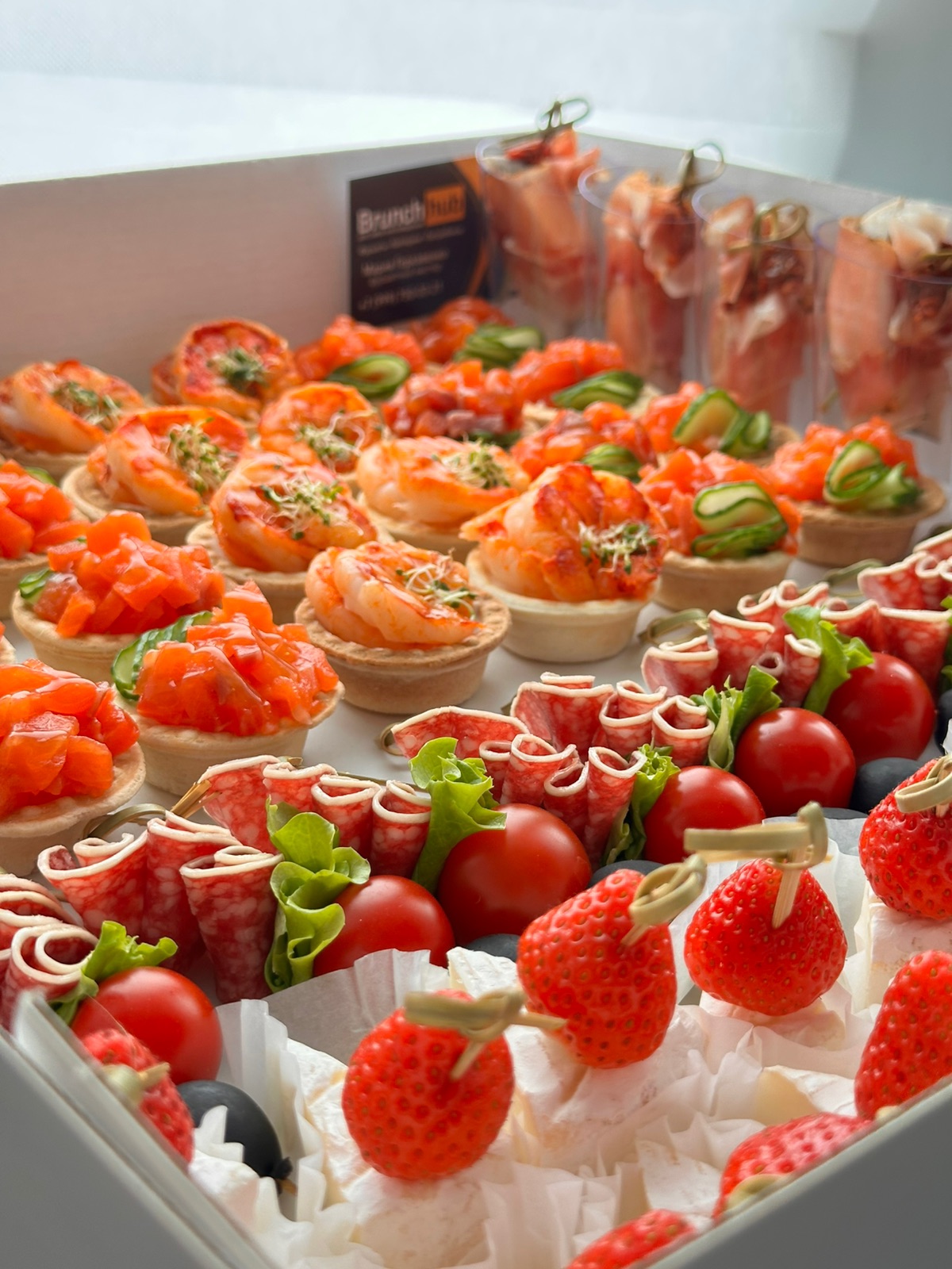 Кростини с говядиной, вялеными томатами и с горчицей 6 шт; Кростини с форелью и свежим огурчиком 6 шт; Тарталетки с красной икрой и кремчиз 7 шт; Тарталетки с аргентинской креветкой и кремчиз 7 шт; Чиз бол с сезонной ягодой 16 шт.
