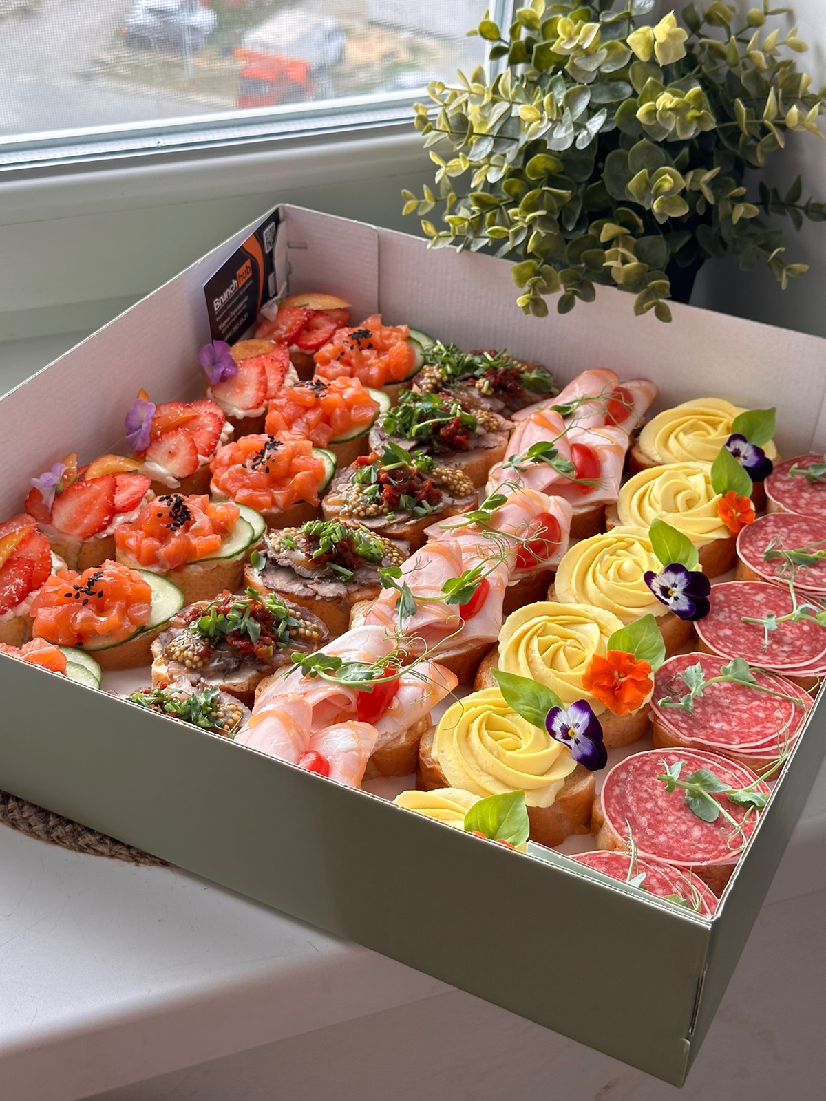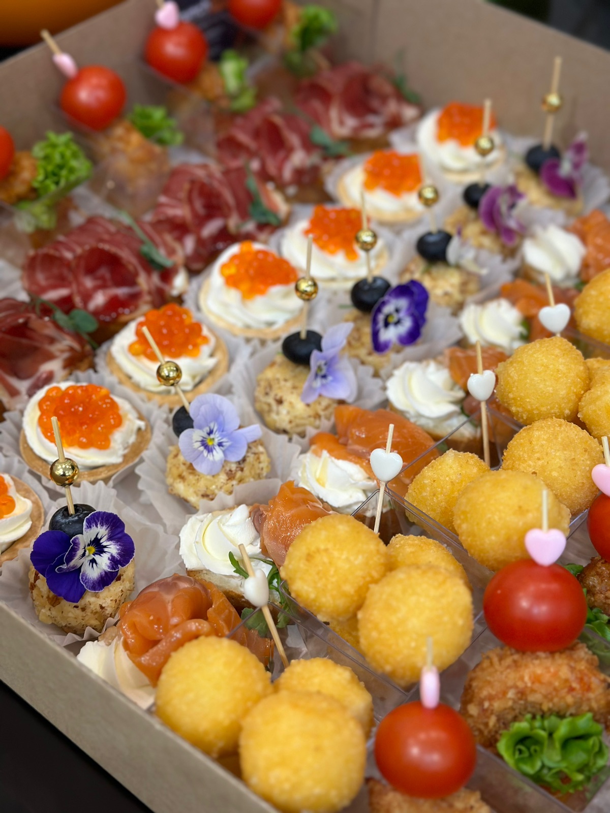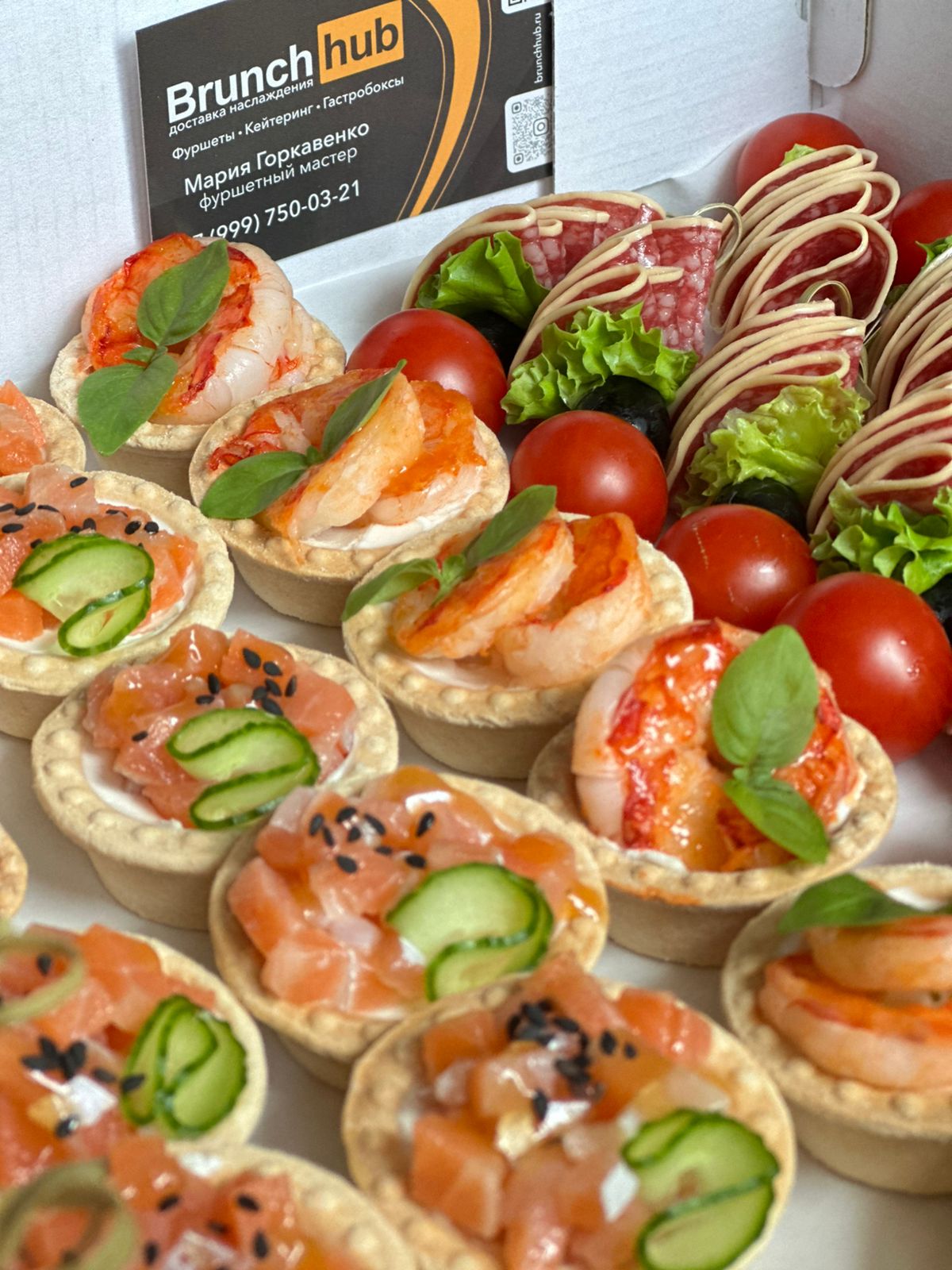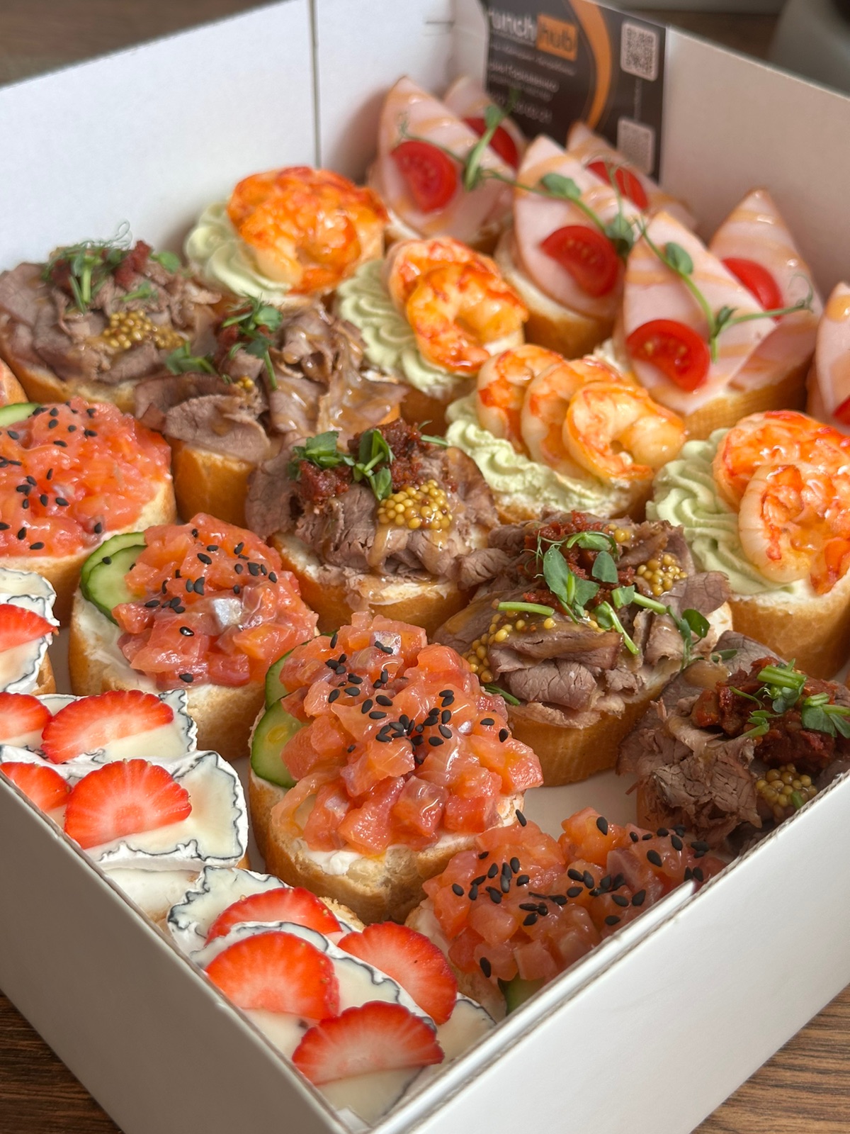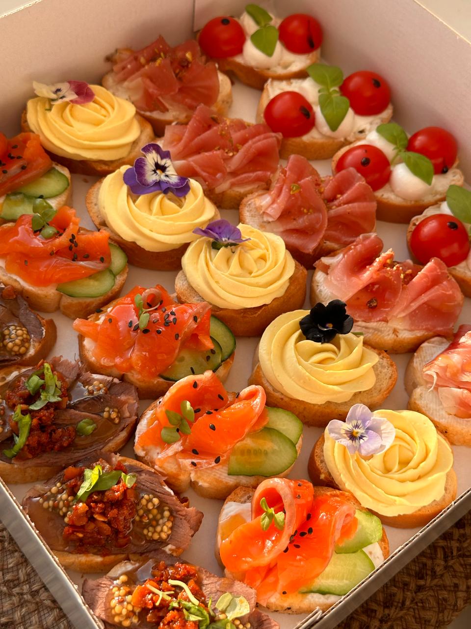 Кростини с говядиной, вялеными томатами и с горчицей 6 шт; Кростини с форелью и свежим огурчиком 6 шт; Тарталетки с красной икрой и кремчиз 7 шт; Тарталетки с аргентинской креветкой и кремчиз 7 шт; Чиз бол с сезонной ягодой 16 шт.