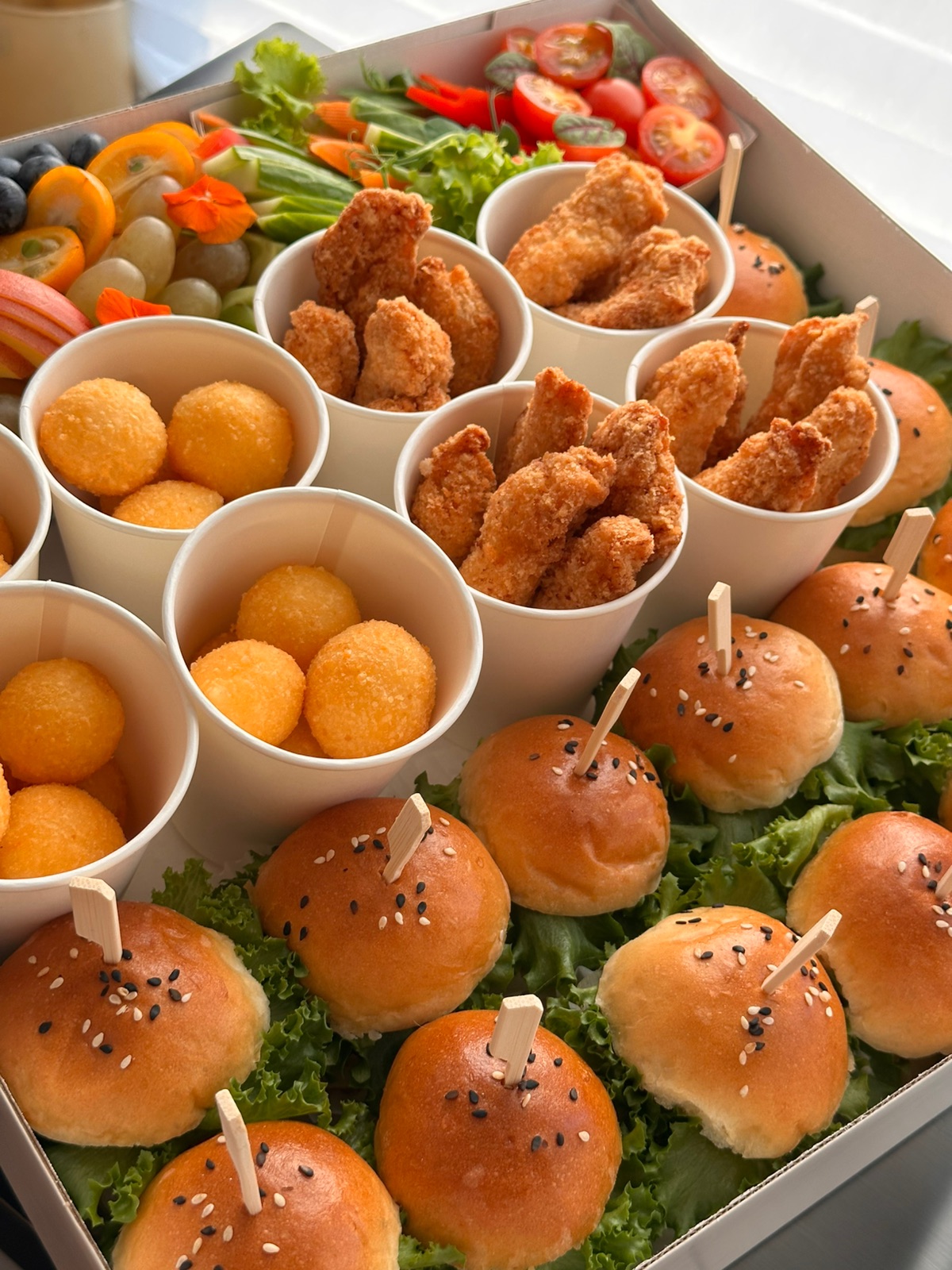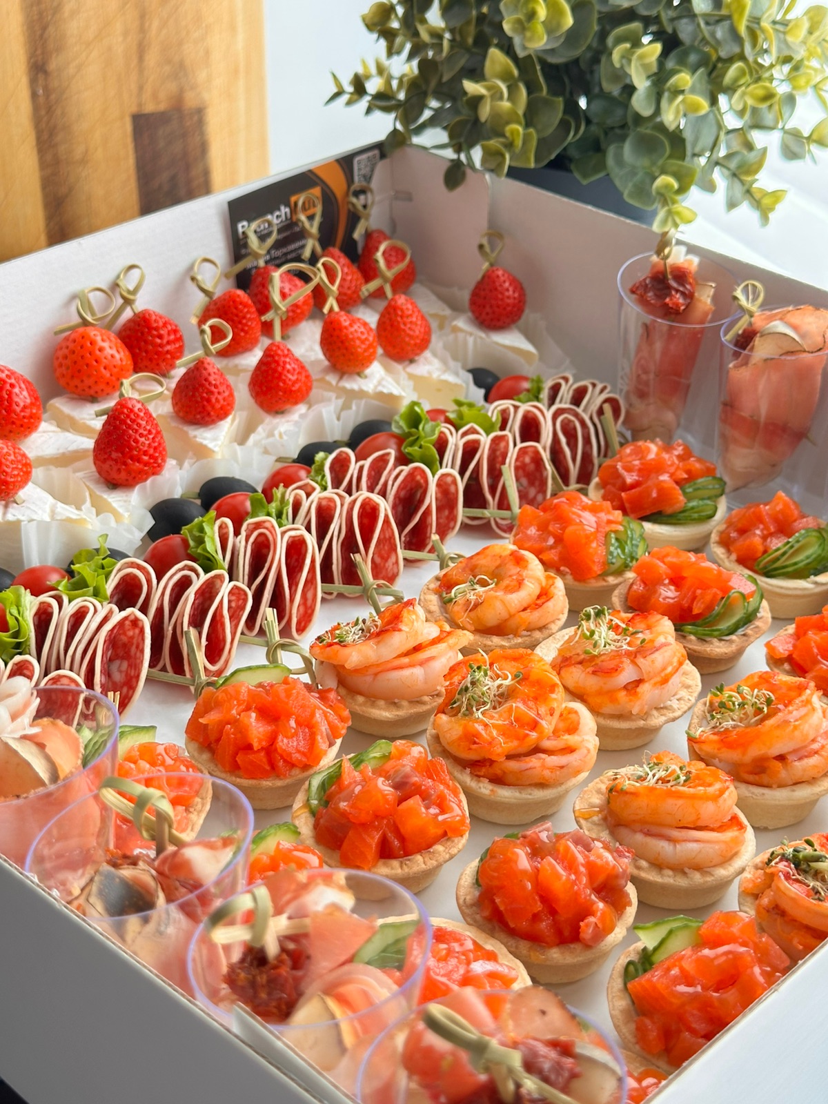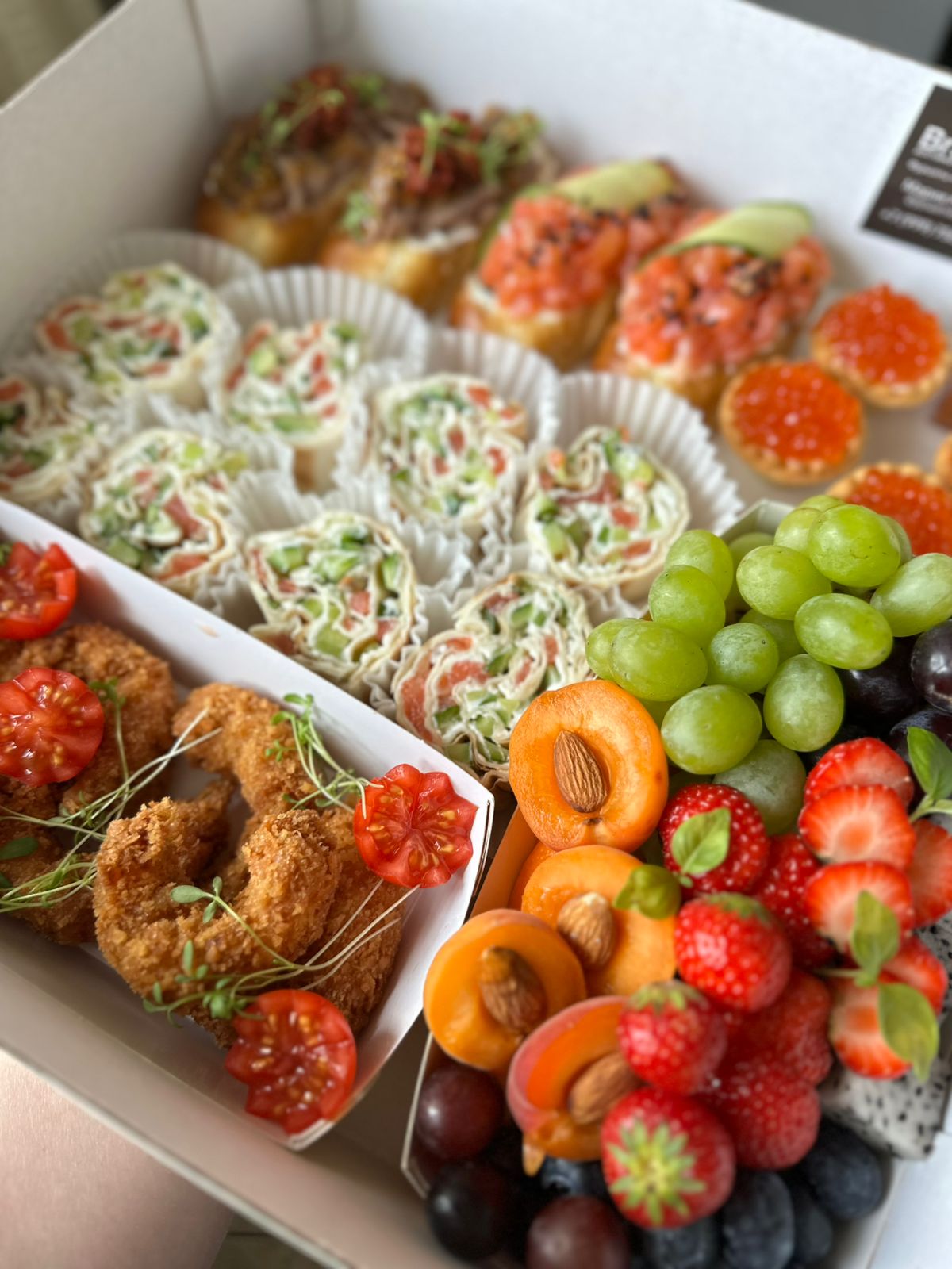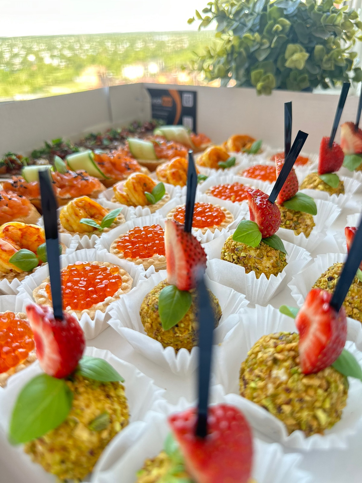 Кростини с говядиной, вялеными томатами и с горчицей 6 шт; Кростини с форелью и свежим огурчиком 6 шт; Тарталетки с красной икрой и кремчиз 7 шт; Тарталетки с аргентинской креветкой и кремчиз 7 шт; Чиз бол с сезонной ягодой 16 шт.