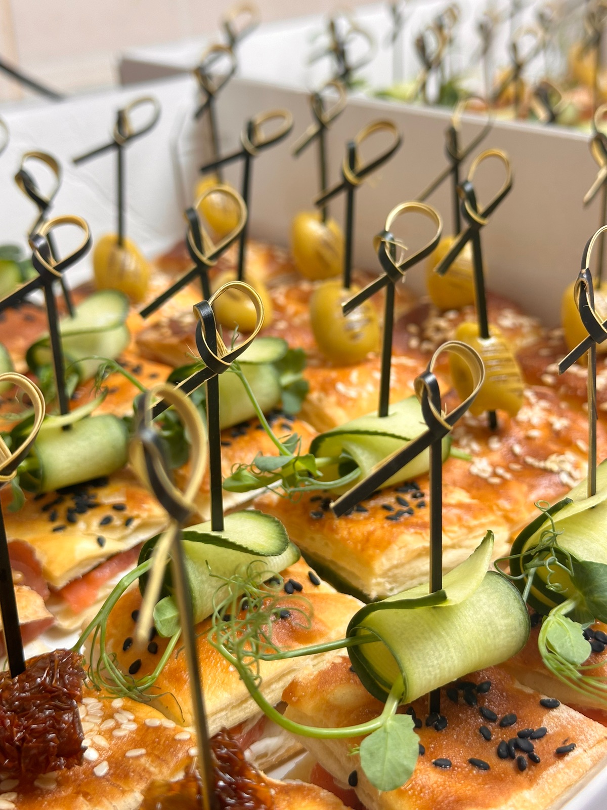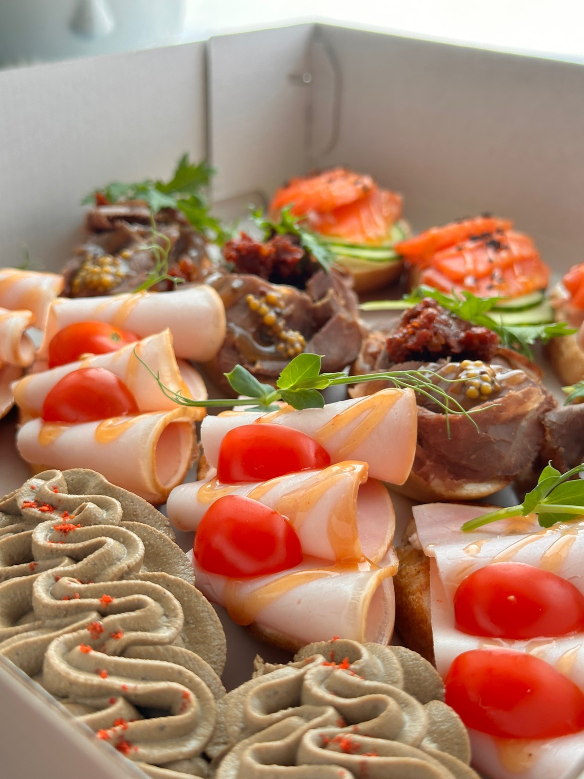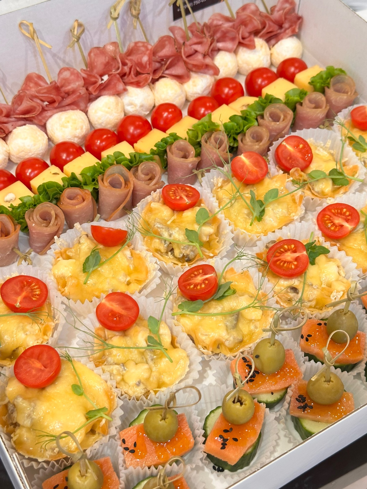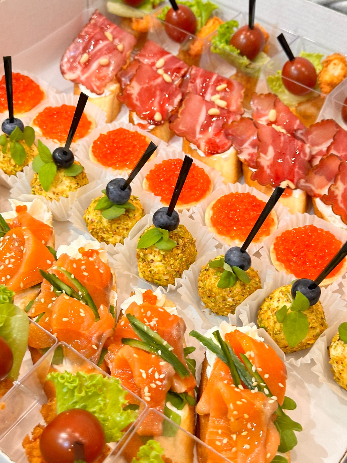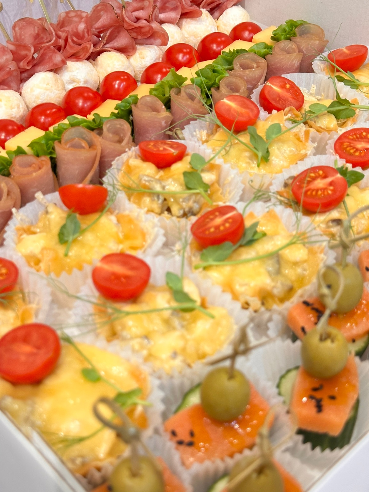 12 корзиночек фило с жюльеном, под щедрой шапкой сыра; 12 канапе огурчик с форелью; 12 канапе обожженный сальчисон с сырным шариком; 12 канапе с балыком, сыром и черри