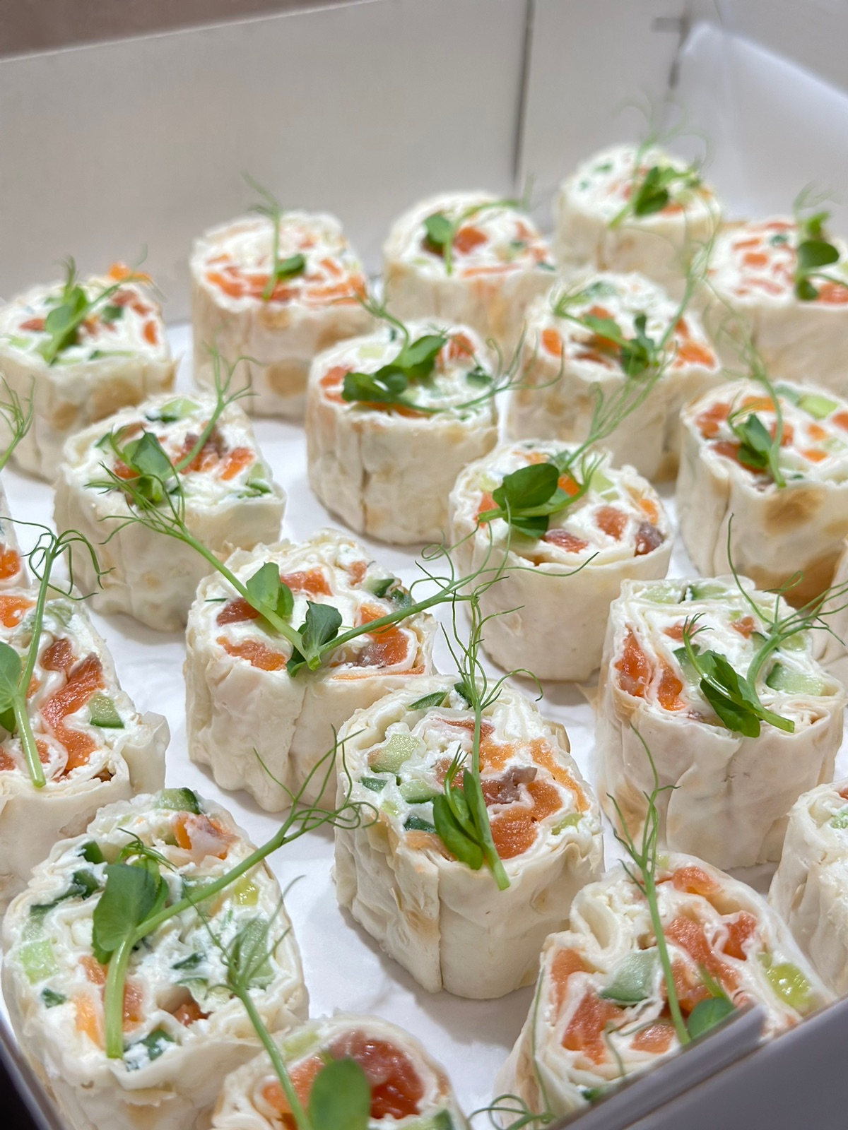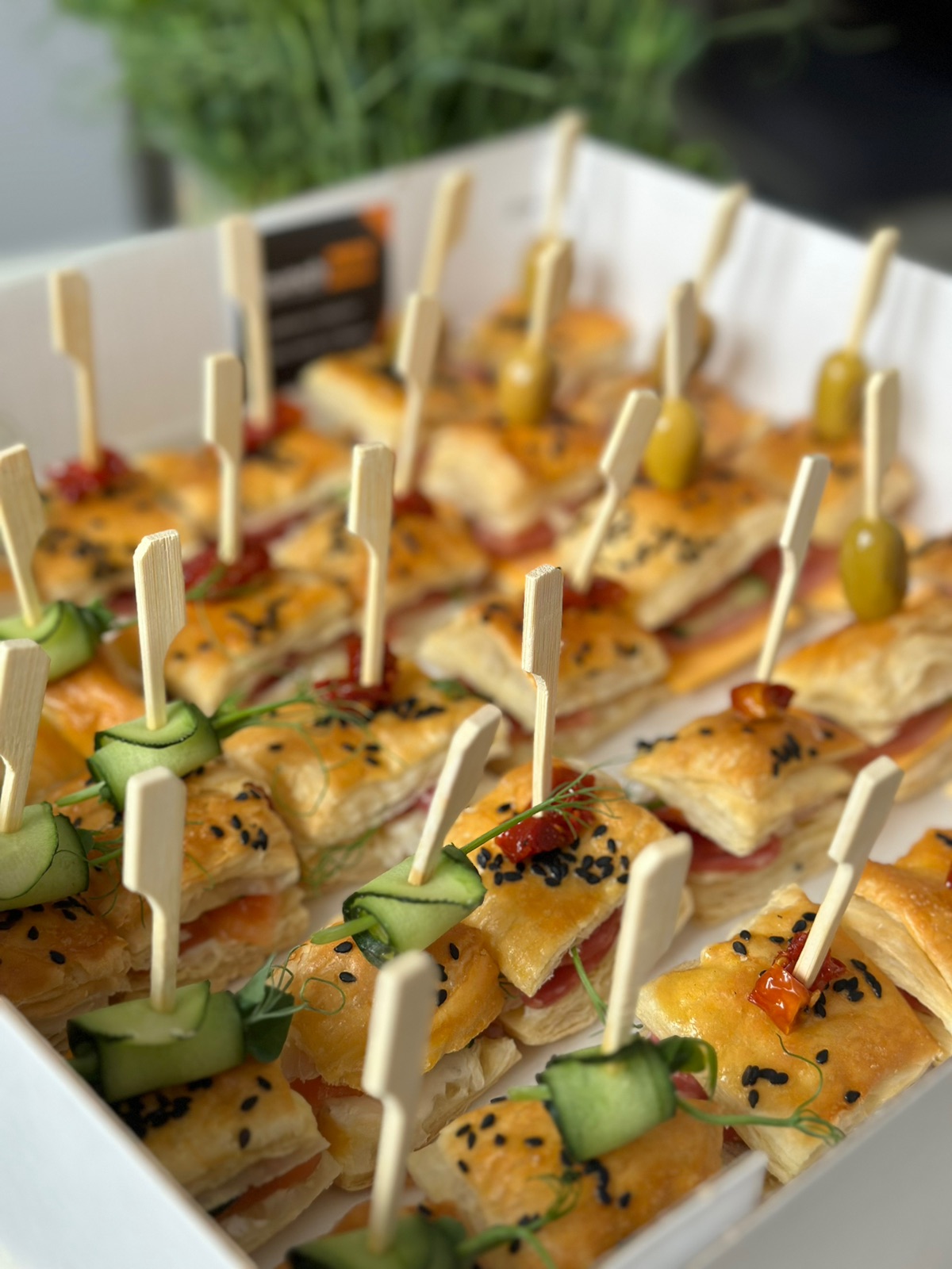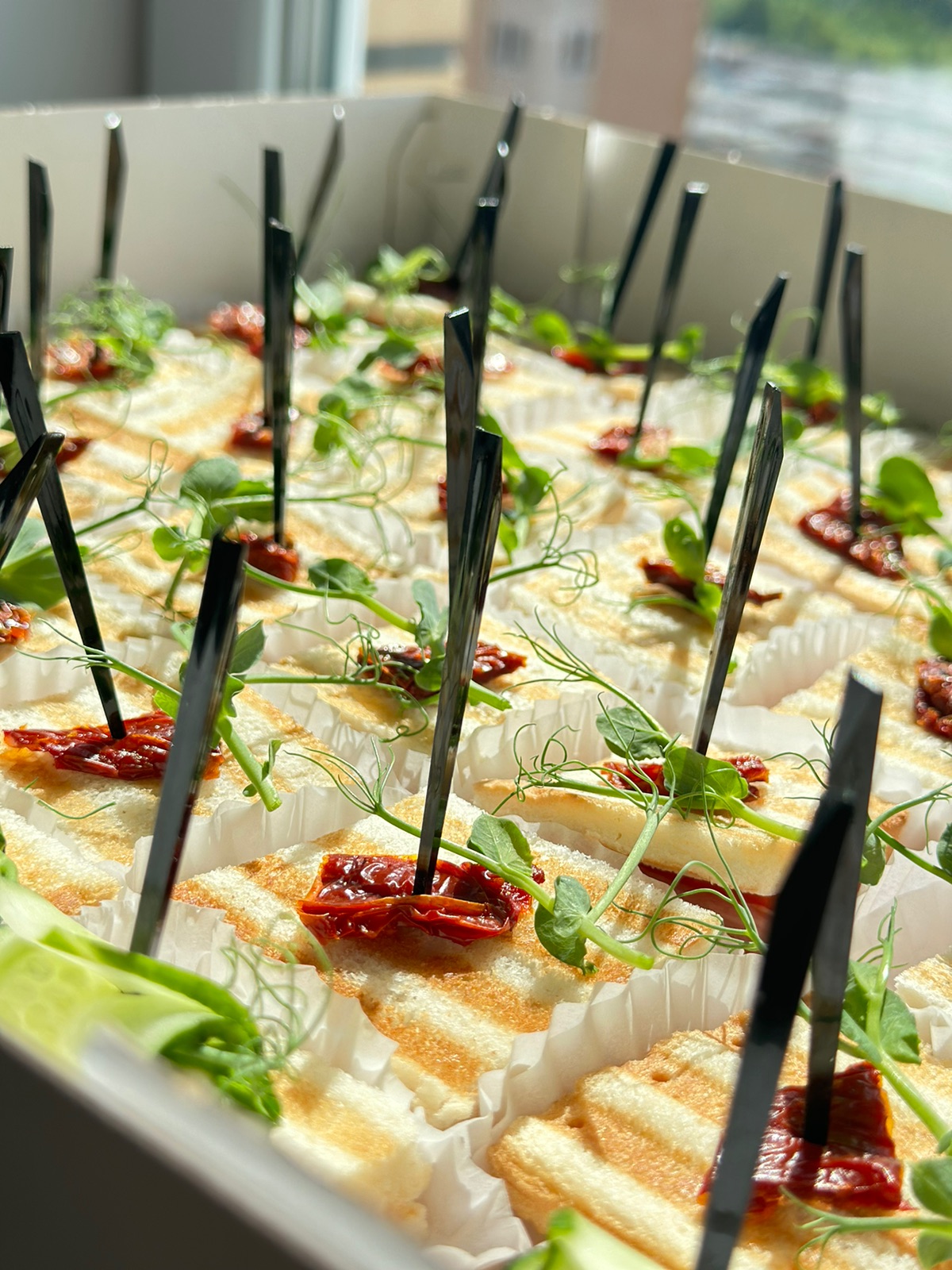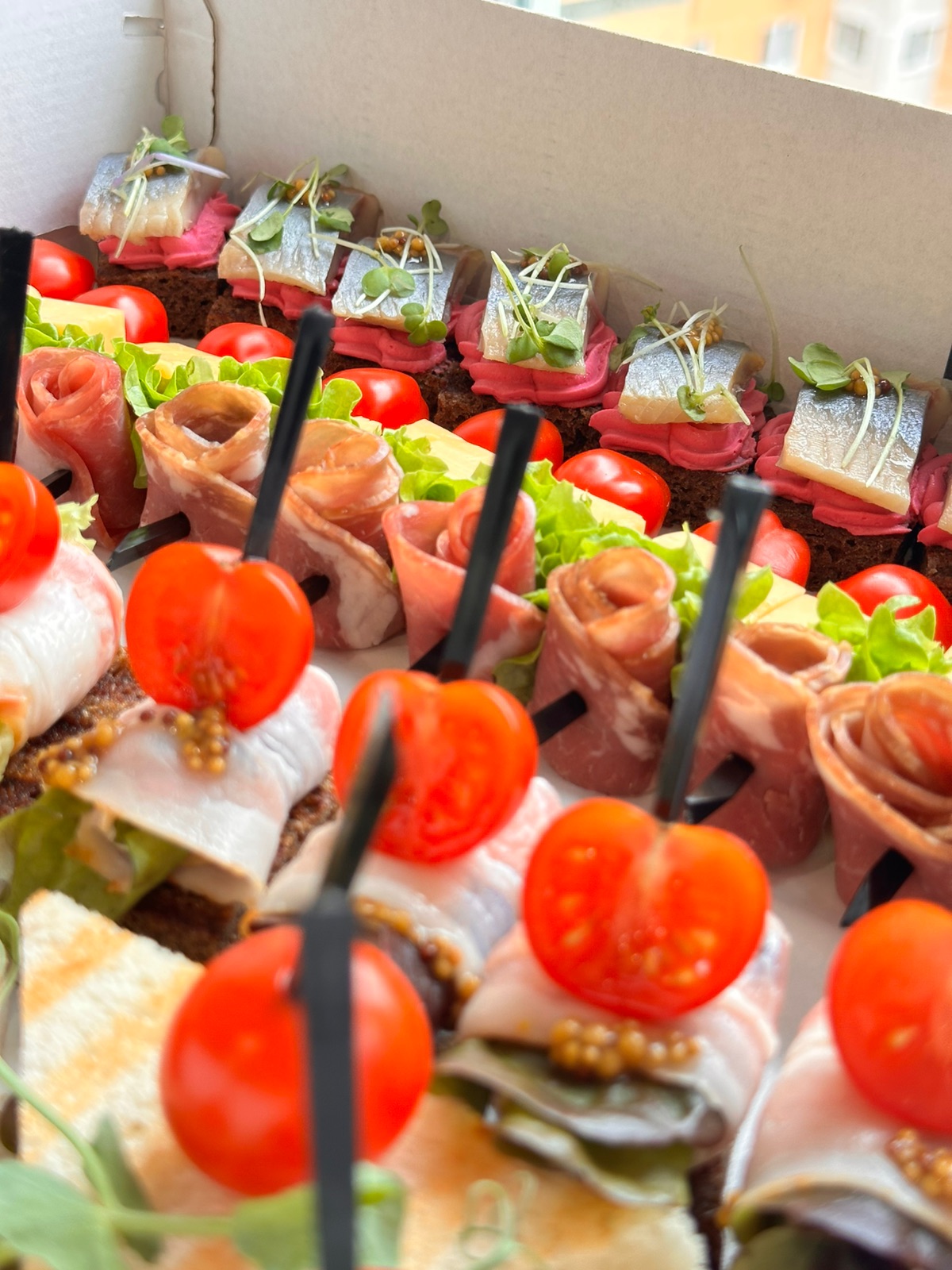 12 корзиночек фило с жюльеном, под щедрой шапкой сыра; 12 канапе огурчик с форелью; 12 канапе обожженный сальчисон с сырным шариком; 12 канапе с балыком, сыром и черри