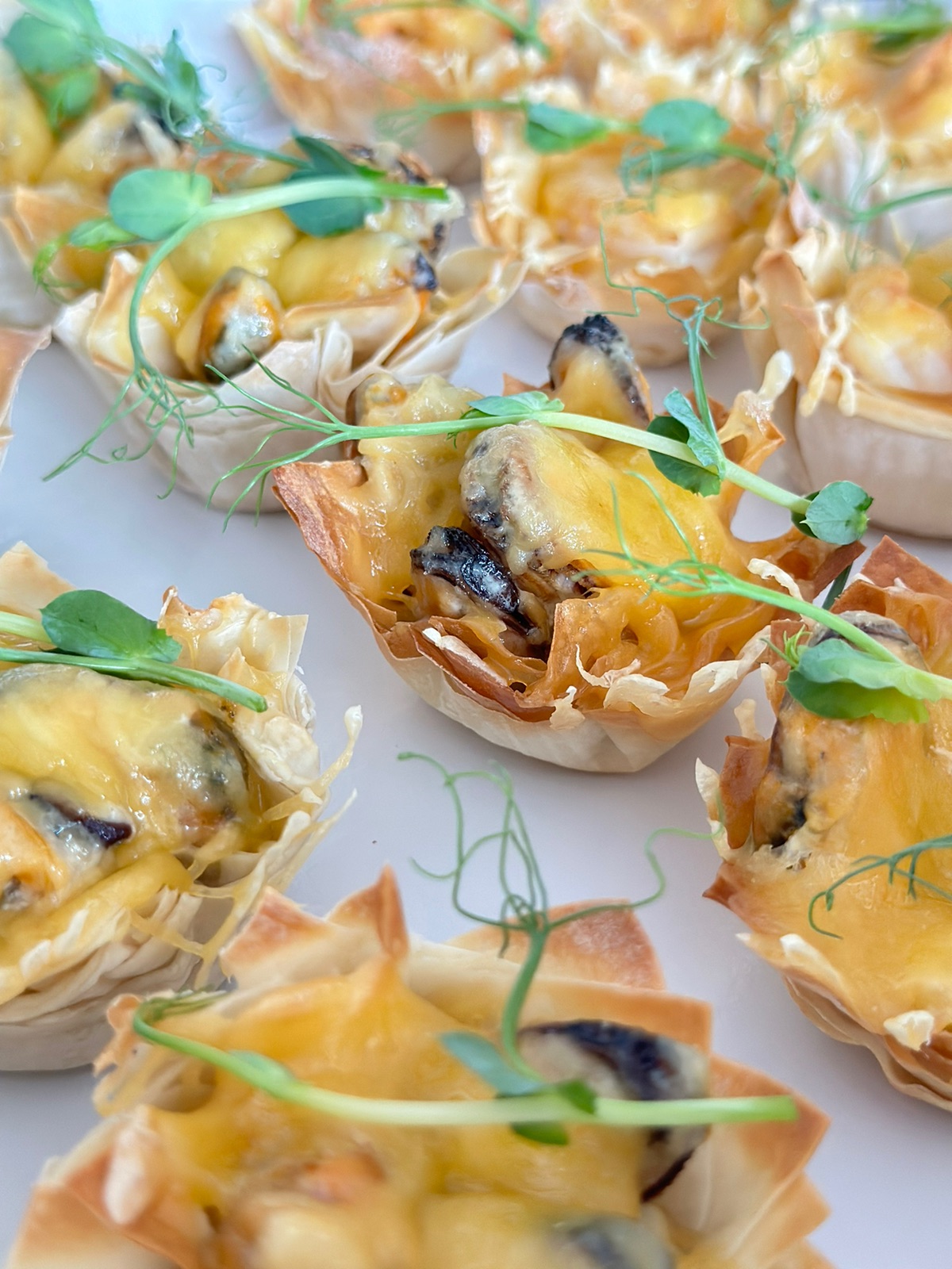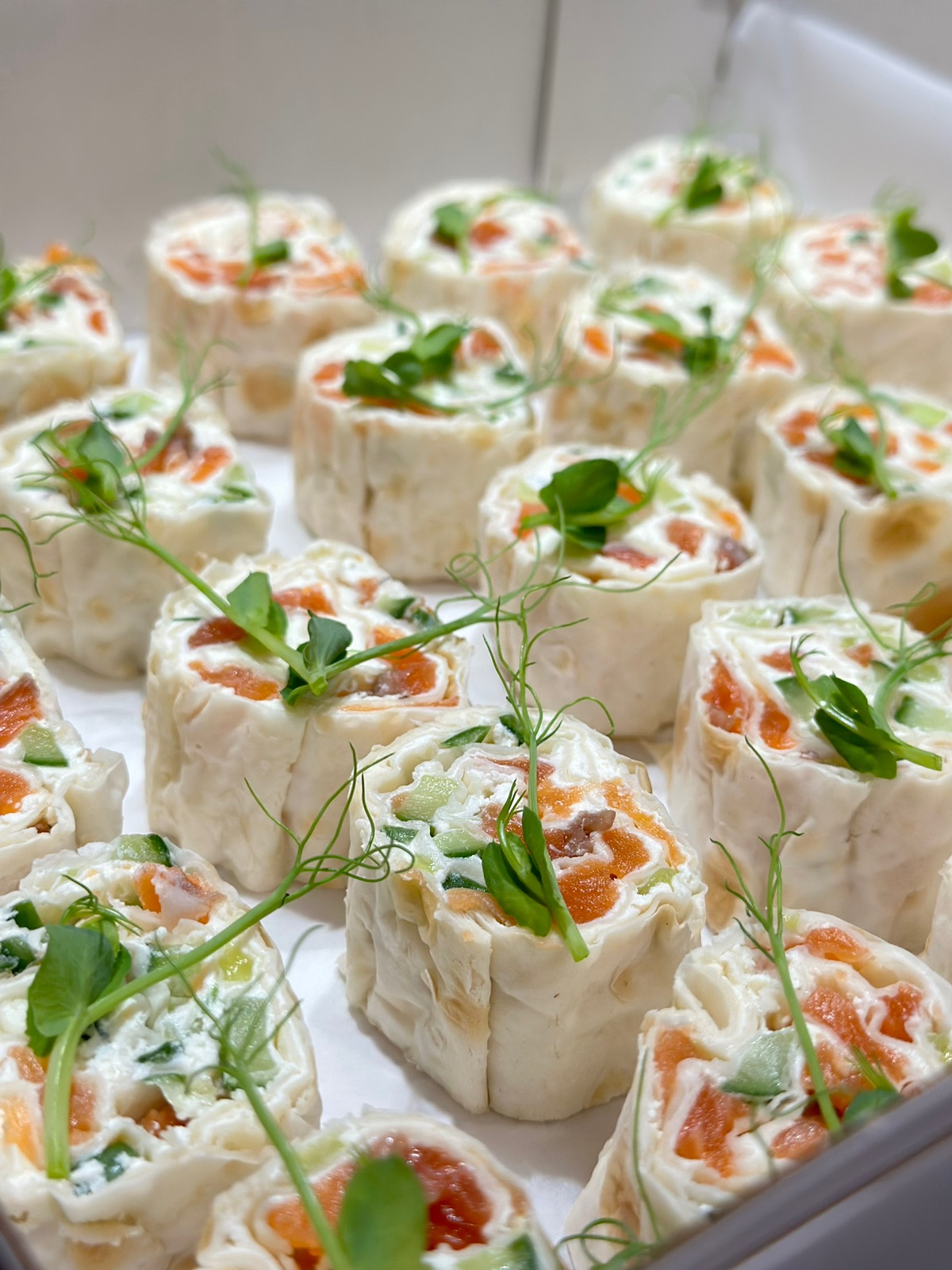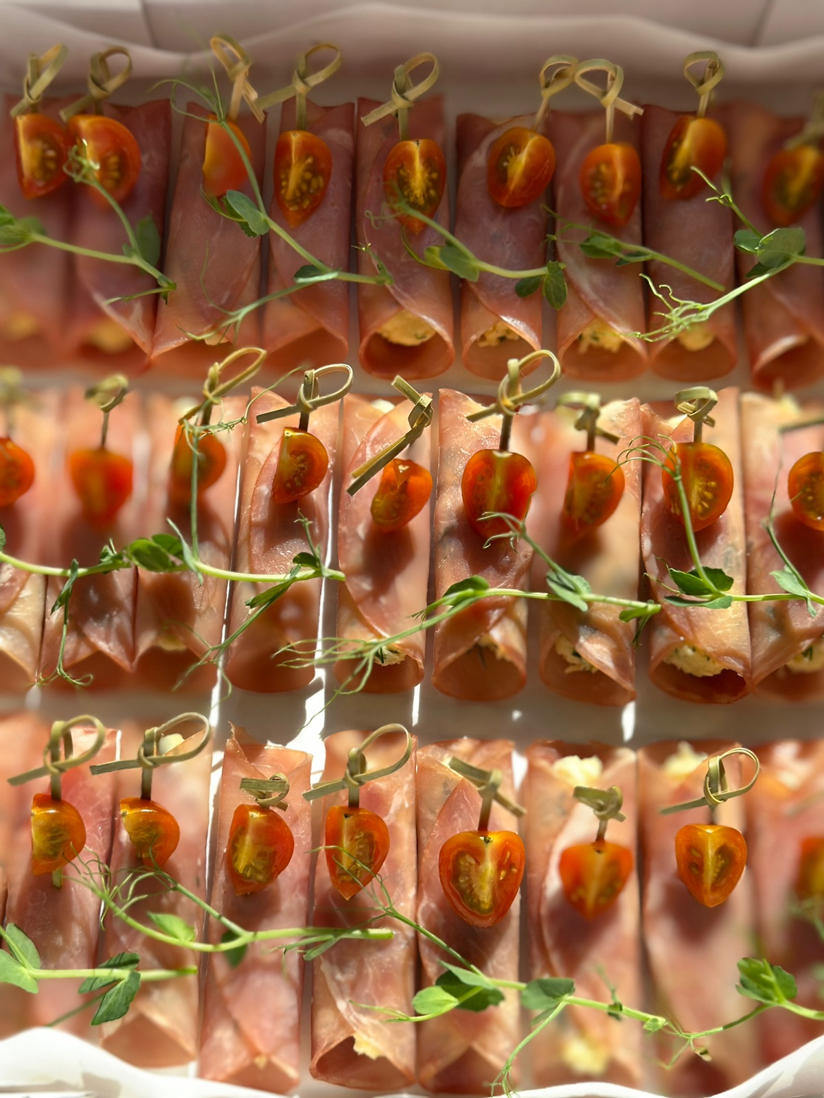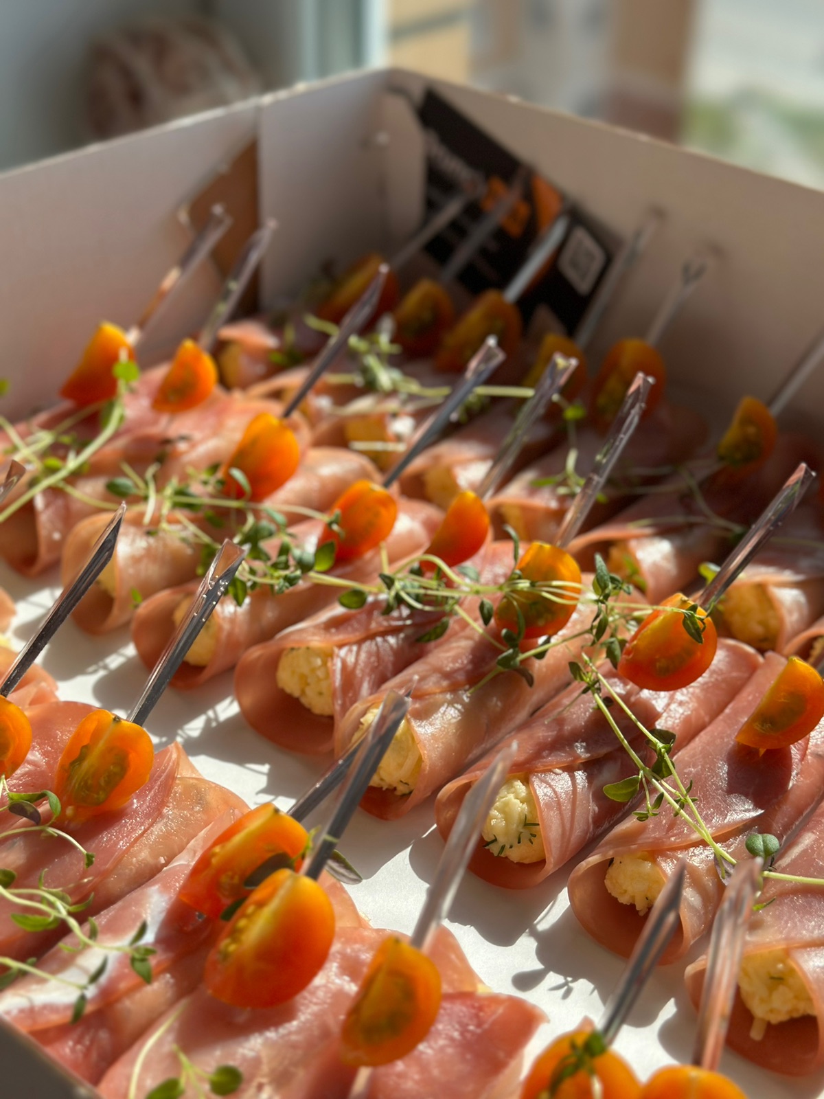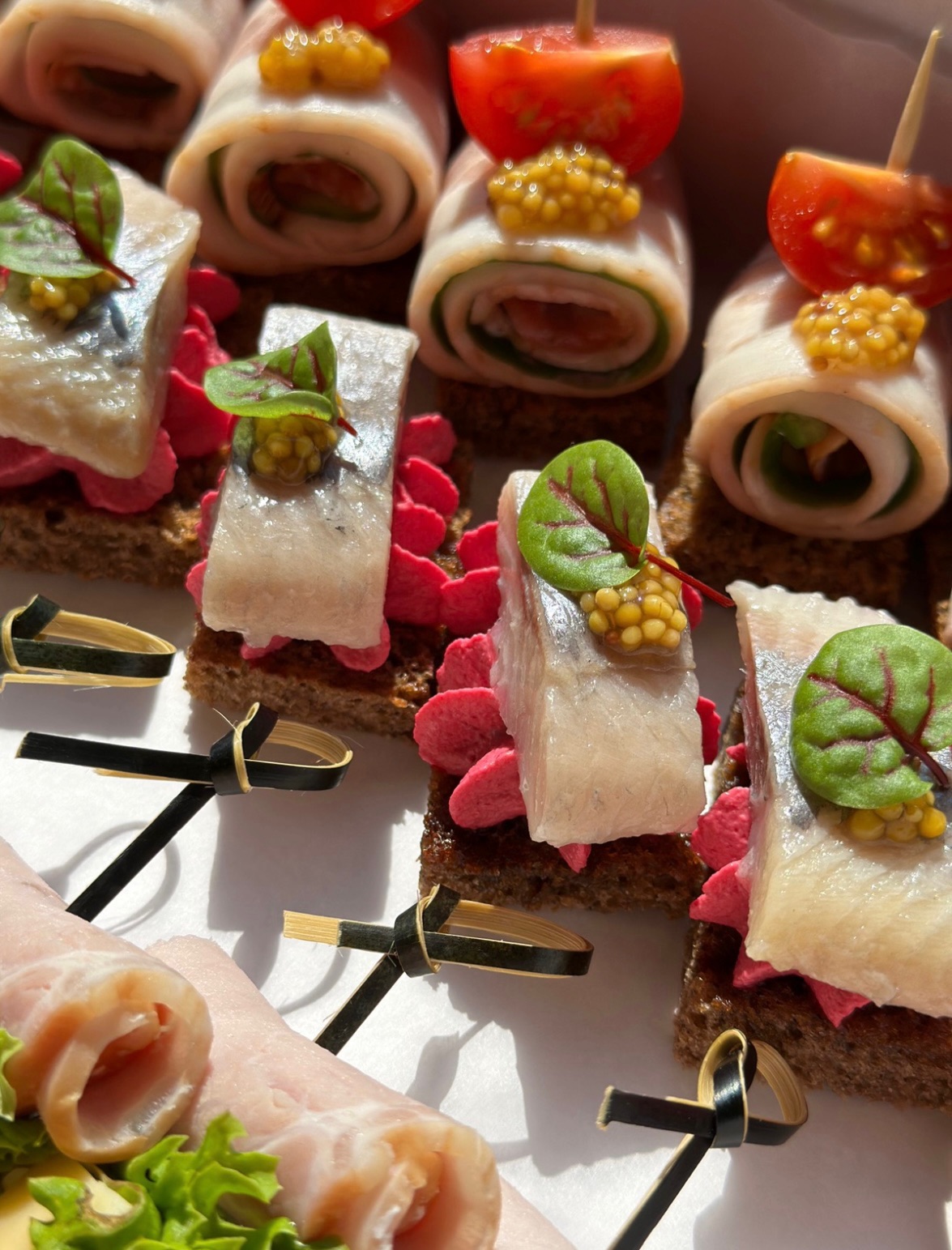12 корзиночек фило с жюльеном, под щедрой шапкой сыра; 12 канапе огурчик с форелью; 12 канапе обожженный сальчисон с сырным шариком; 12 канапе с балыком, сыром и черри