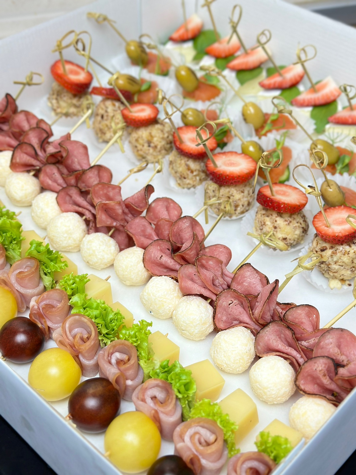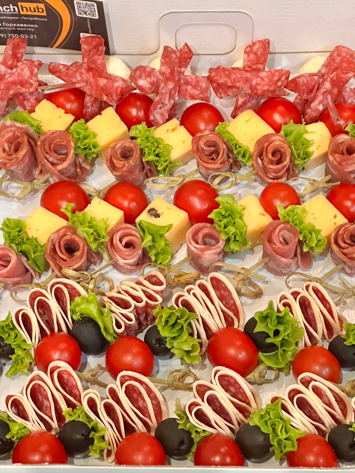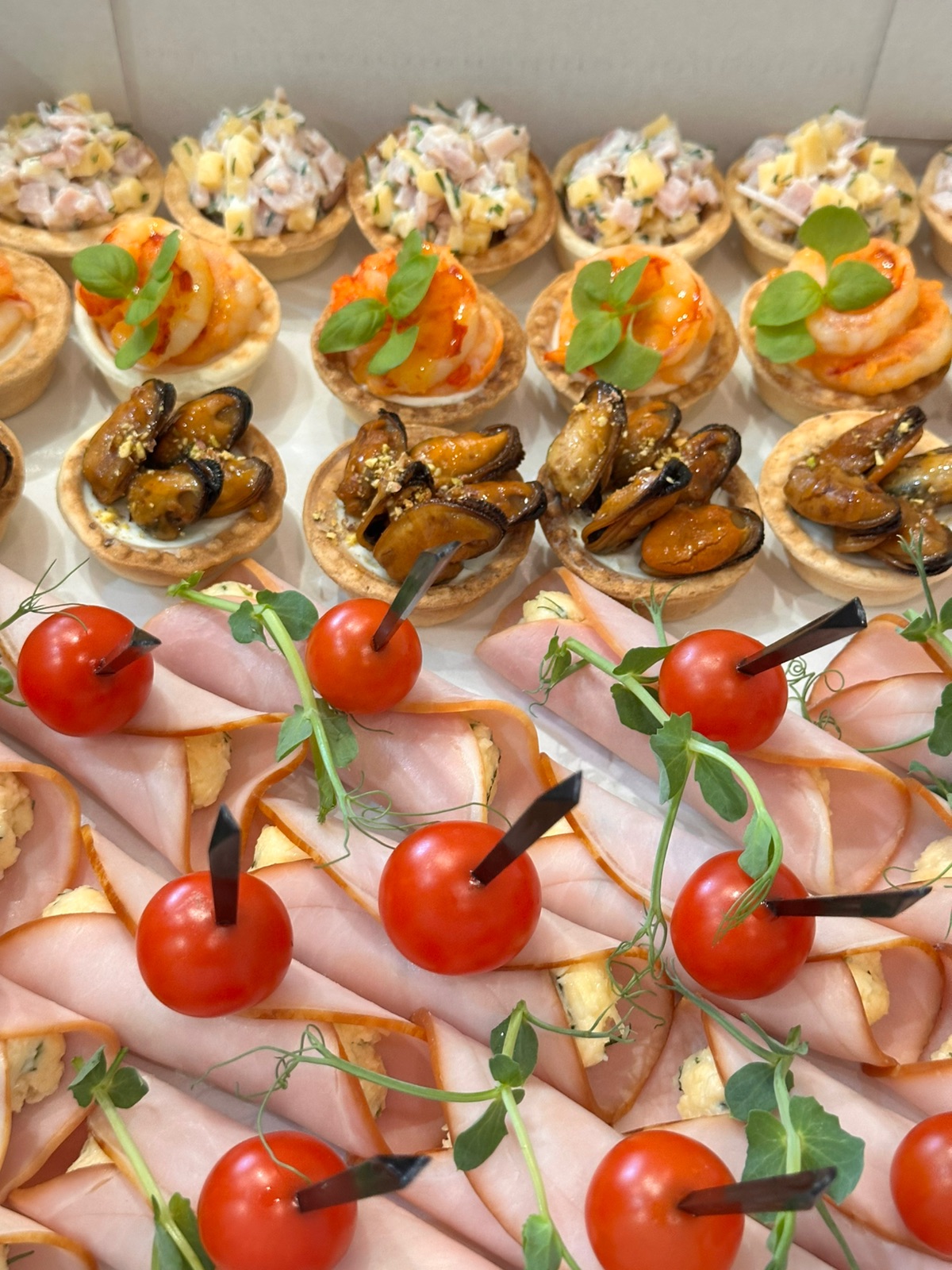 Груша с хамоном и вялеными томатами-10 шт; Канапе с салями, черри и оливкой -16 шт; Тарталетки с форелью и крем чез- 16 шт; Тарталетки с крем чиз и аргентинской креветкой-8 шт; Камамбер с сезонной ягодой - 16 шт