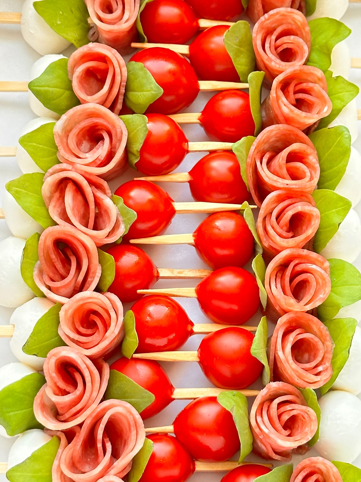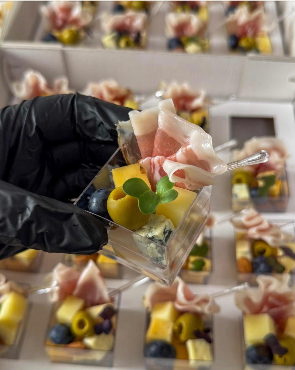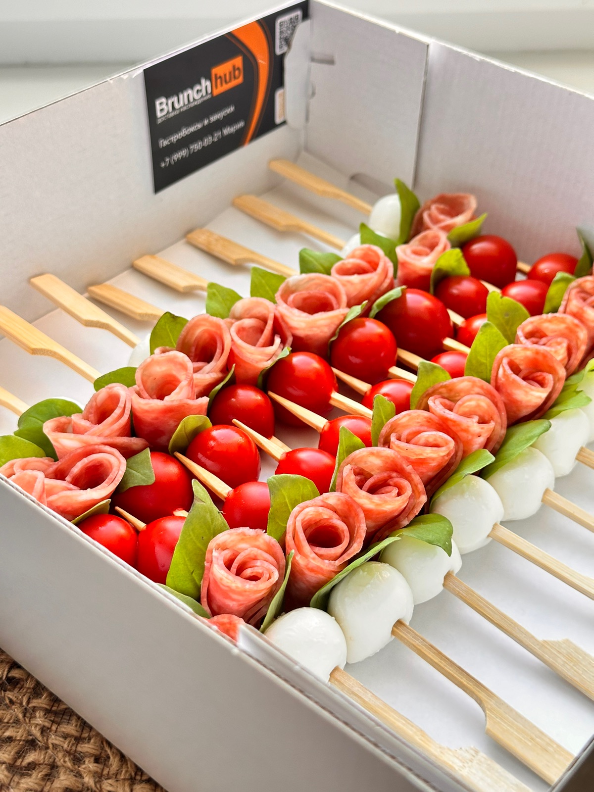 Груша с хамоном и вялеными томатами-10 шт; Канапе с салями, черри и оливкой -16 шт; Тарталетки с форелью и крем чез- 16 шт; Тарталетки с крем чиз и аргентинской креветкой-8 шт; Камамбер с сезонной ягодой - 16 шт