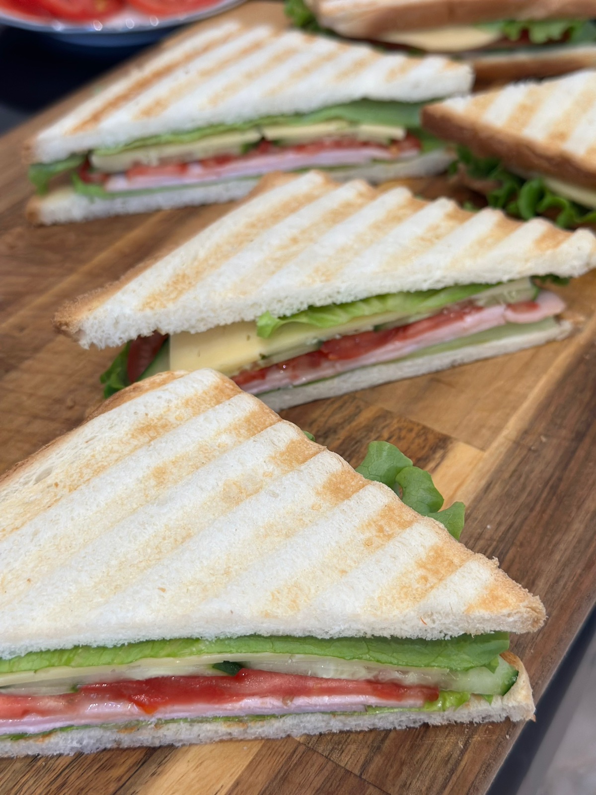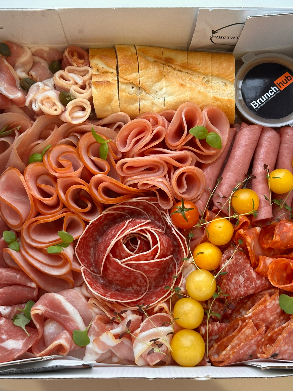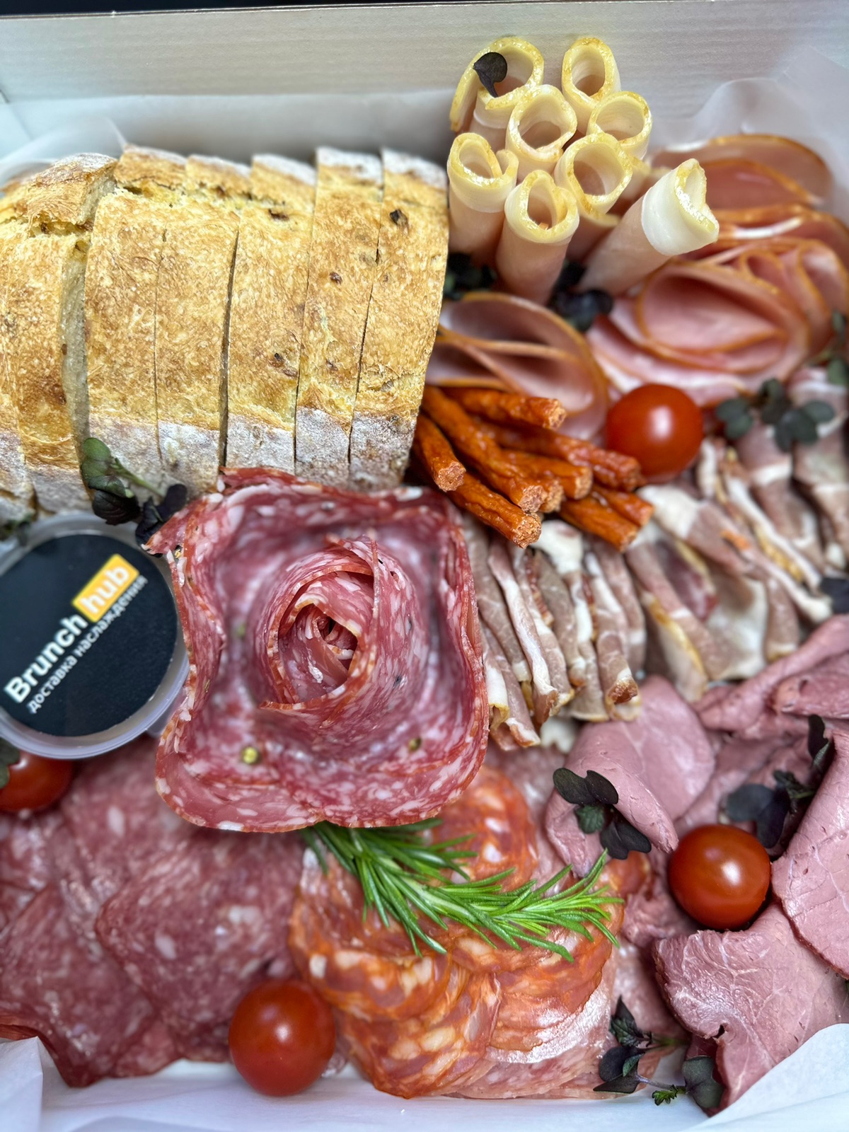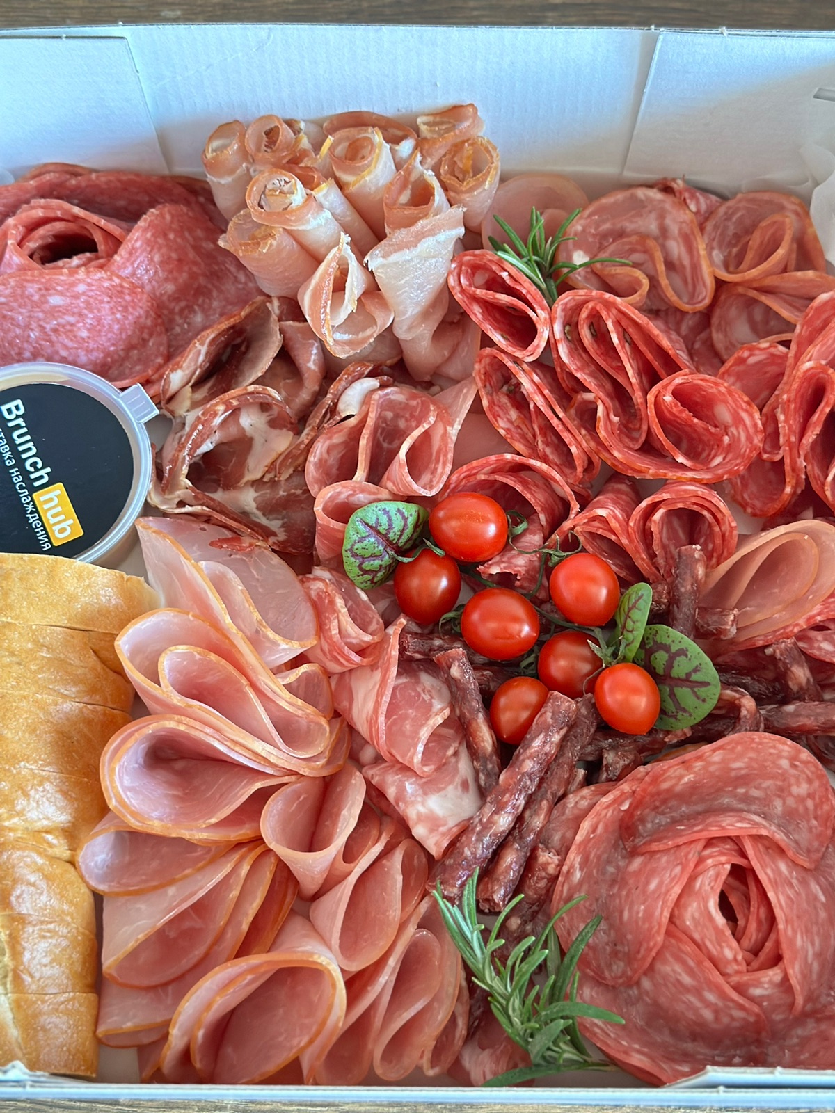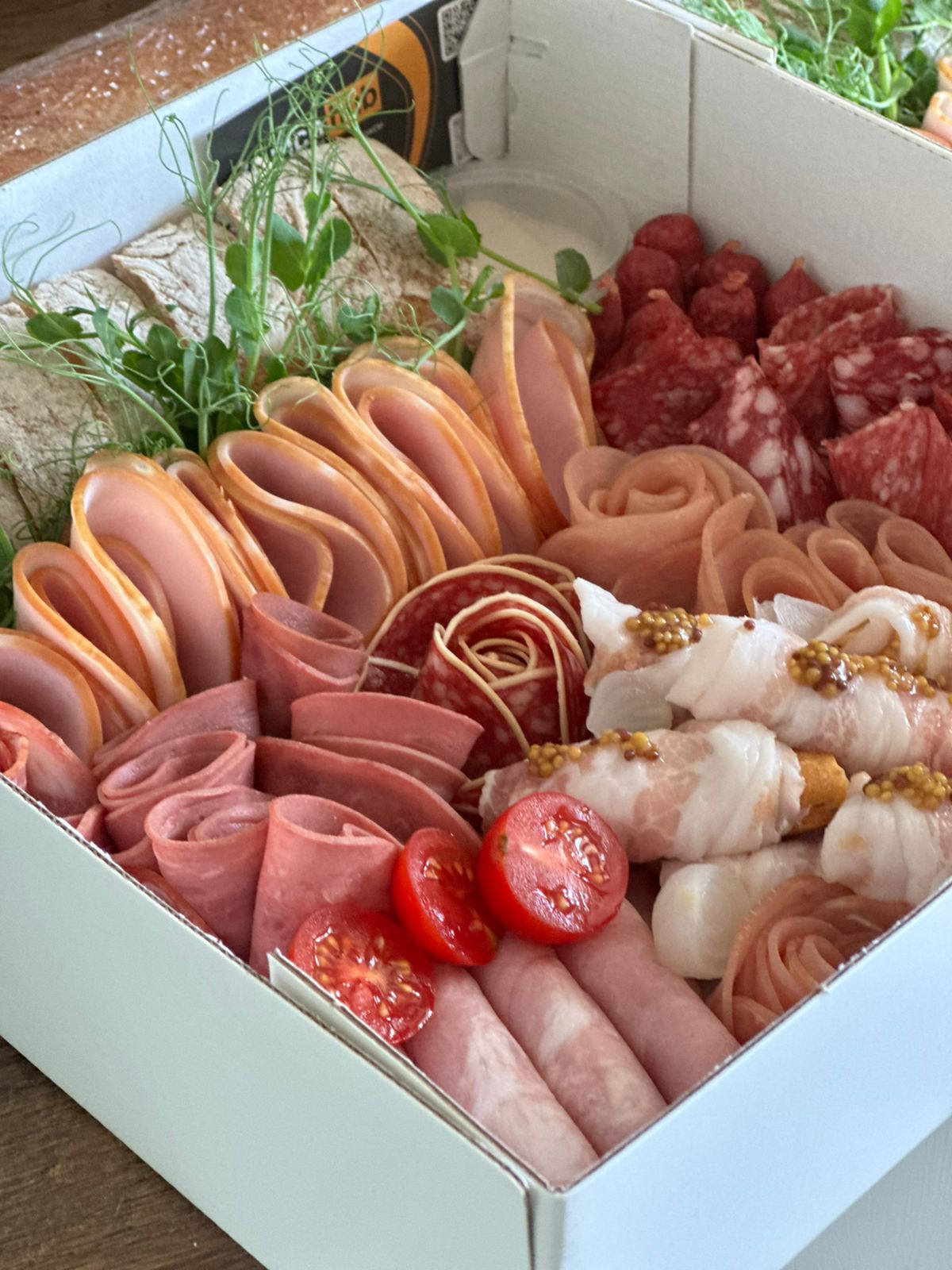 • Сало домашнее, корнишоны, лук на гренке из Бородинского хлеба • Клаб сэндвич с грудинкой и черри • Сальчисон со свежим огурцом и оливкой • Салями обоженная с сыром перлини • Карбонад с сыром, салатом и черри