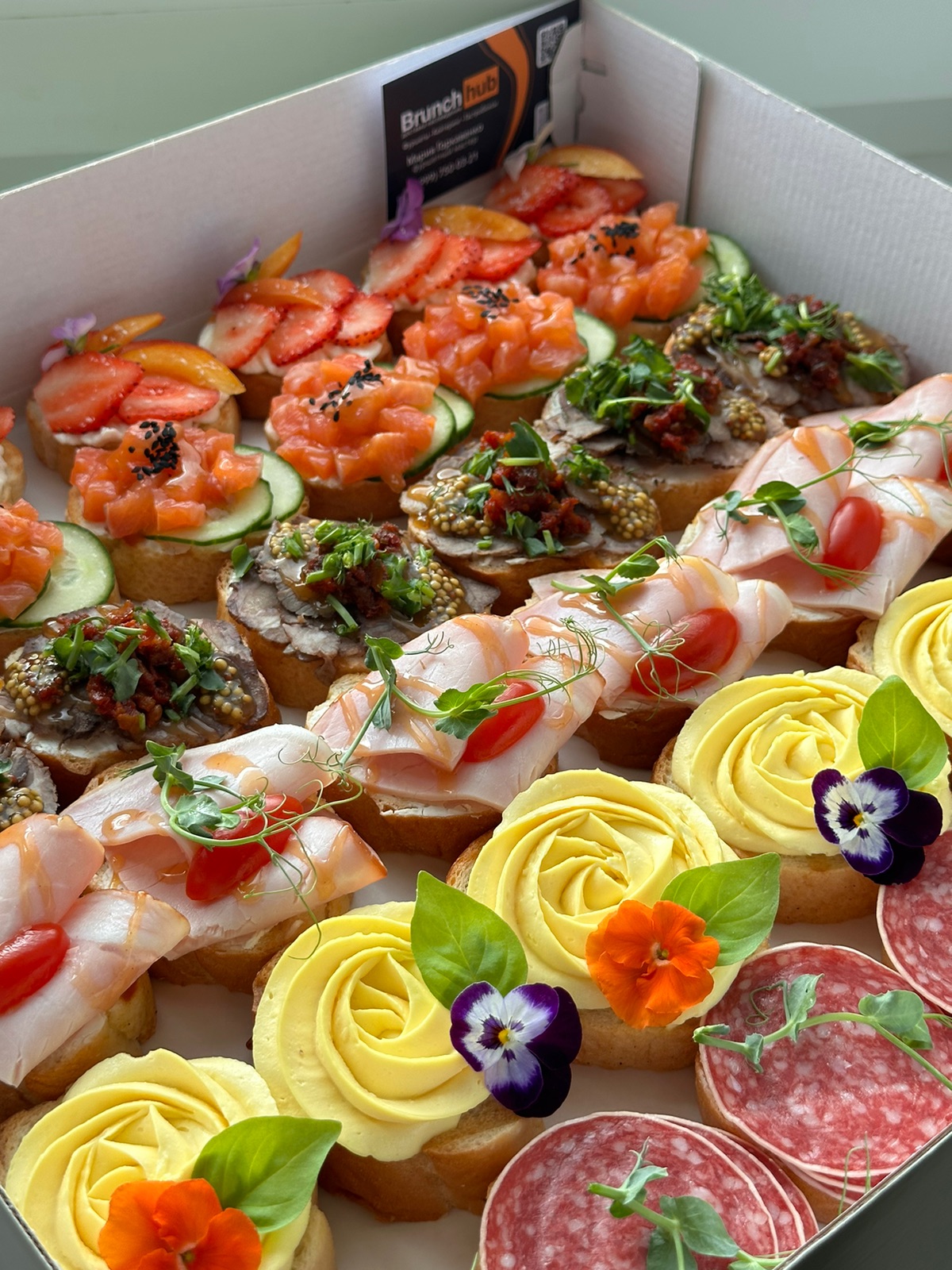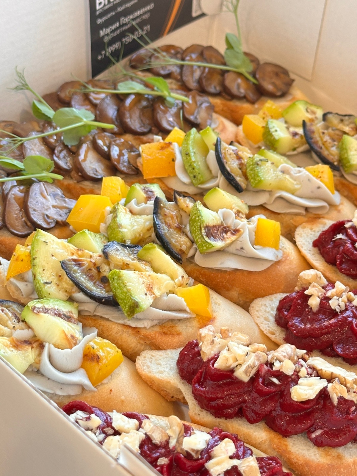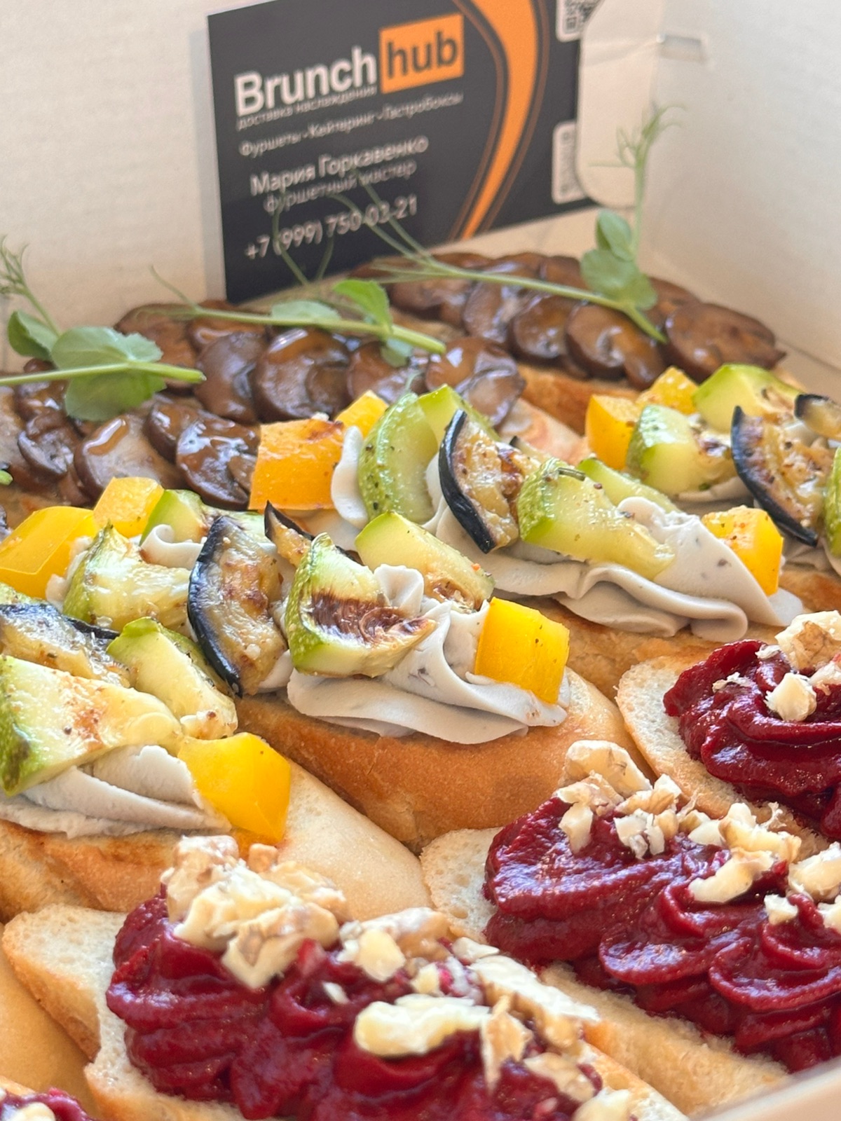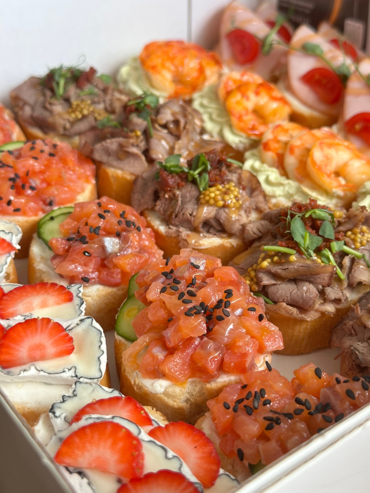 • 7 брускетт с говядиной, горчичкой, вялеными томатами и крем чиз • 7 брускетт с форелью, огурчиком и крем-чиз • 7 брускетт с аргентинскими креветками на муссе из авокадо • 7 брускетт с карбонадом, крем чиз, черри, кисло-сладким соусом и зеленью • 7 бри с медовой пипеткой и сезонными фруктом или ягодой