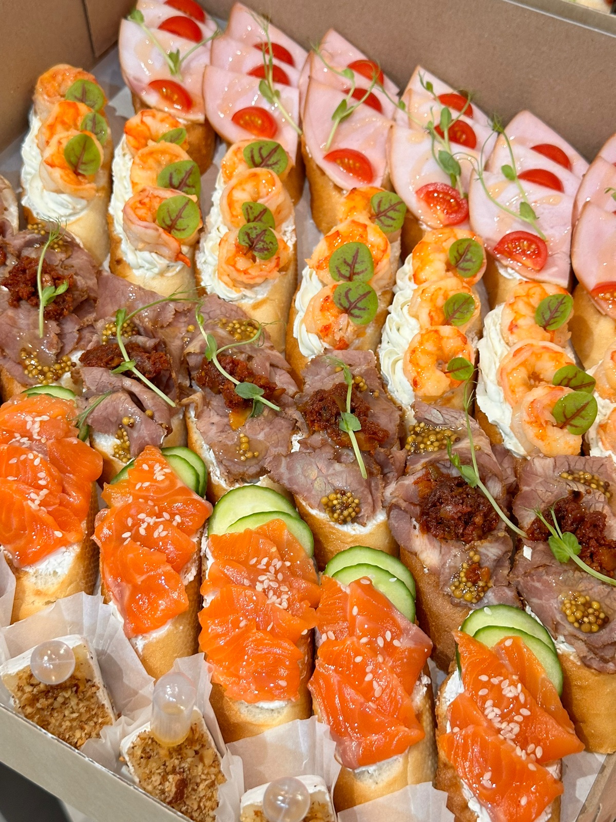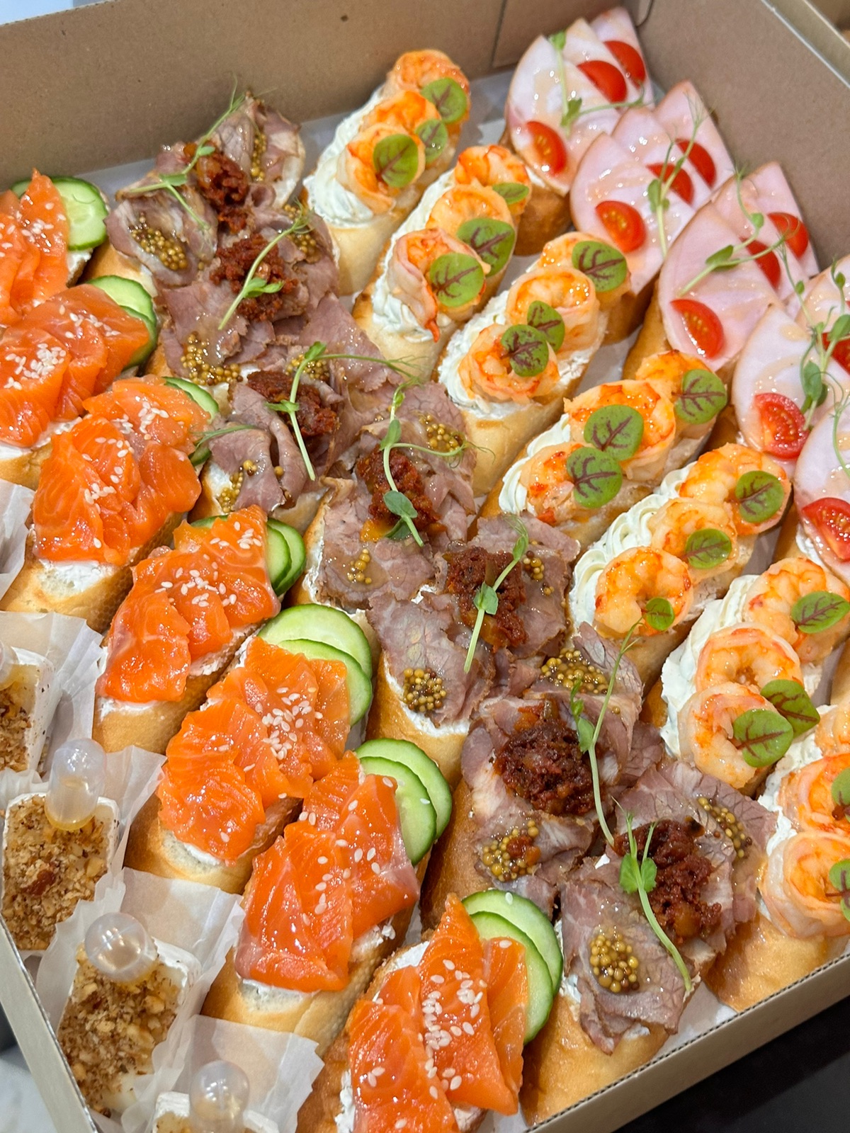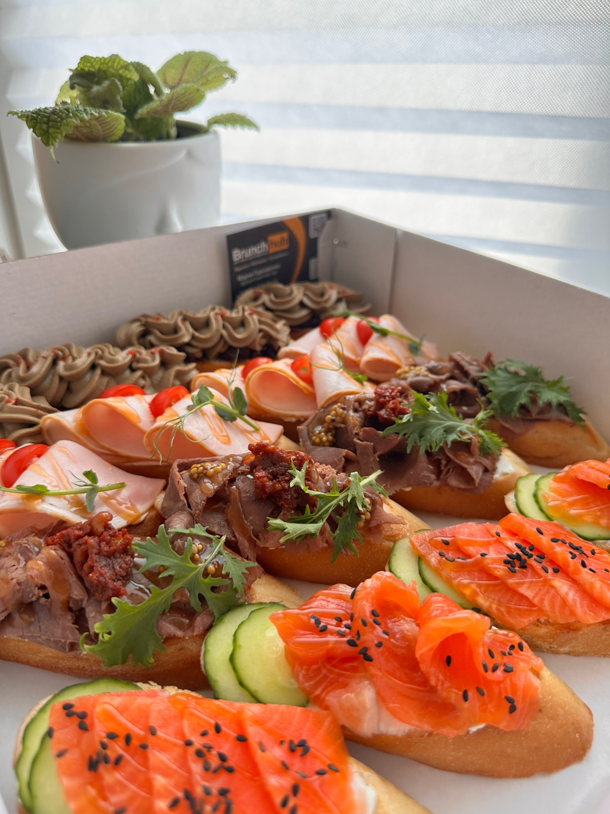 • 7 брускетт с говядиной, горчичкой, вялеными томатами и крем чиз • 7 брускетт с форелью, огурчиком и крем-чиз • 7 брускетт с аргентинскими креветками на муссе из авокадо • 7 брускетт с карбонадом, крем чиз, черри, кисло-сладким соусом и зеленью • 7 бри с медовой пипеткой и сезонными фруктом или ягодой