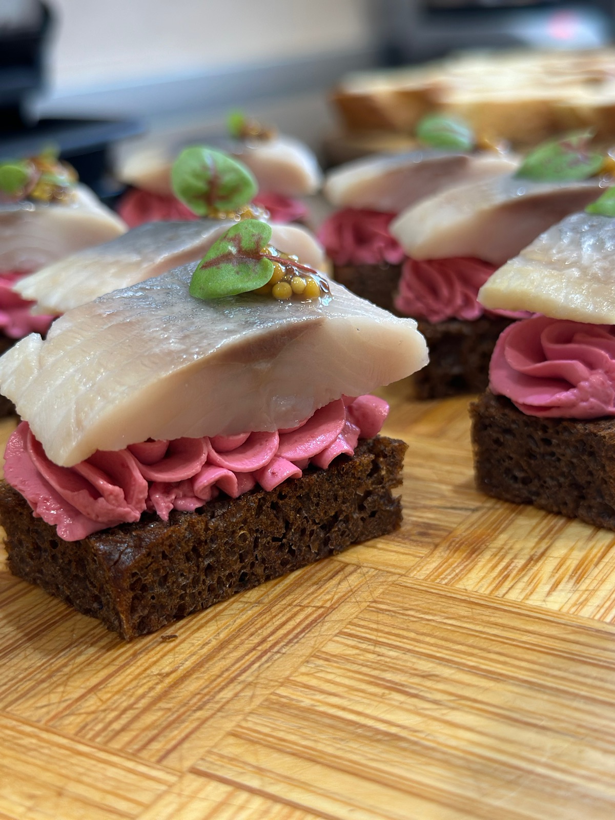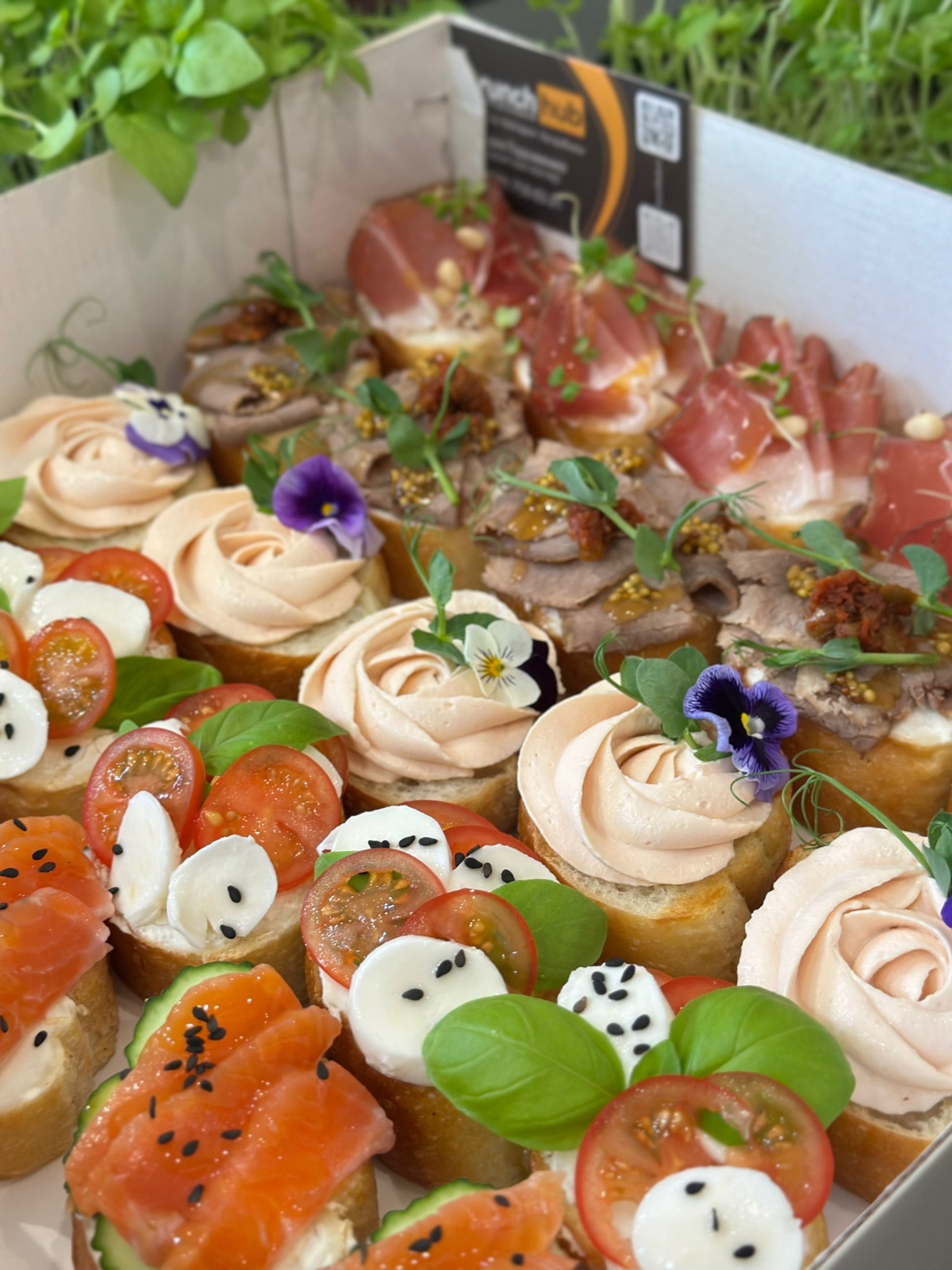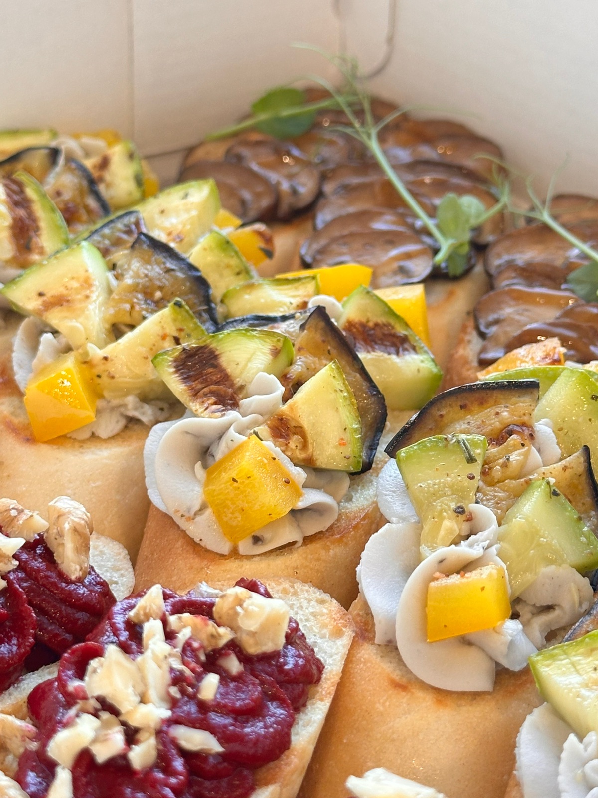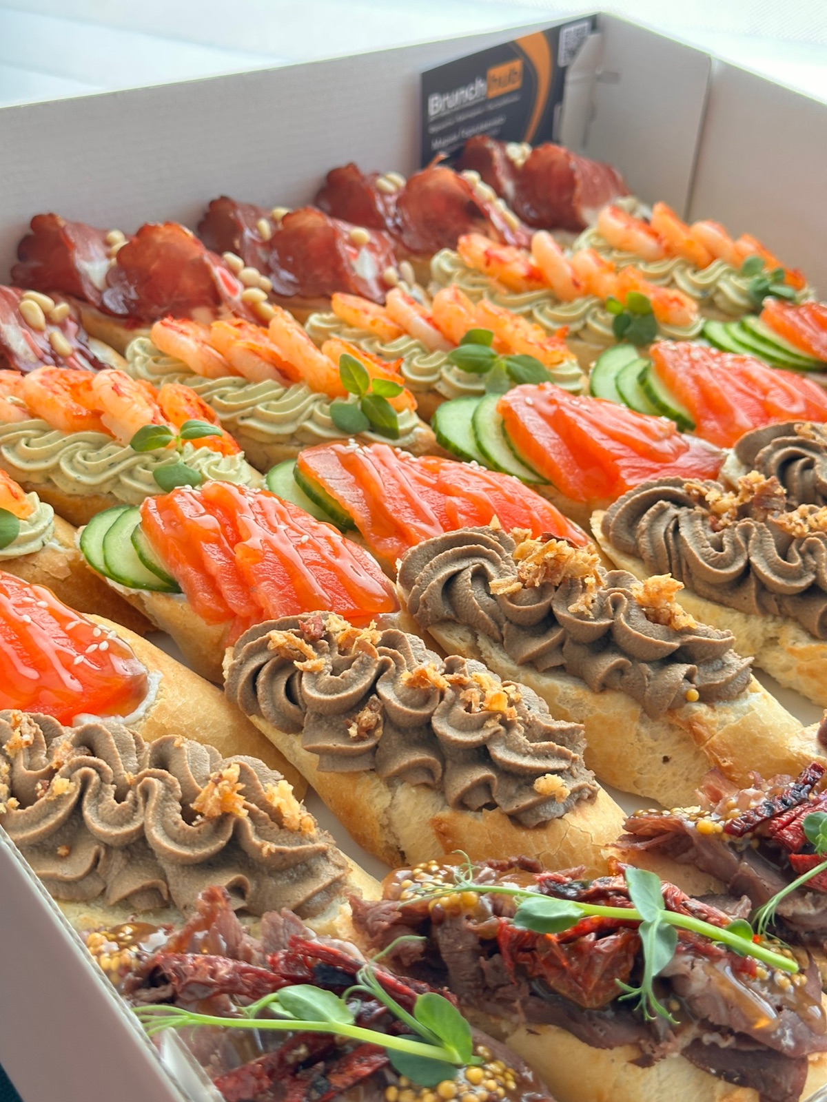 • 7 брускетт с говядиной, горчичкой, вялеными томатами и крем чиз • 7 брускетт с форелью, огурчиком и крем-чиз • 7 брускетт с аргентинскими креветками на муссе из авокадо • 7 брускетт с карбонадом, крем чиз, черри, кисло-сладким соусом и зеленью • 7 бри с медовой пипеткой и сезонными фруктом или ягодой