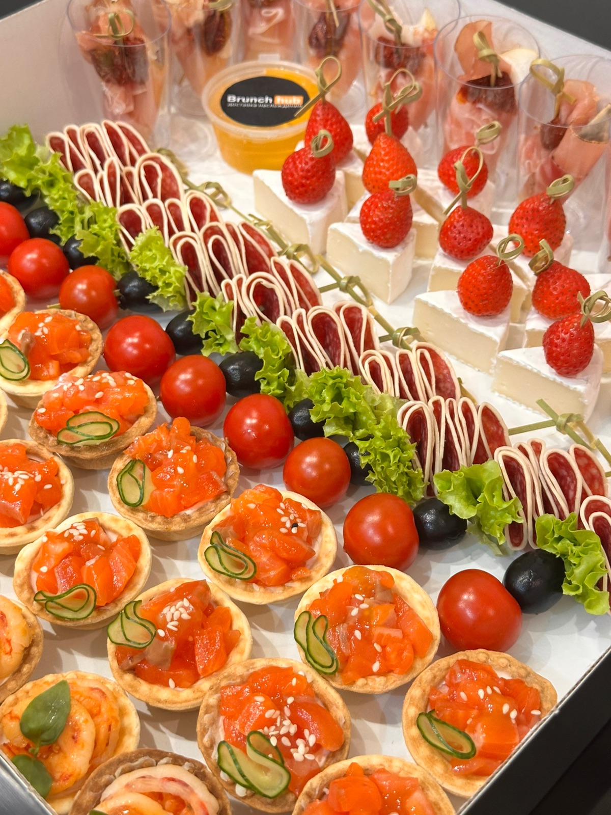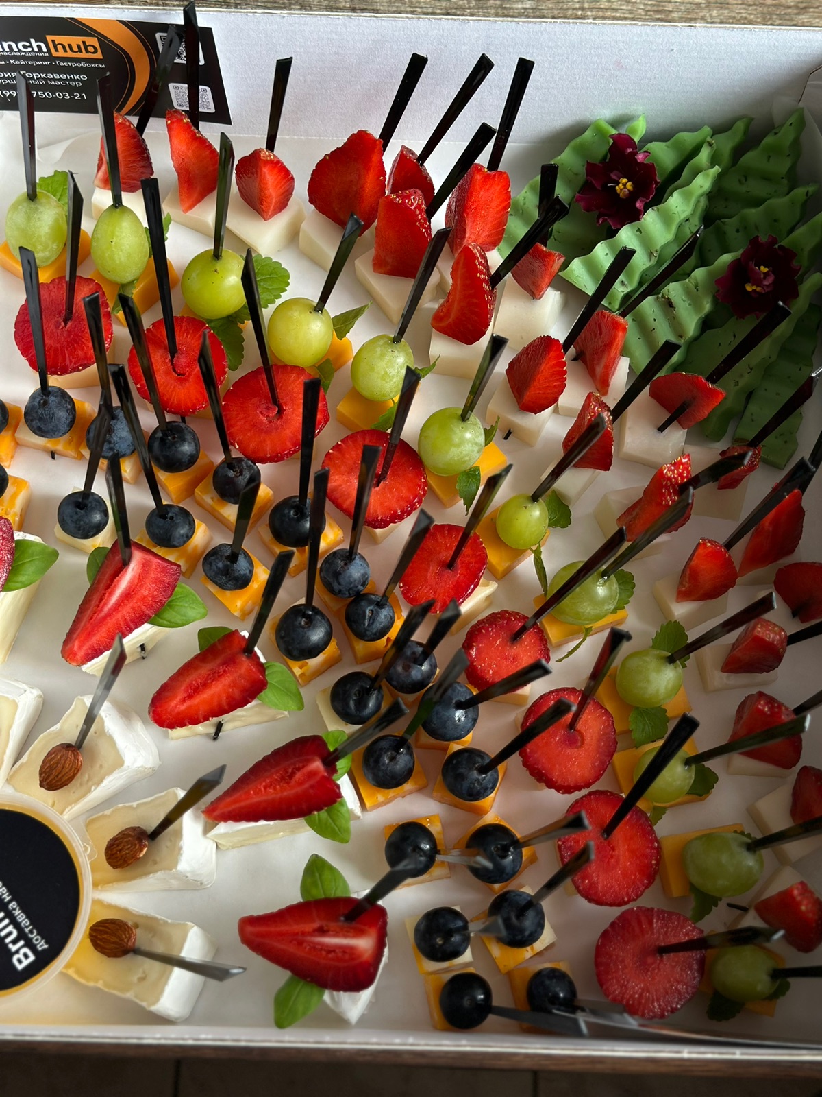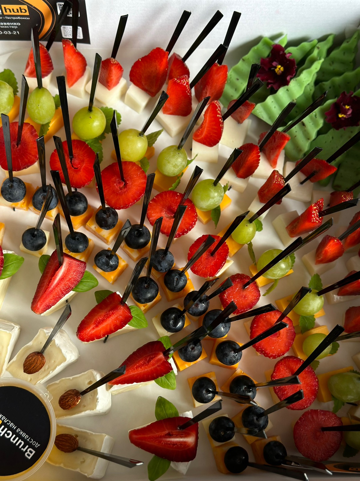 • Канапе клаб с лососем • Тарталетки с крем чиз и лососем • Сыр камамбер с сезонной ягодой • Канапе балык, черри и моцарелла • Твердый сыр с виноградом