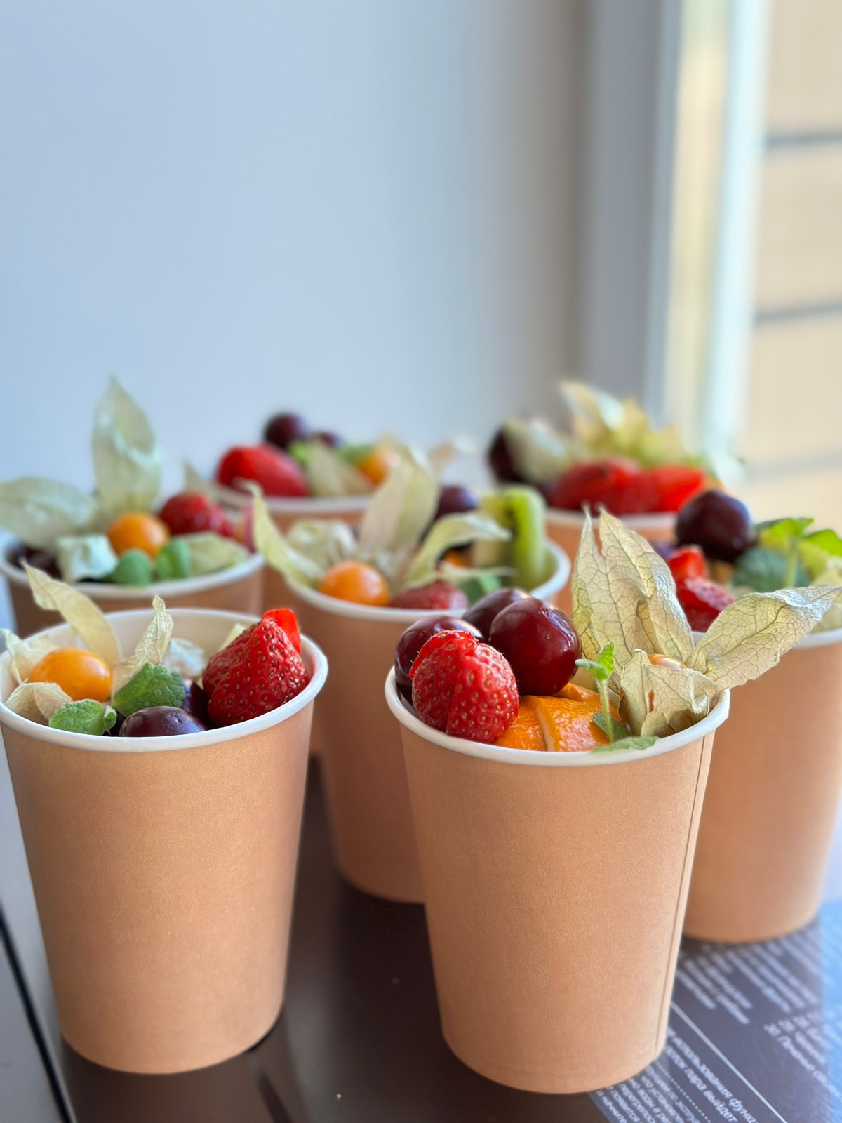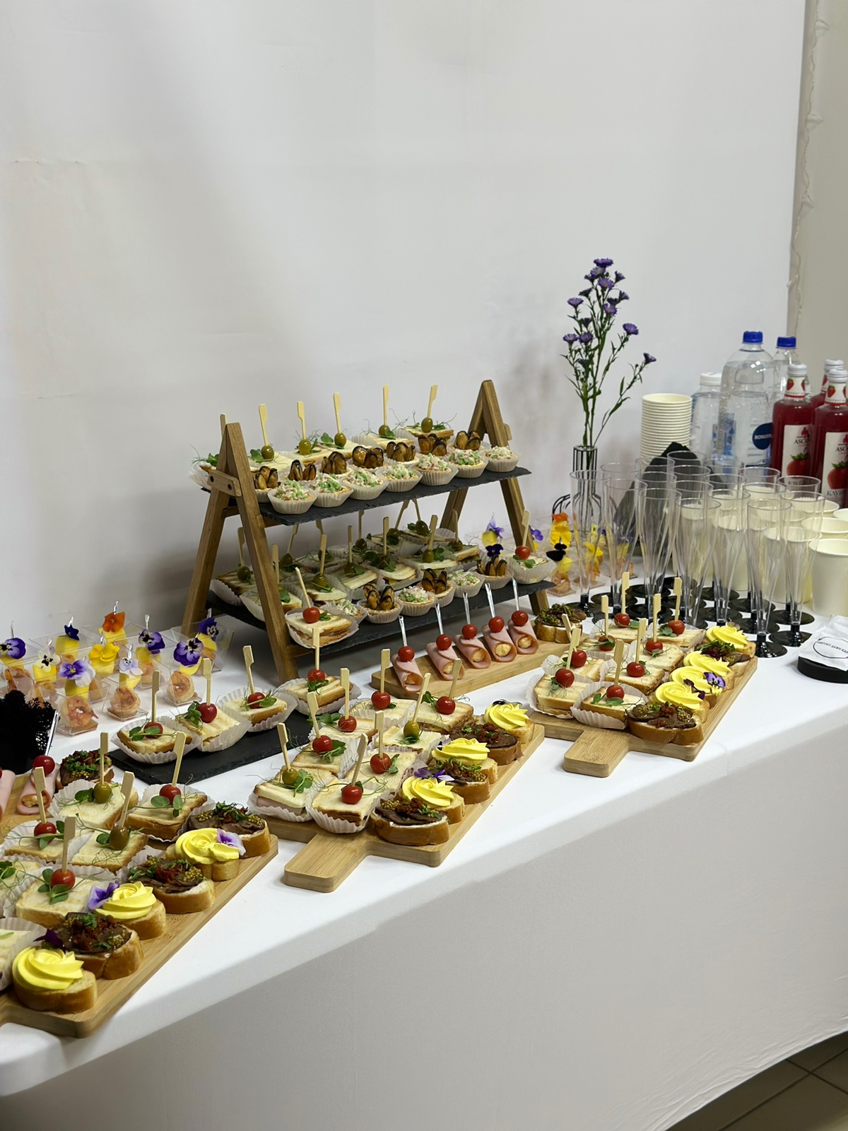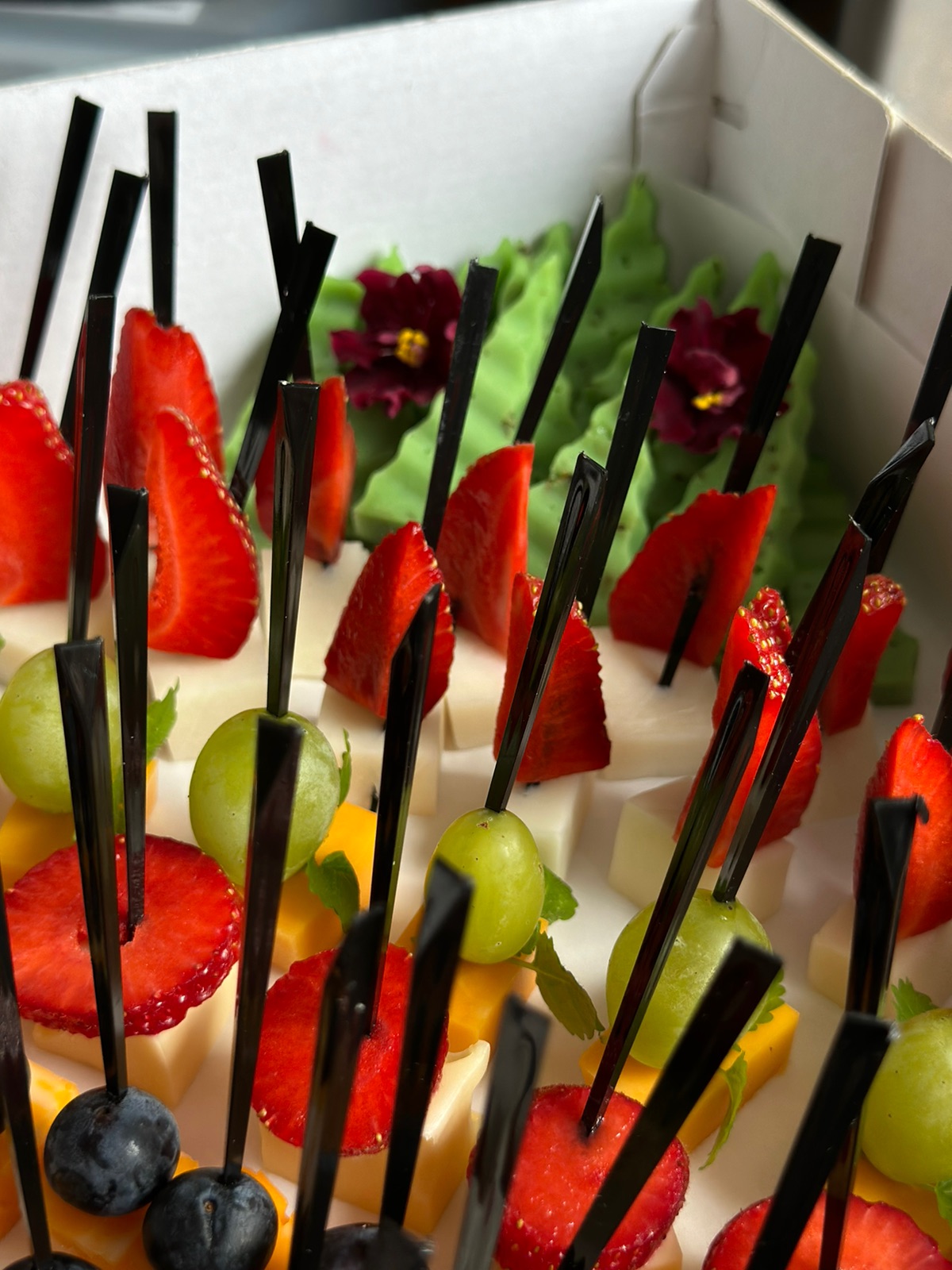 • Канапе клаб с лососем • Тарталетки с крем чиз и лососем • Сыр камамбер с сезонной ягодой • Канапе балык, черри и моцарелла • Твердый сыр с виноградом