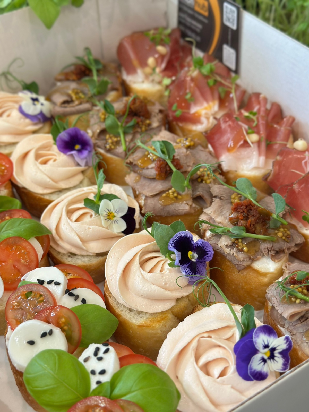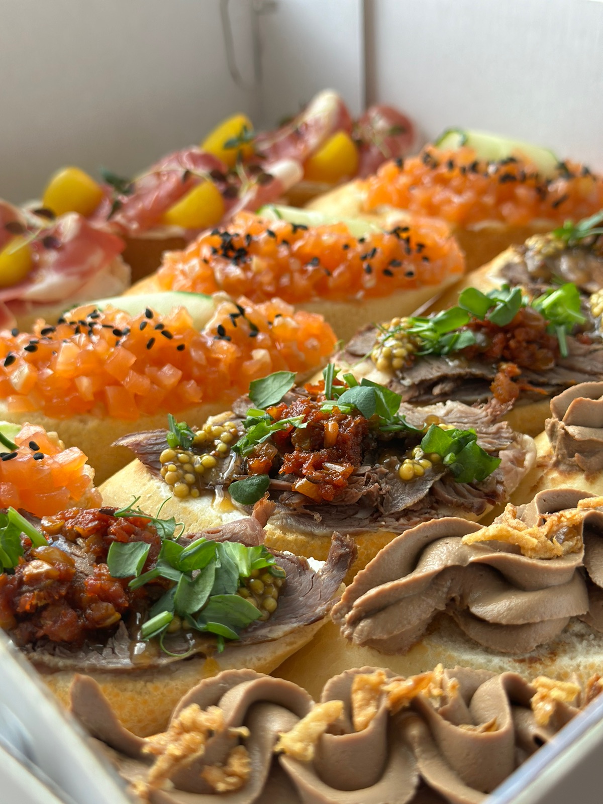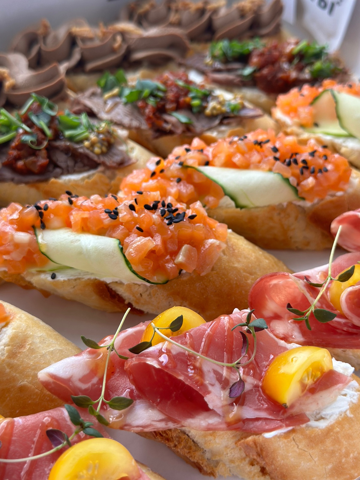 6 кростини с говядиной, вялеными томатами и горчичкой 6 с форелью и огурчиком 6 с хамоном и орехами 6 моцарелла с черри 6 с панчеттой 6 с грибами на чесночном масле