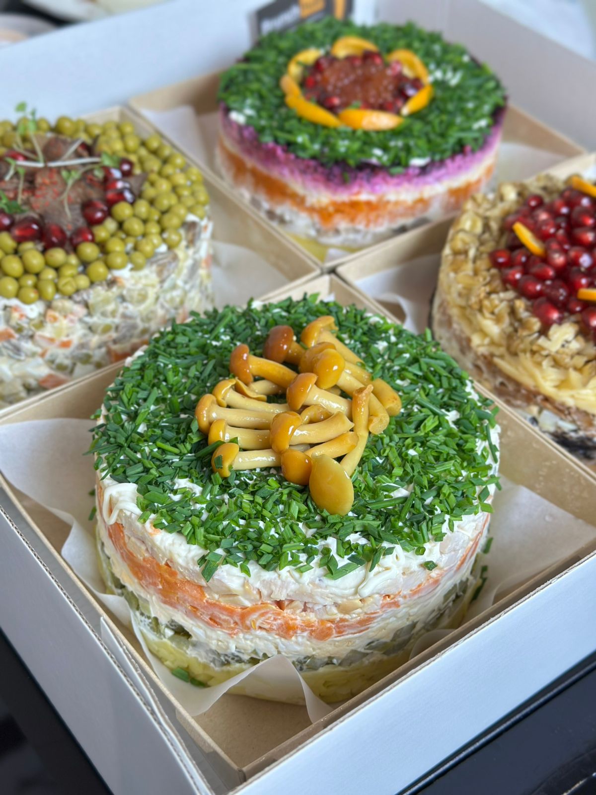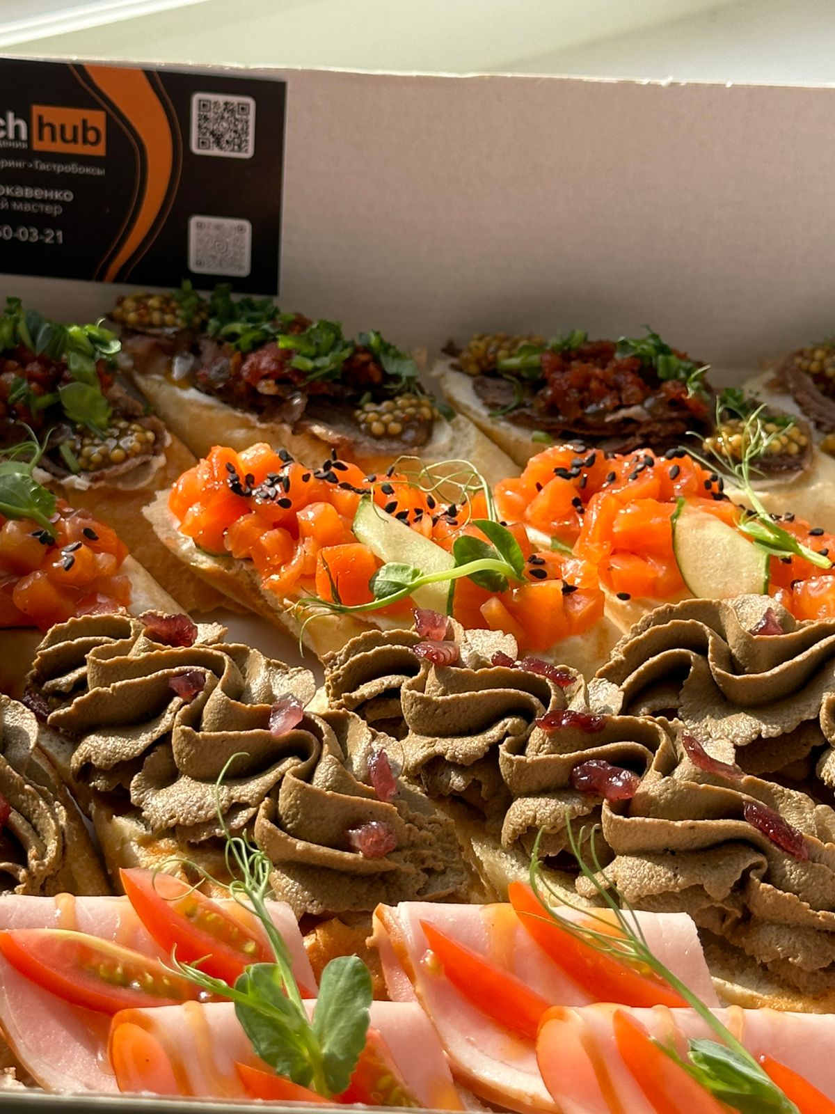 Кростини с тар-тар из форели в медово -горчичном соусе -10 шт; Кростини с томленой говядиной, красным луком и корнишонами- 10 шт; Тако биг мак - 15 шт; Канапе с Фетой, перчиком, оливкой и салями -10 шт; Канапе с шейкой , вяленым томатом и крем чиз- 10 шт; Бородинские гренки, сало, русская горчица и корнишоны- 1 ярус.