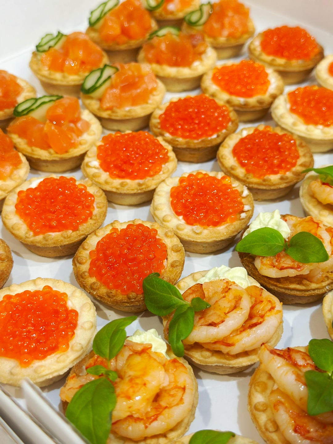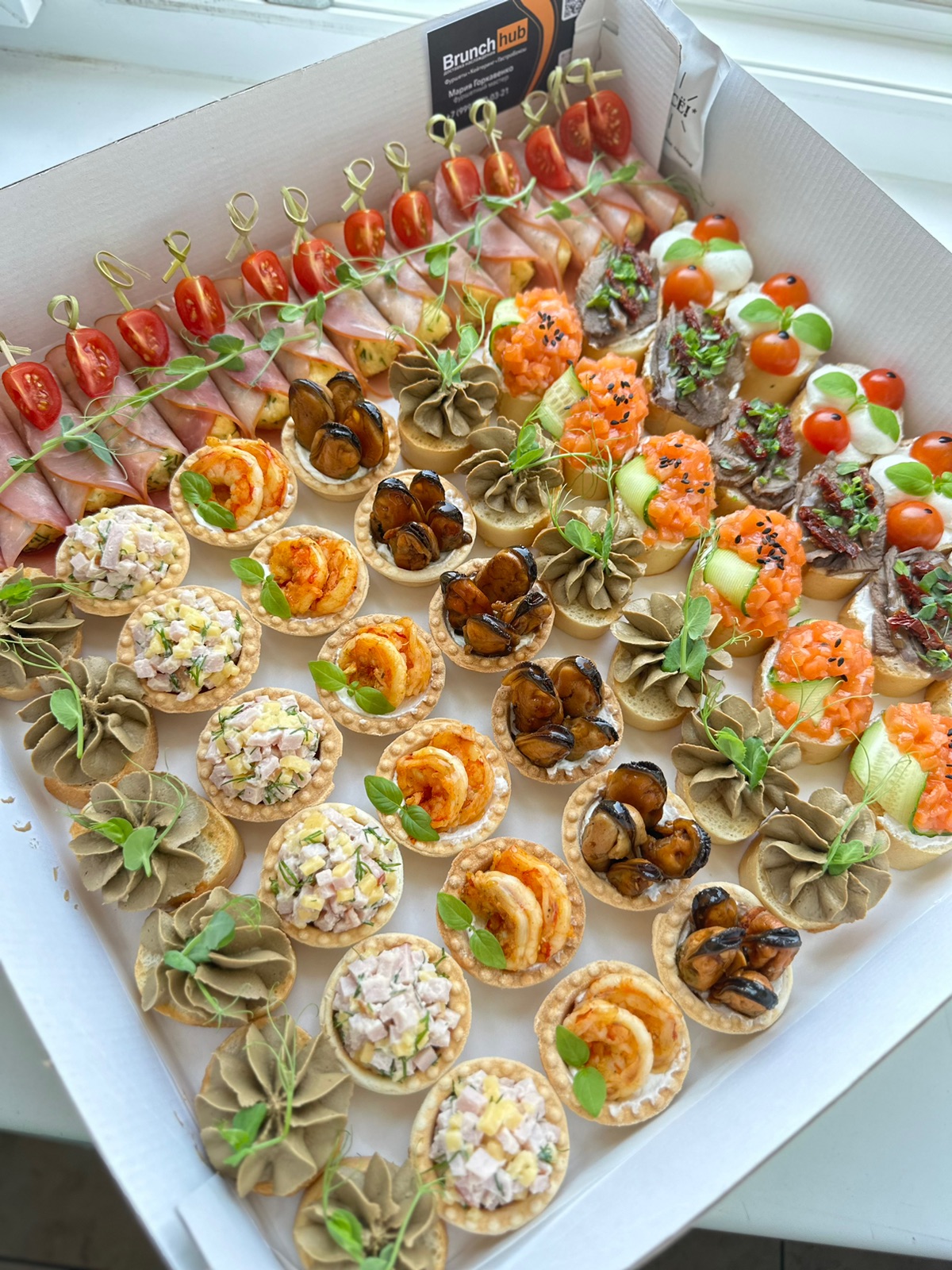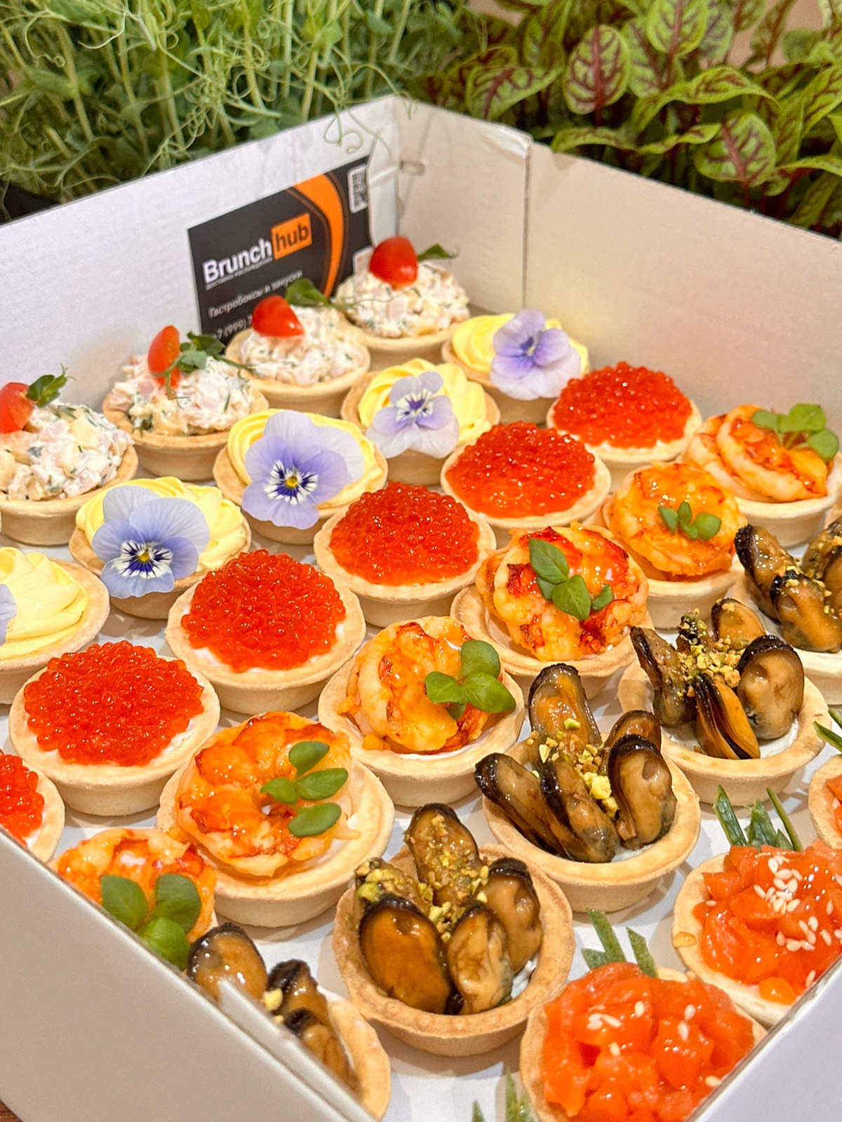 Тарталетки с икрой 7 шт; Тарталетки с аргентинской креветкой 7 шт; Кростини с хамоном 5 шт; Кростини с креветкой 5 шт; Кростини с форелью 5 шт; Сыр бри 6 шт.