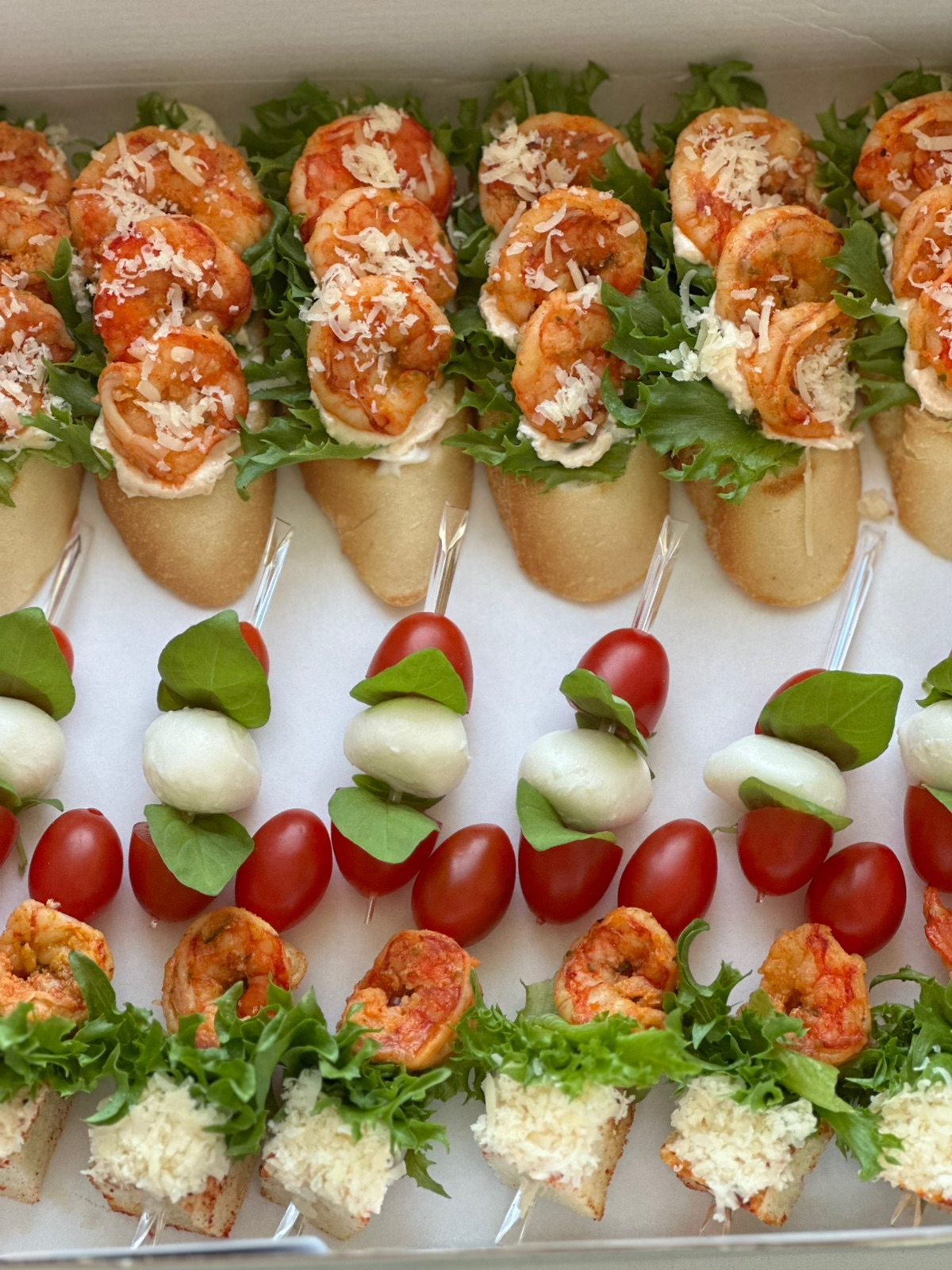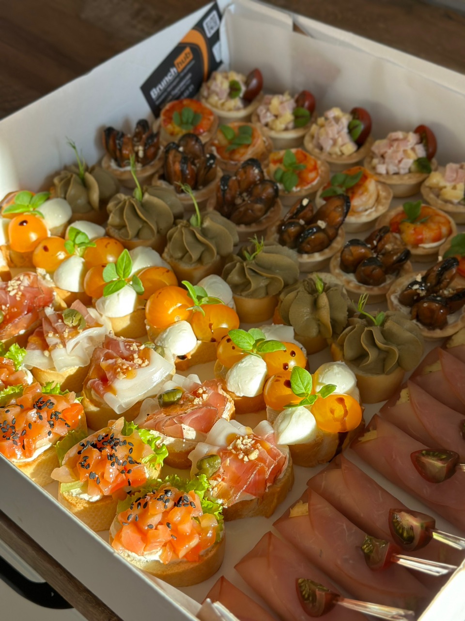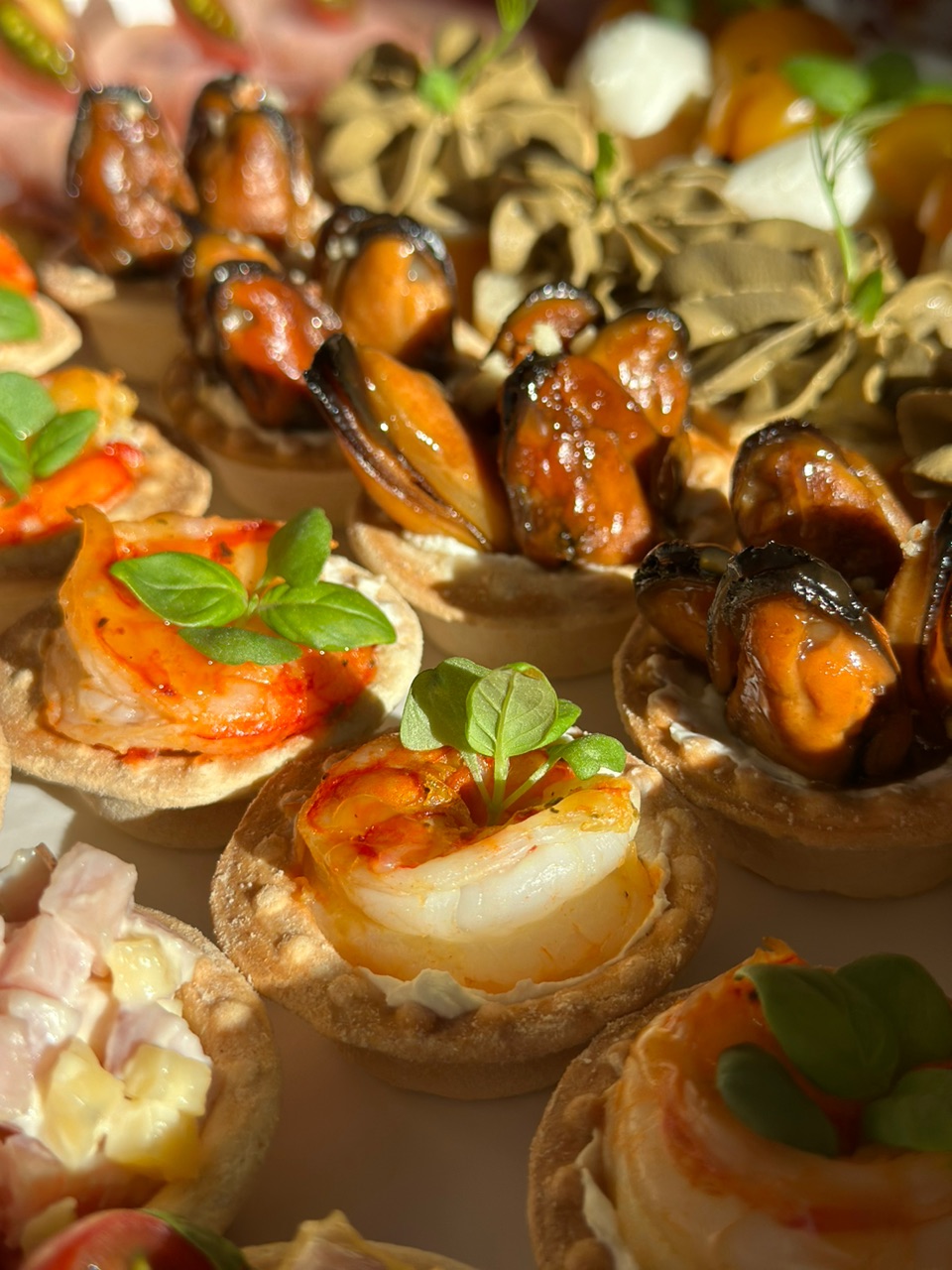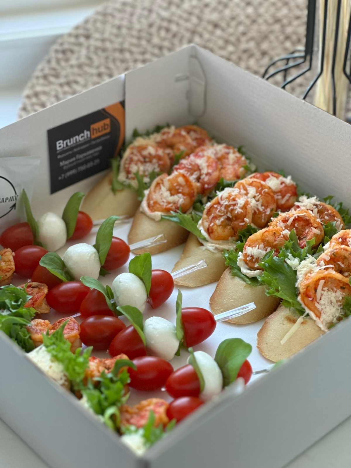 Тарталетки с икрой 7 шт; Тарталетки с аргентинской креветкой 7 шт; Кростини с хамоном 5 шт; Кростини с креветкой 5 шт; Кростини с форелью 5 шт; Сыр бри 6 шт.