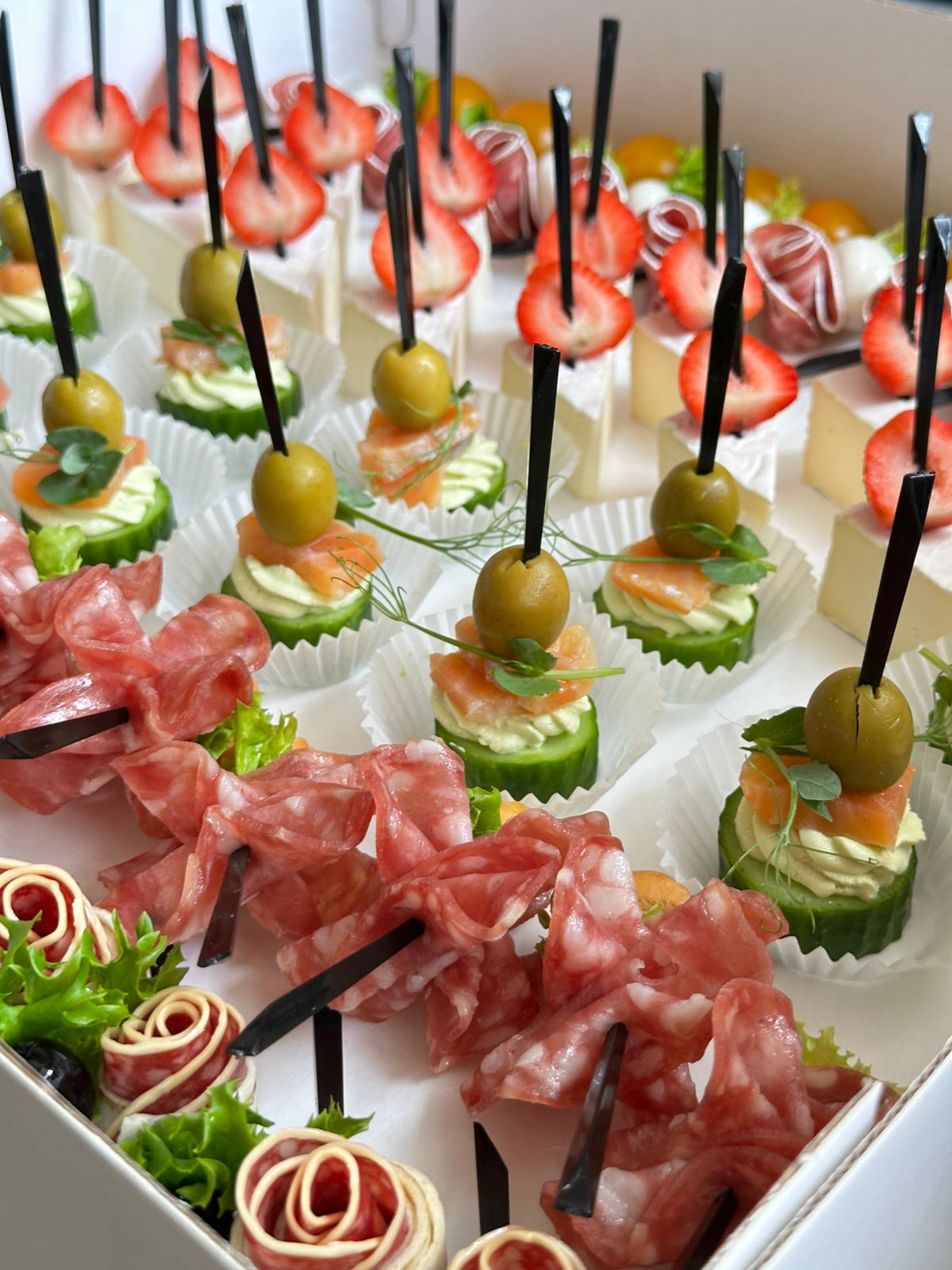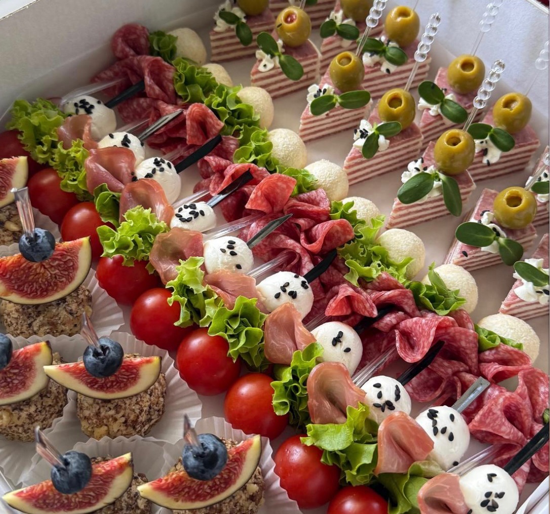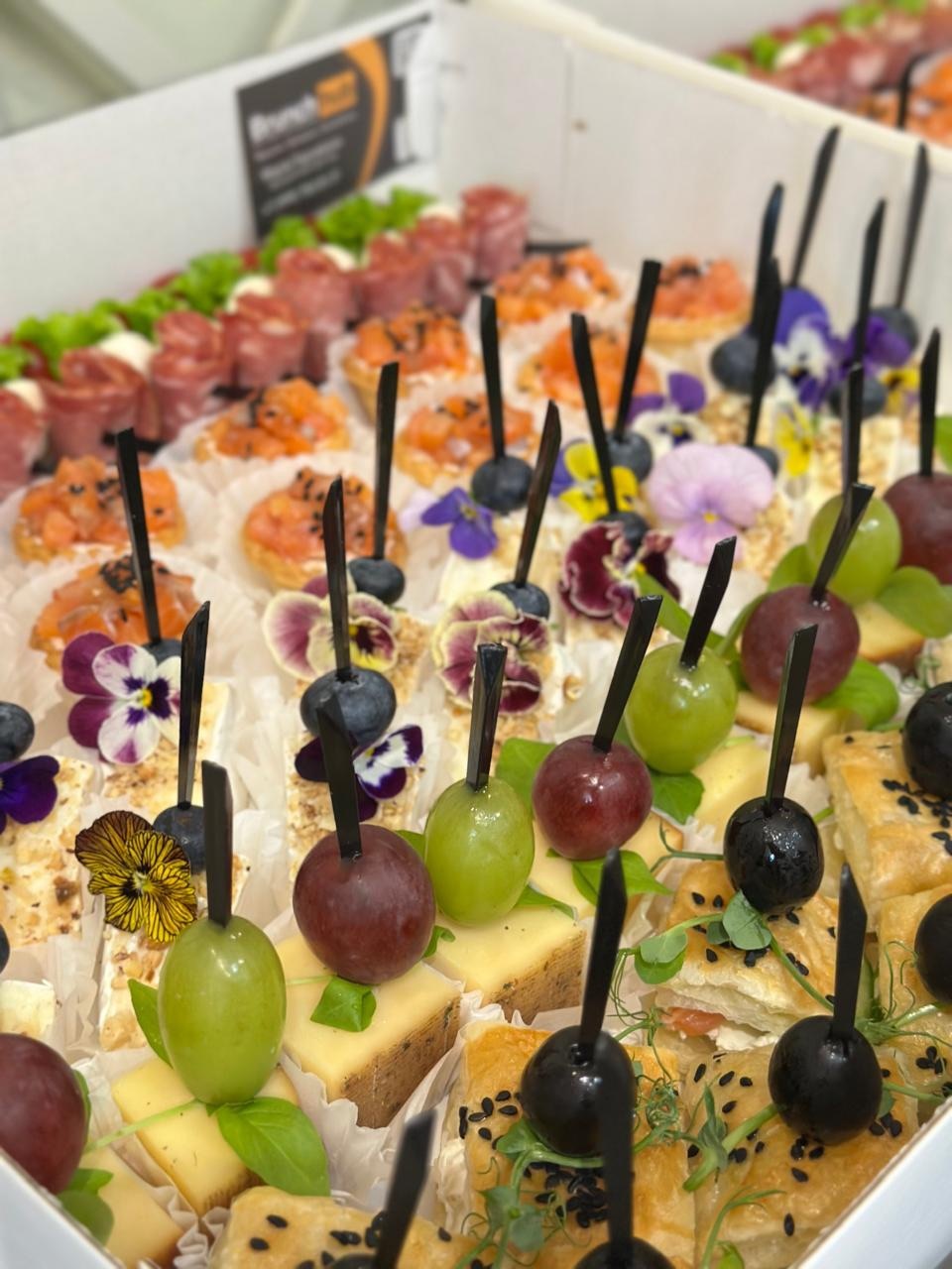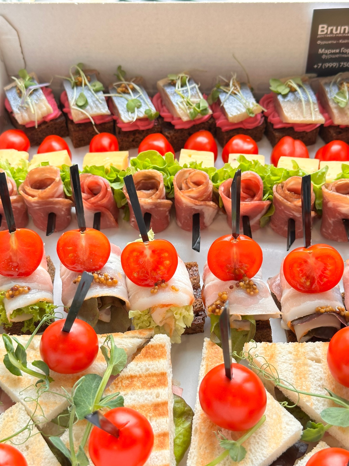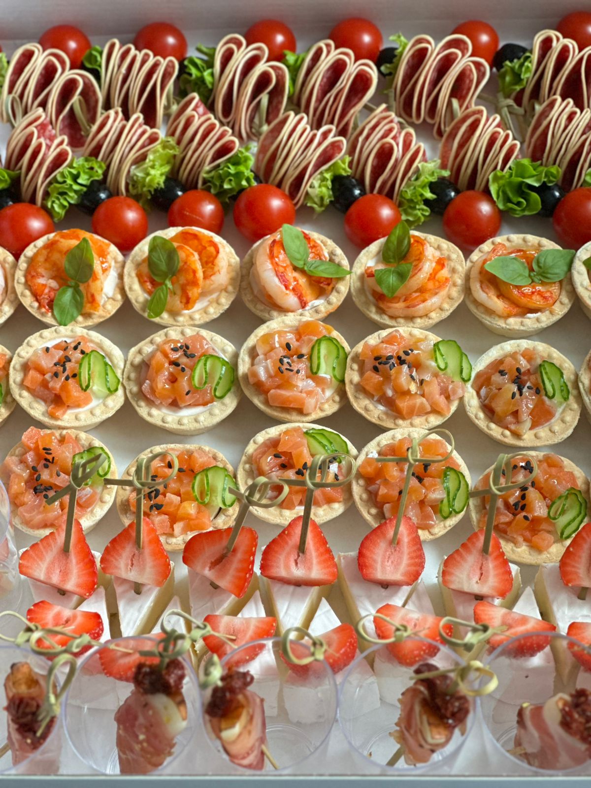 Канапе-клаб с форелью и огурчиком 12 шт; Тарталетки с форелью 12 шт; Канапе с моцареллой, черри и мясным деликатесом с зеленью 12 шт; Камамбер с орехами и сезонной ягодой 16 шт; Сыр с виноградом 12 шт.