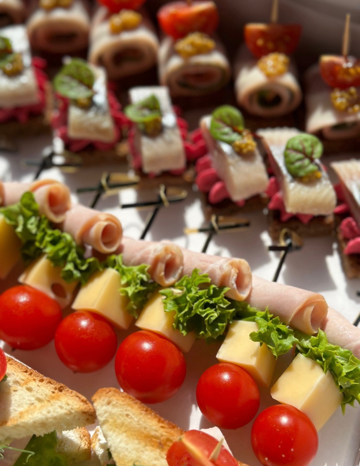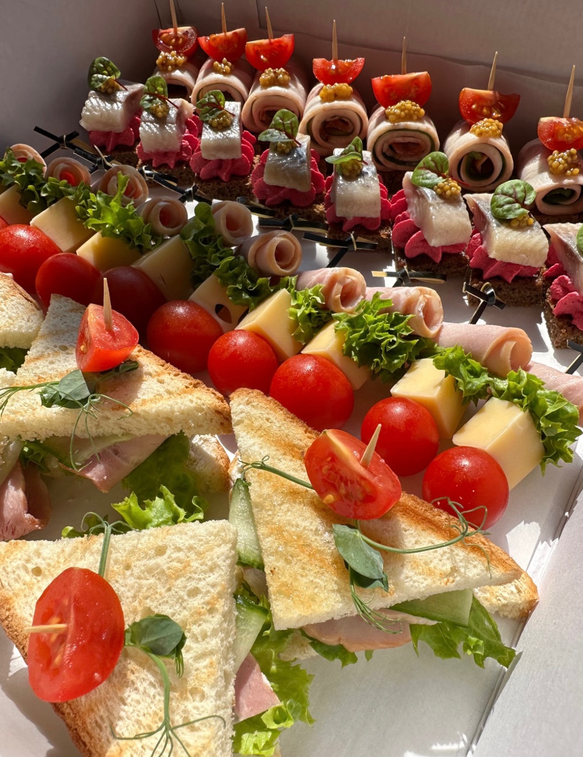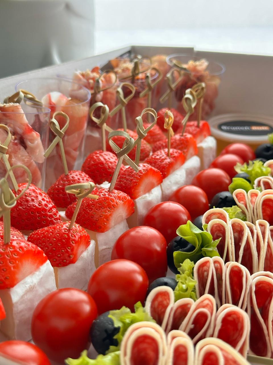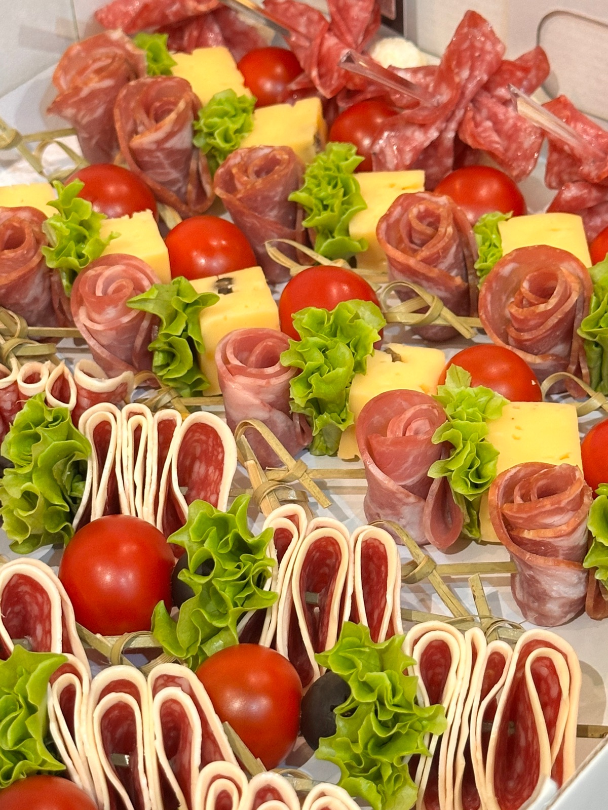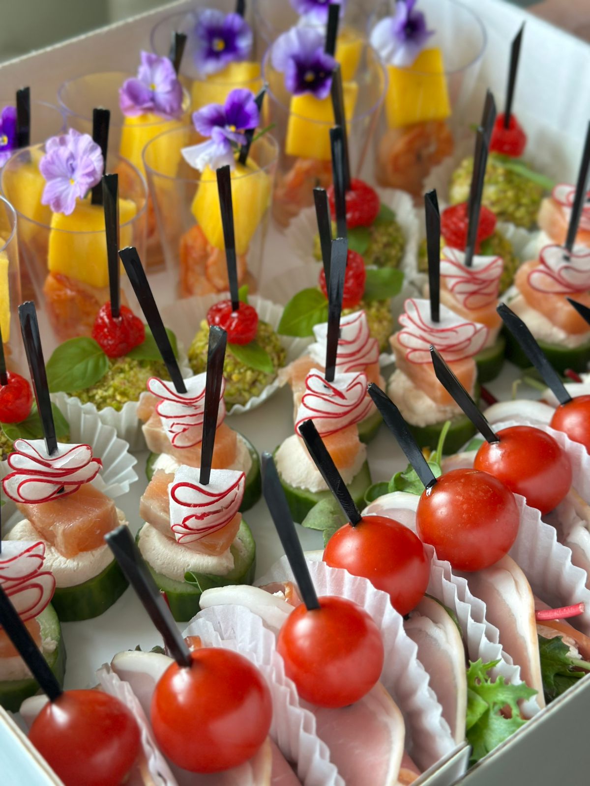 Канапе-клаб с форелью и огурчиком 12 шт; Тарталетки с форелью 12 шт; Канапе с моцареллой, черри и мясным деликатесом с зеленью 12 шт; Камамбер с орехами и сезонной ягодой 16 шт; Сыр с виноградом 12 шт.