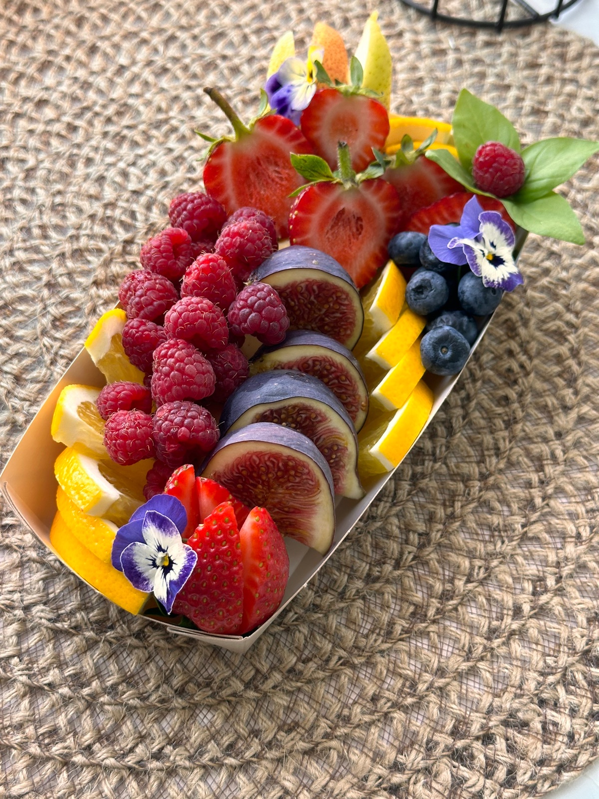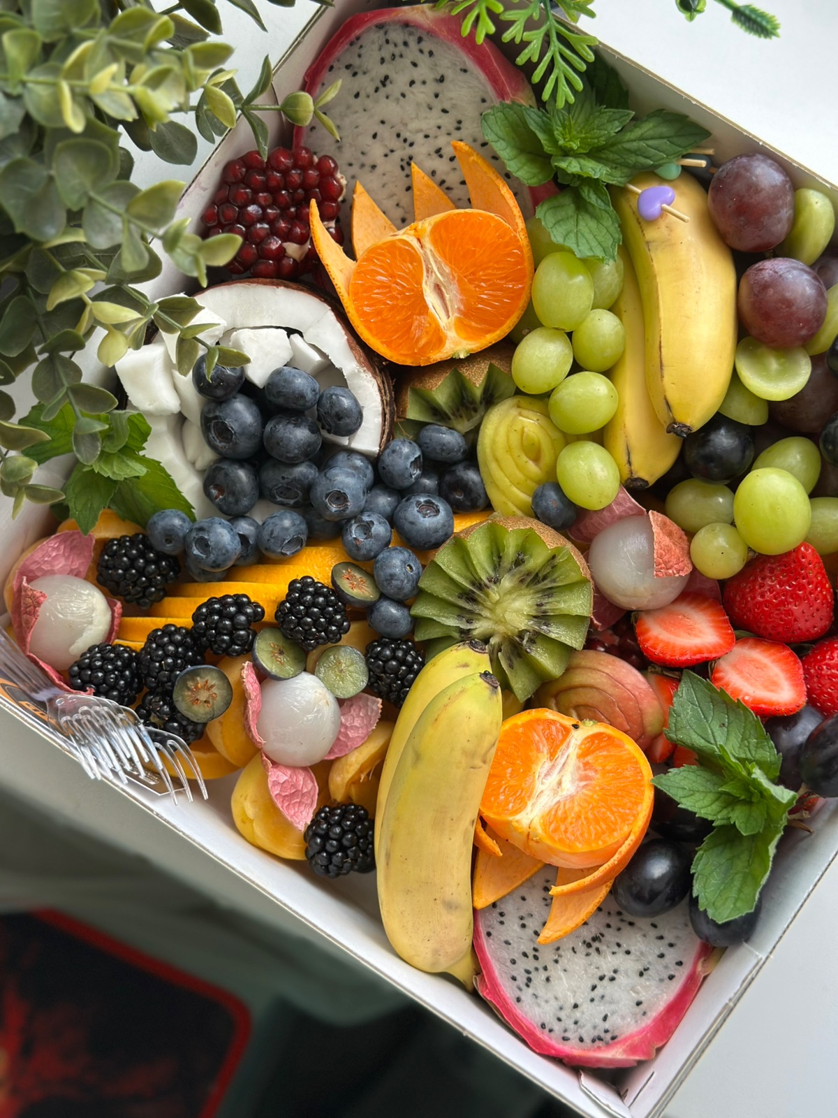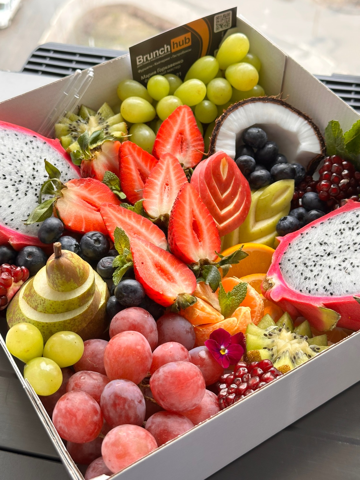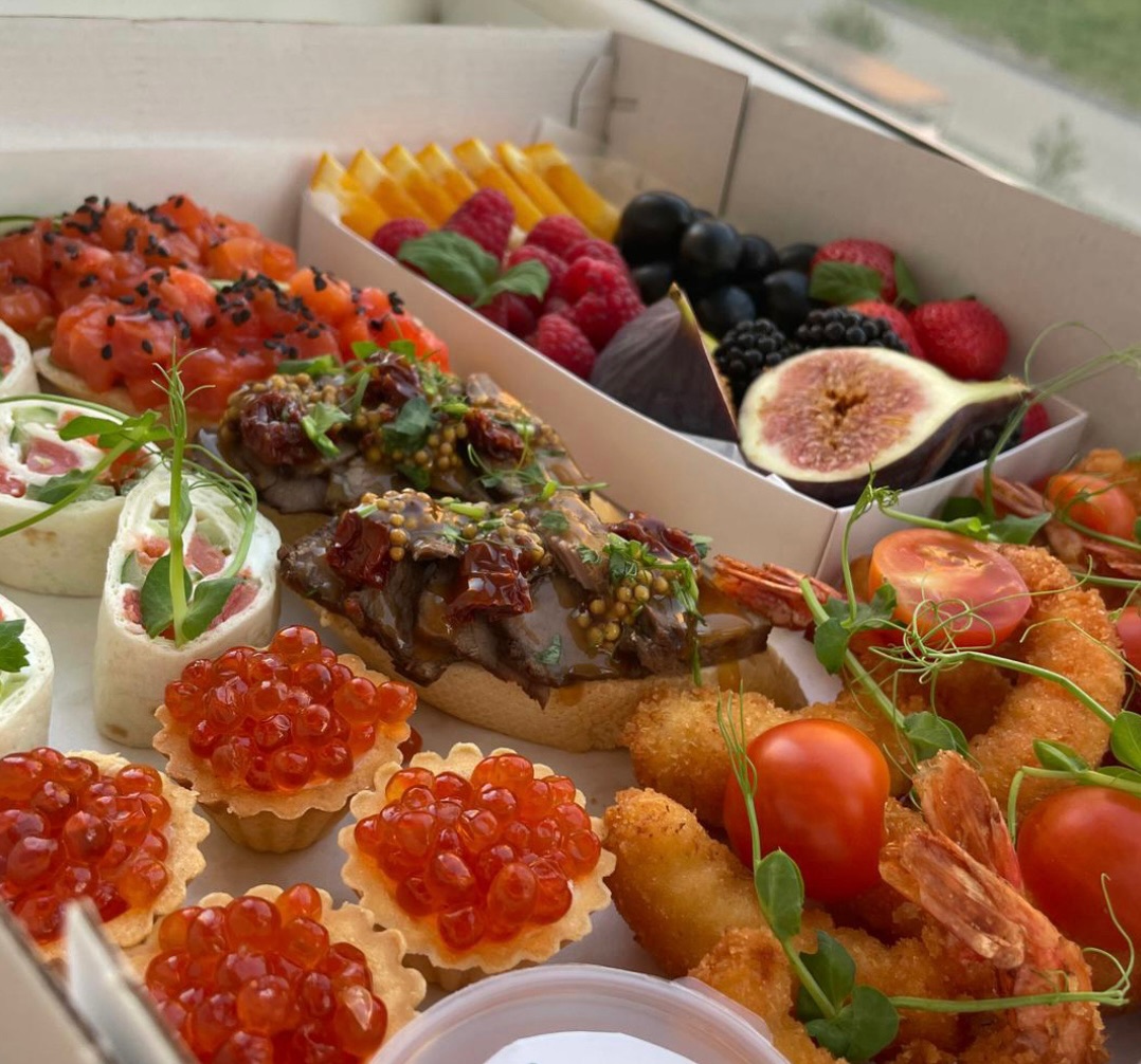 Брускетты с говядиной и вялеными томатами-2 шт; Брускетты с форелью и огурчиком -2 шт; Рулеты с форелью и огурчиком -8шт; Тарталетки с икрой -4 шт; Креветки панко +соус -8 шт; Фруктовая корзина -1 шт.