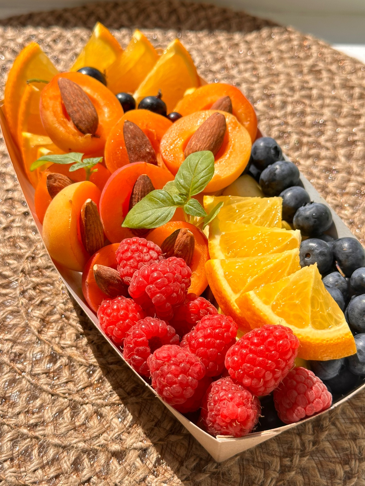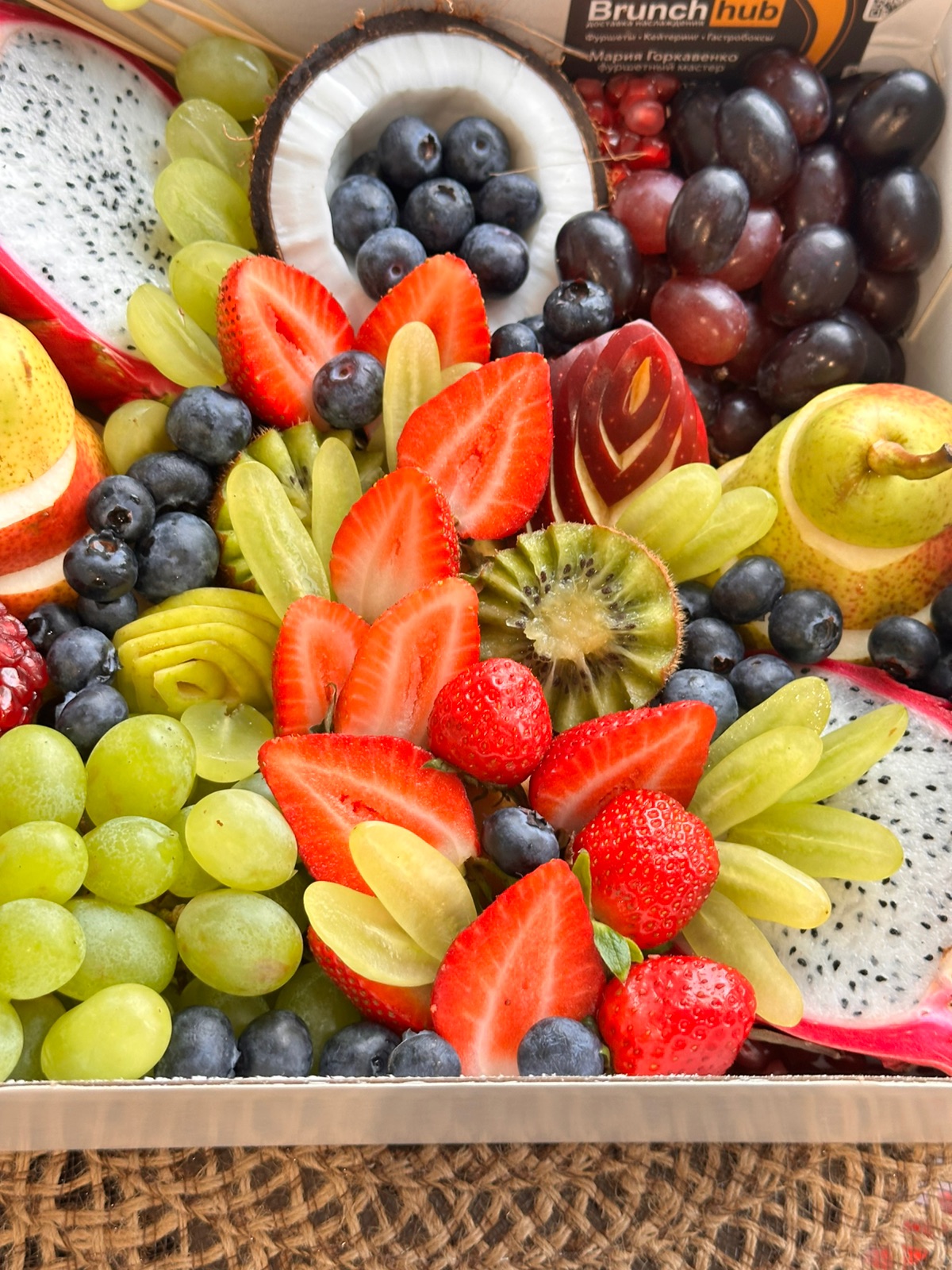 Нарядный, большой набор 30*30 разнообразных закусок: Шесть видов сыра Пять видов мясных деликатесов Сезонные ягоды и фрукты Помидорчики черри Снеки Орехи Соус Шпажки на компанию