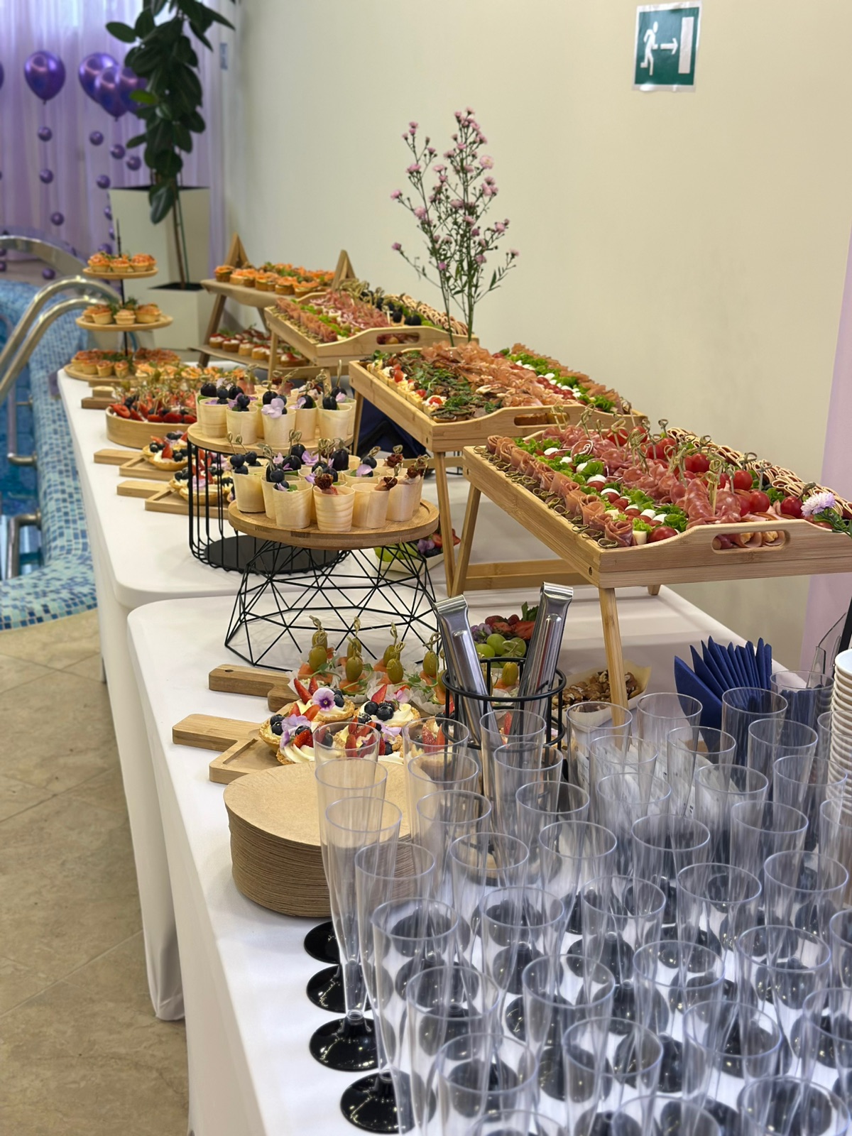 - Доставка по городу (+населенный пункт рассчитывается отдельно) - Фуршетная посуда - Скатерть - Стол - Декор цветами и вазами - Сервировка и выкладка закусок - Уборка - Салфетки бумажные/влажные - Забор инвентаря после мероприятия