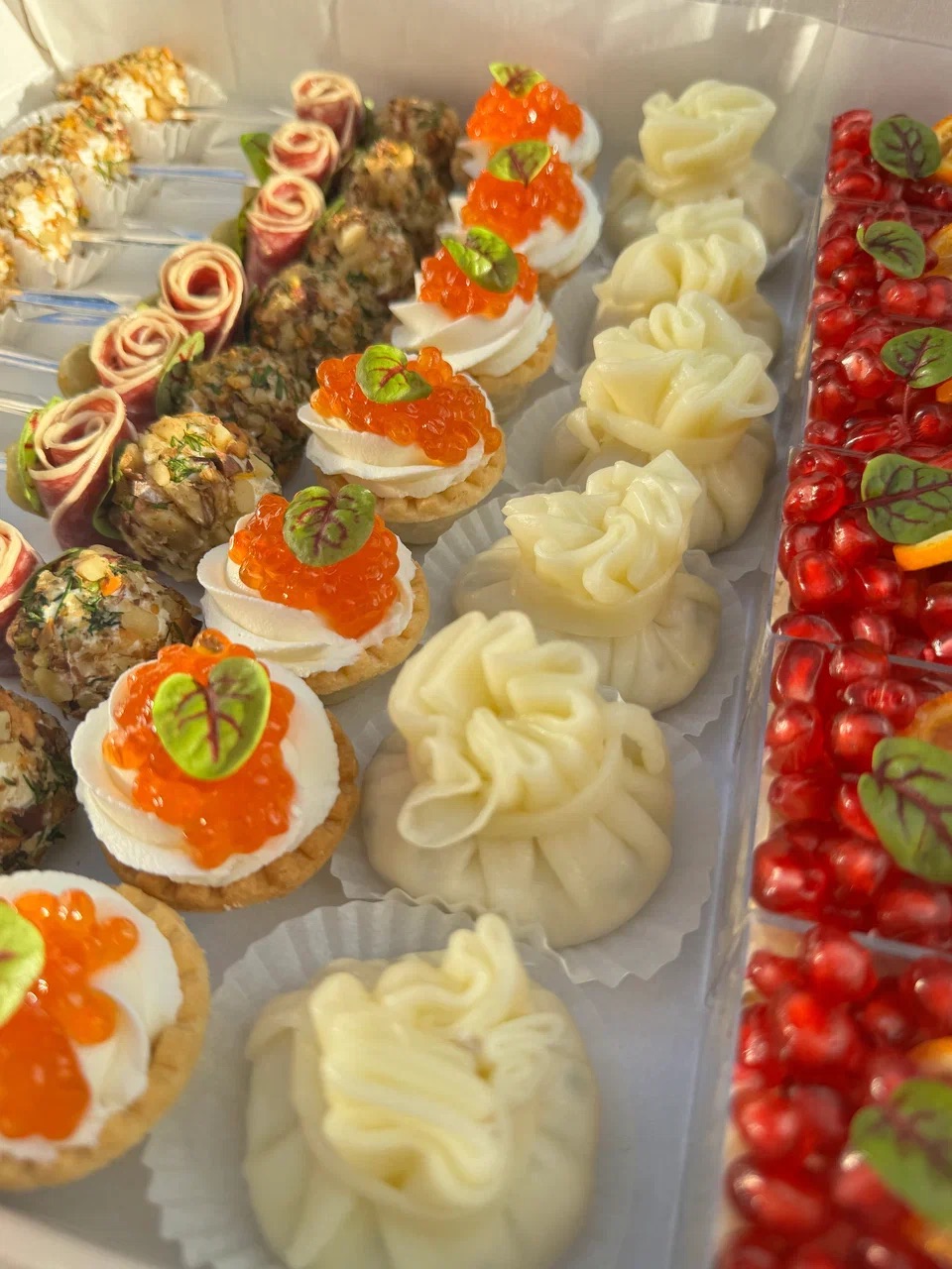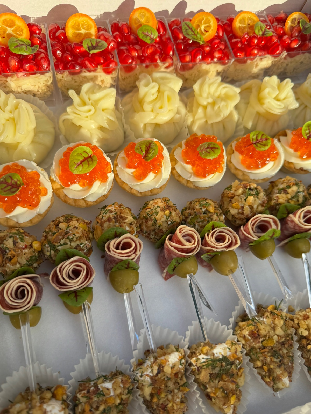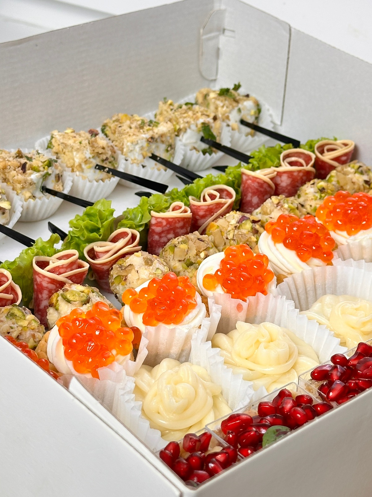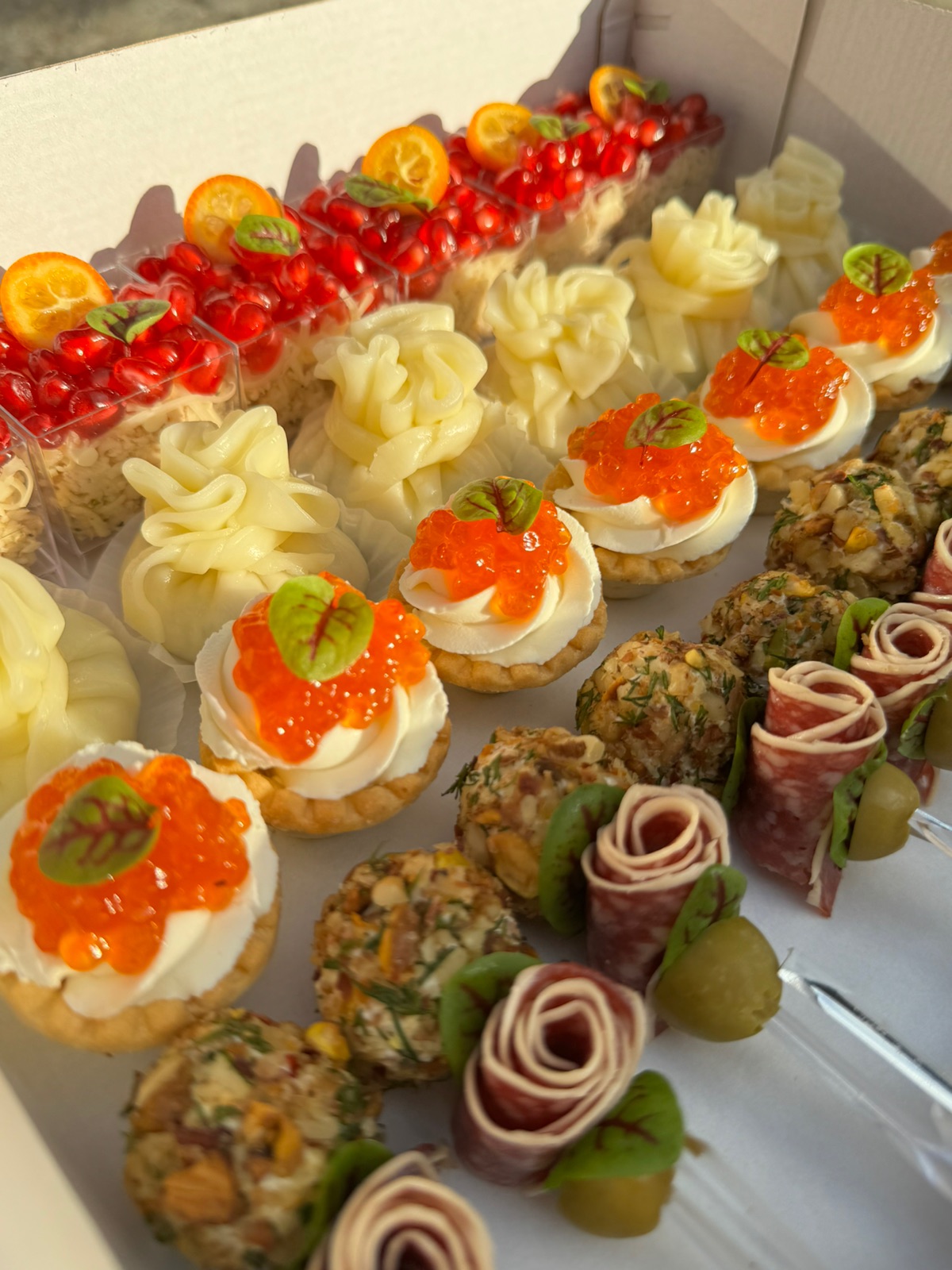 12 корзиночек фило с жюльеном, под щедрой шапкой сыра; 12 канапе огурчик с форелью; 12 канапе обожженный сальчисон с сырным шариком; 12 канапе с балыком, сыром и черри