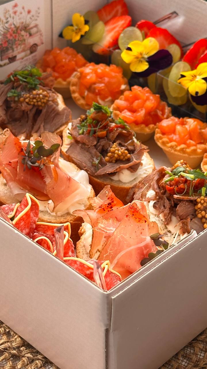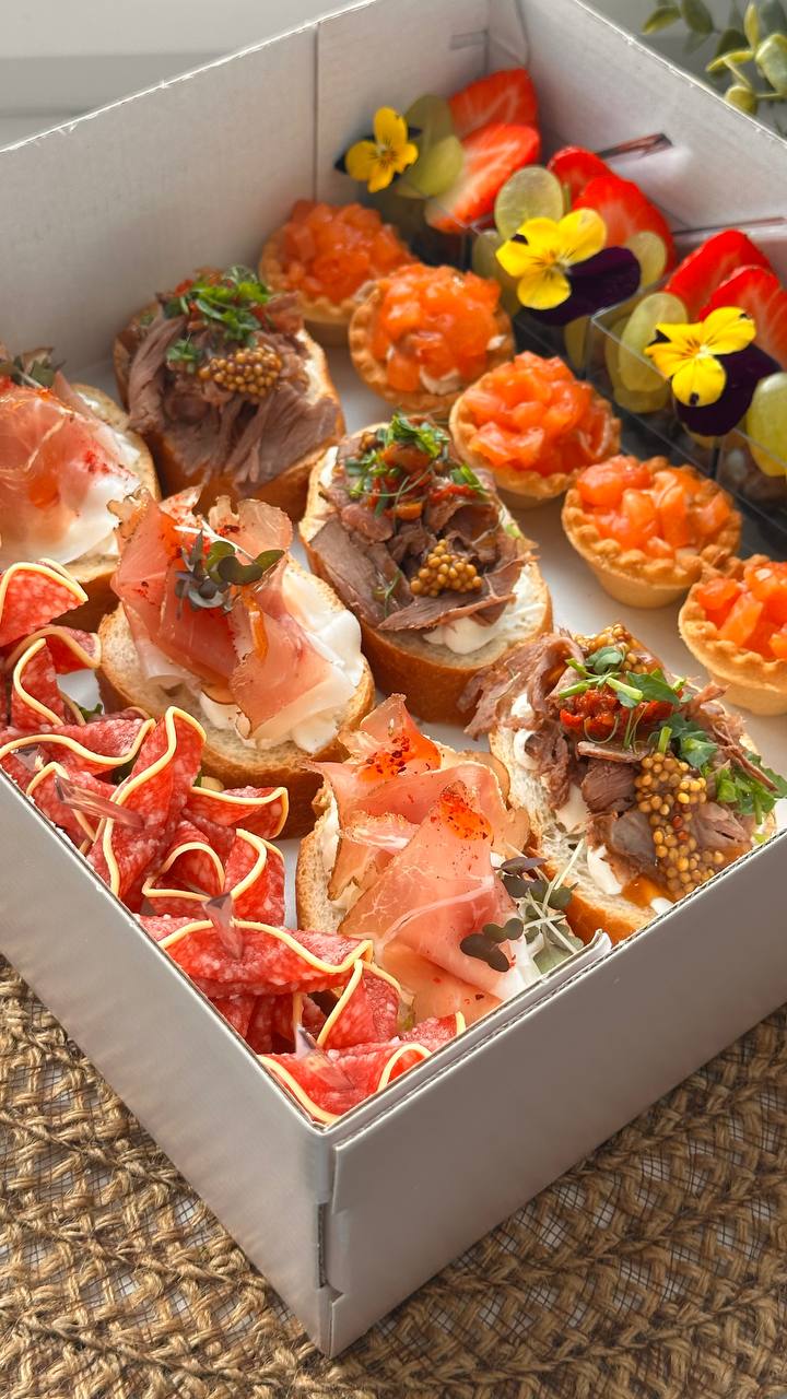 Брускетта с говядиной - 6 шт; Брускетта с форелью и огурчиком -6 шт; Канапе салями с сыром и перлине - 6 шт; Канапе огурчик с форелью и оливкой -7 шт; Кростини с аргентинскими креветками- 5 шт; Кростини с форелью- 5 шт; Кростини с камамбером и сезонной ягодой или фруктом - 5 шт; Кростини с говядиной, вялеными томатами и горчичкой -5 шт; Кростини с карбонадом и черри- 5 шт; Камамбер с сезонной ягодой или фруктом- 8 шт; Твердый сыр с виноградом - 6 шт; Мини сендвич с форелью и огурчиком - 6 шт; Канапе с с/в шеей, черри и моцареллой -6 шт; Тарталетки с форелью -6 шт.