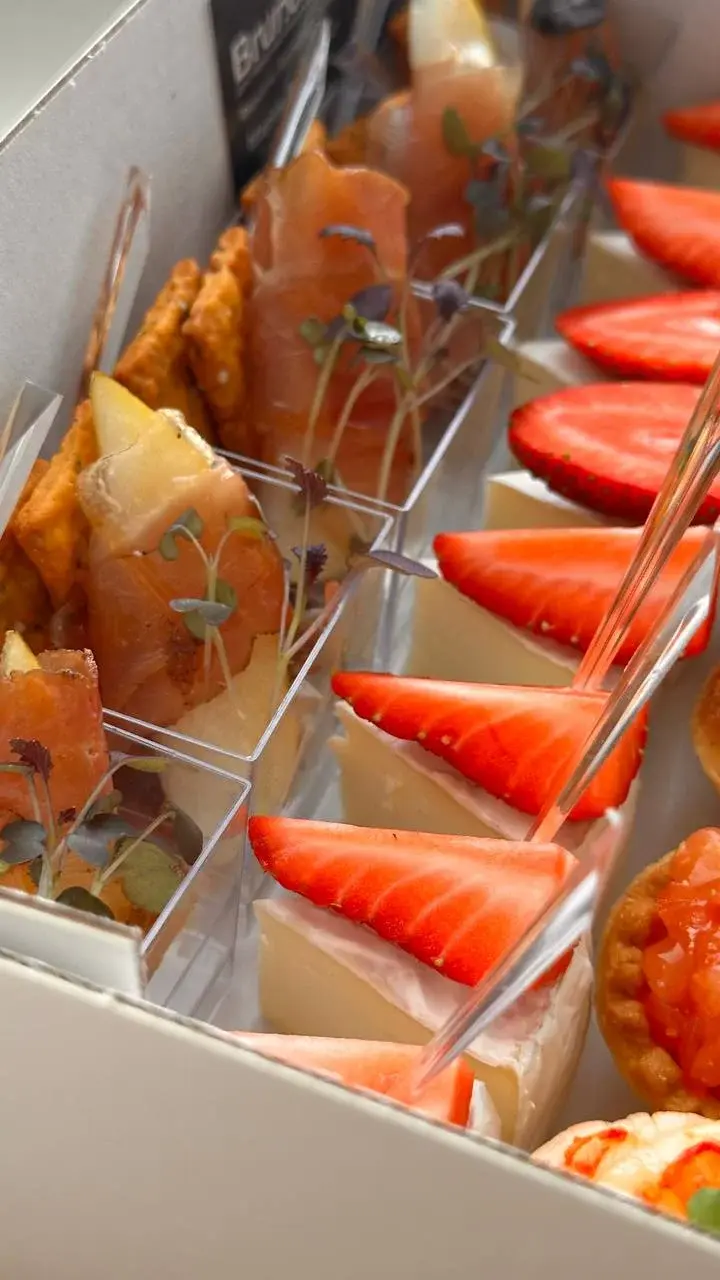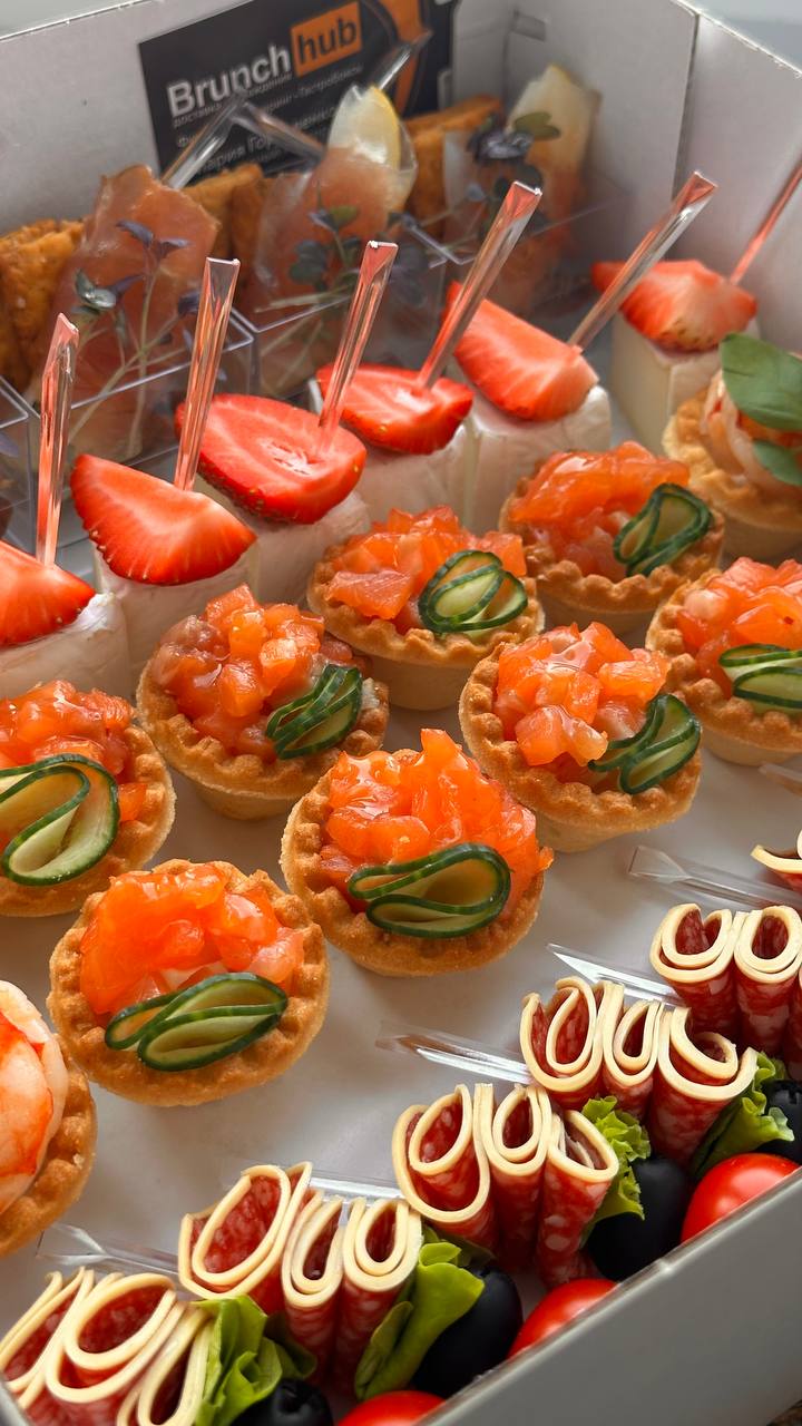 • мини сэндвич с форелью 6 шт. • Тарталетки с крем чиз и лососем 6 шт. • Сыр камамбер с сезонной ягодой 8 шт. • Канапе балык, черри и моцарелла 6 шт. • Твердый сыр с виноградом 6 шт.